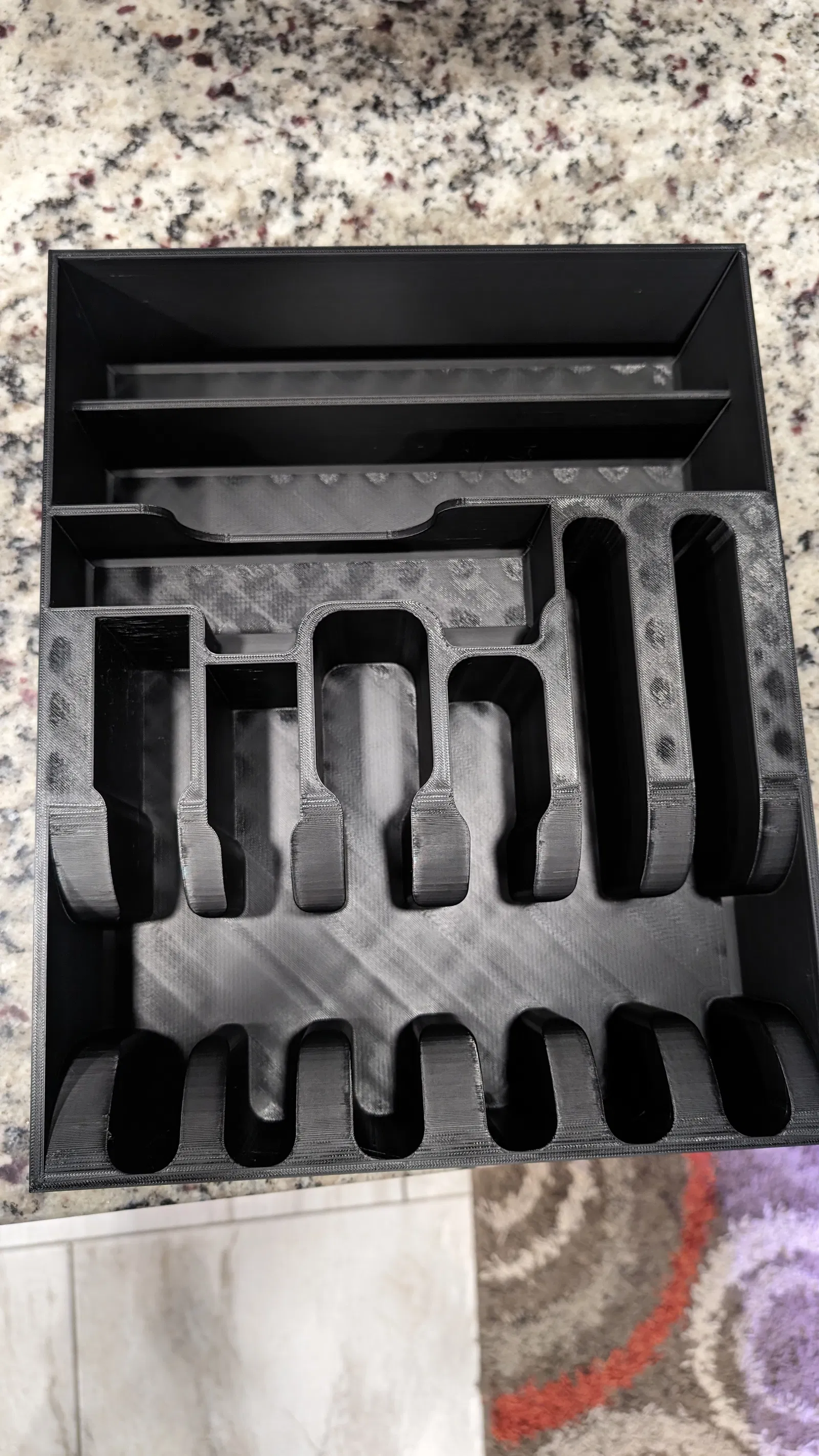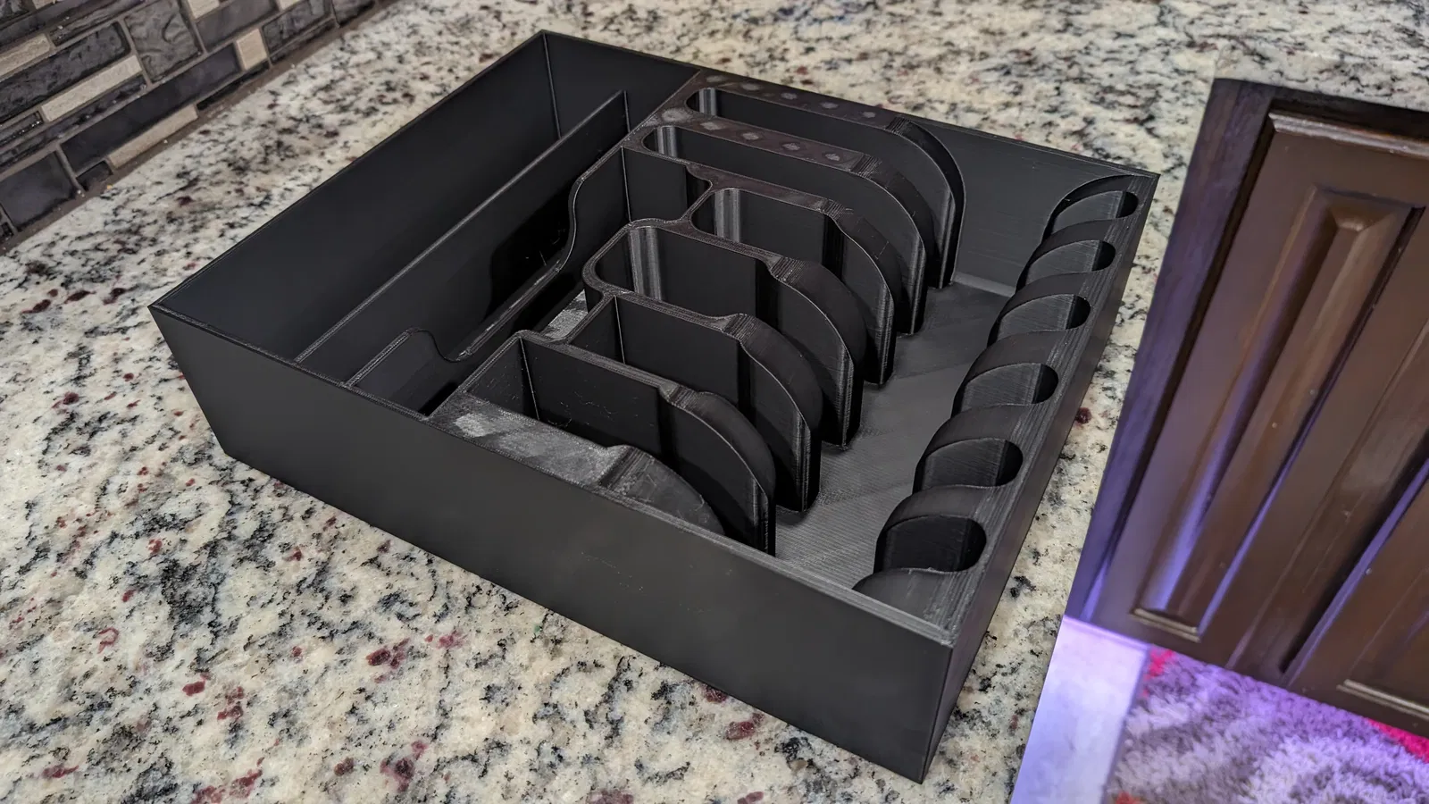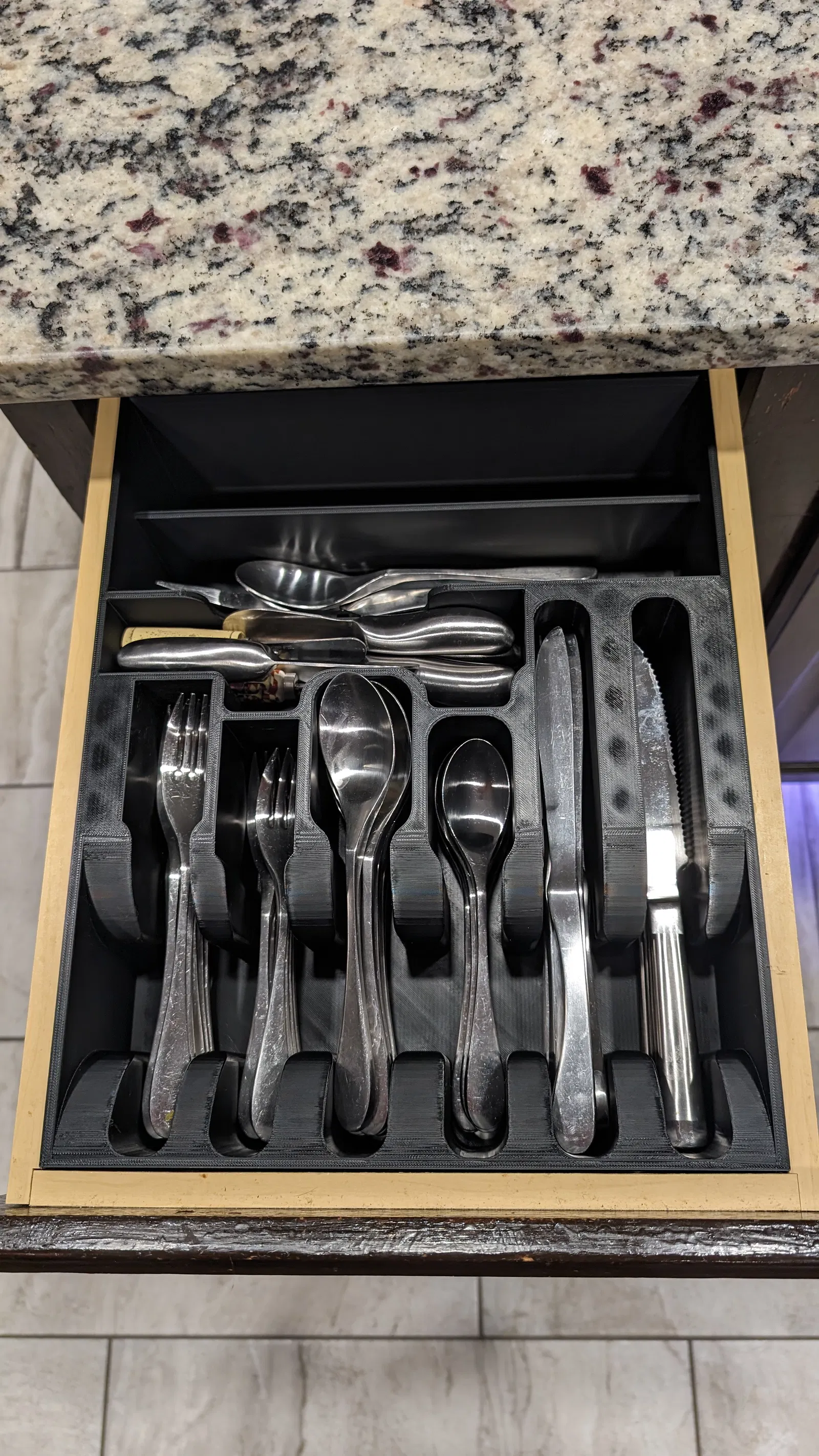Khay Đựng Dao Dĩa được thiết kế cho Bộ Dao Dĩa LIANYU nhưng hoạt động tốt với hầu hết các bộ dao dĩa khác. Sản phẩm được làm để in trên máy Prusa XL do kích thước.