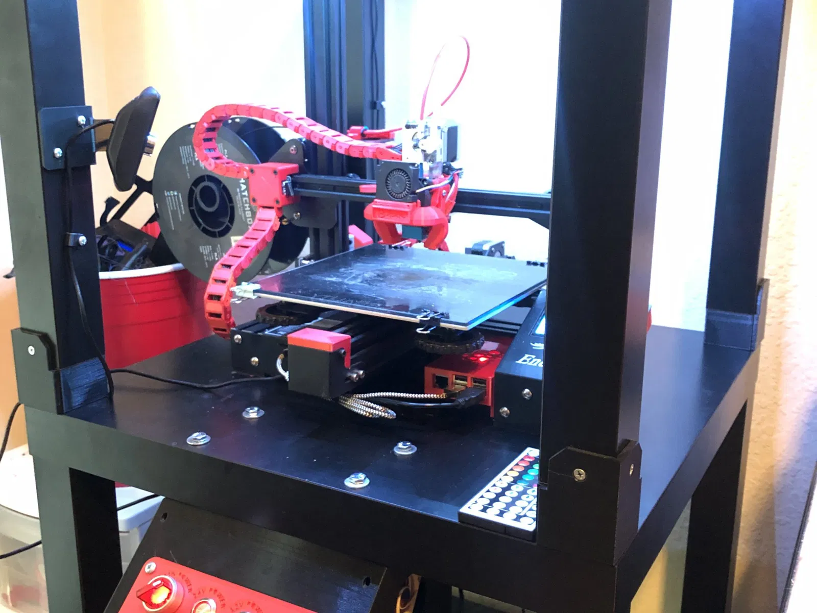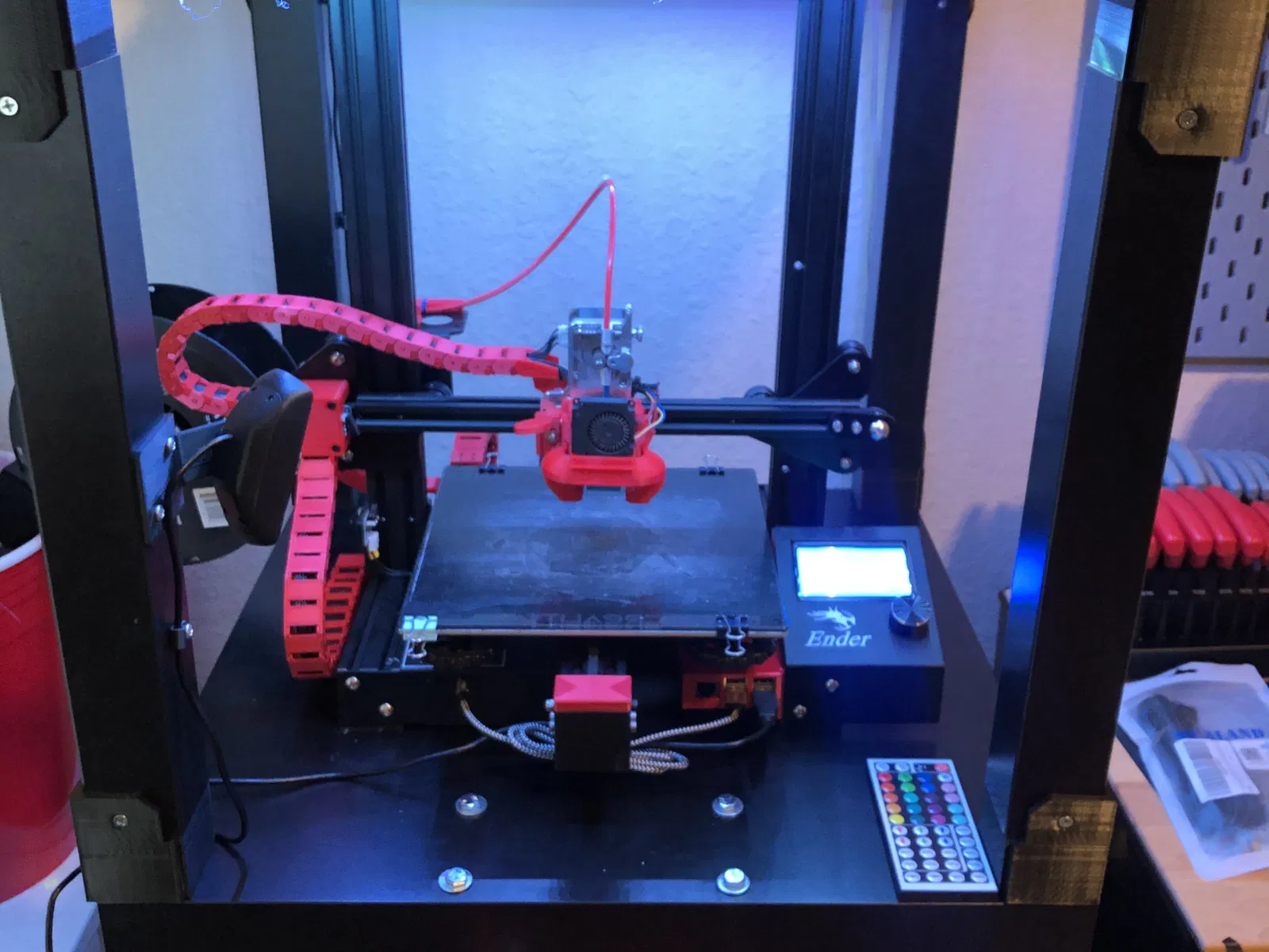 Tôi muốn một cách rẻ tiền để chiếu sáng tốt hơn cho vỏ Lack, vì vậy Lack Light ra đời. Cần bốn đoạn thẳng, 3 góc, 1 phích cắm góc và một vài vít gỗ. Bề mặt lắp đặt được nghiêng để đèn led chiếu sáng khoảng 3 inch trên bề mặt của bàn Lack bên dưới. Tôi đã sử dụng đèn led dây tiêu chuẩn từ Amazon và dẫn cáp xuống chân sau và sau đó dưới bàn dưới. Các đường cong không hoàn hảo cho đèn dây, vì vậy keo nóng đã được sử dụng để “hàn điểm” đèn dây vào khung.