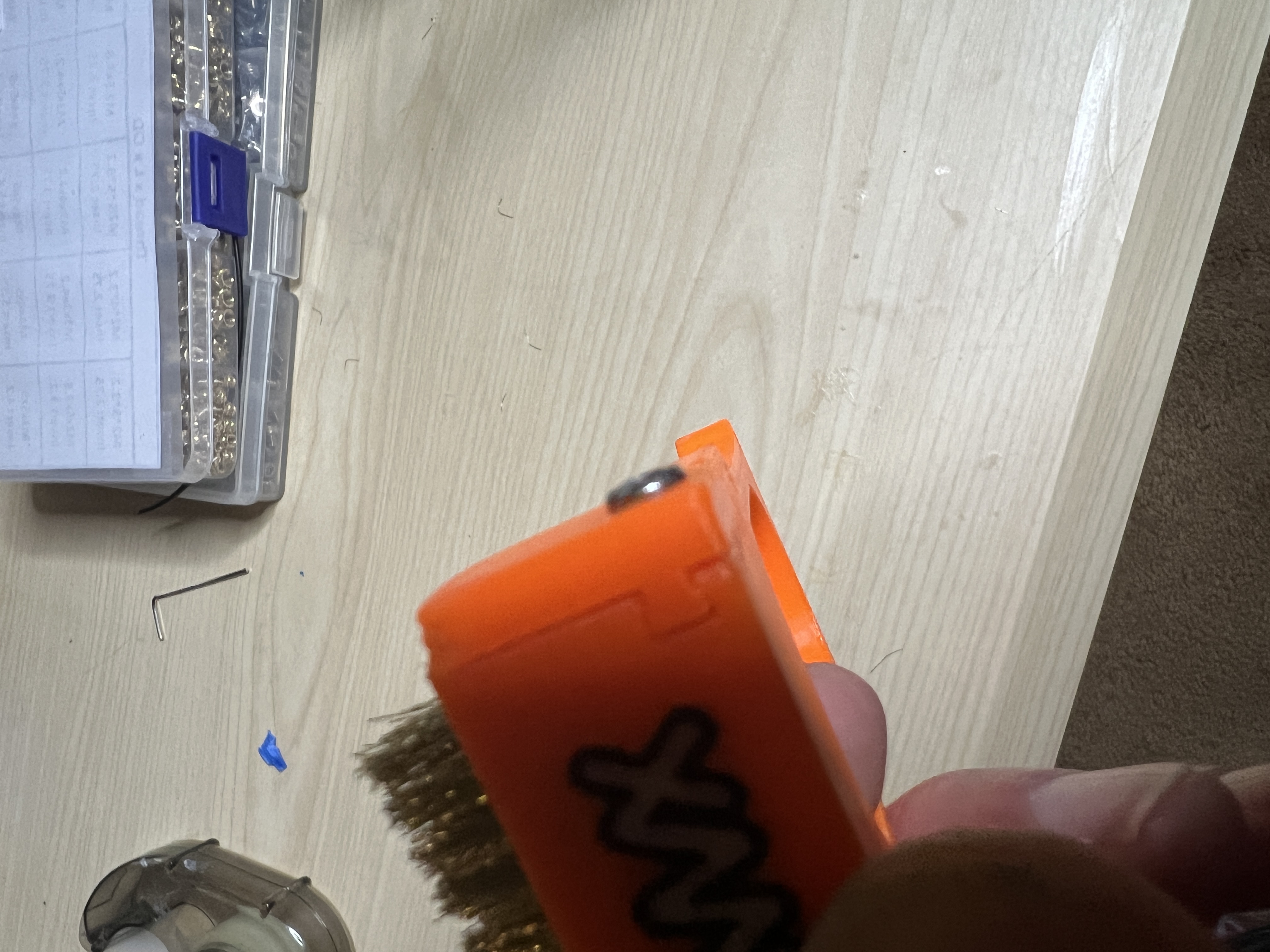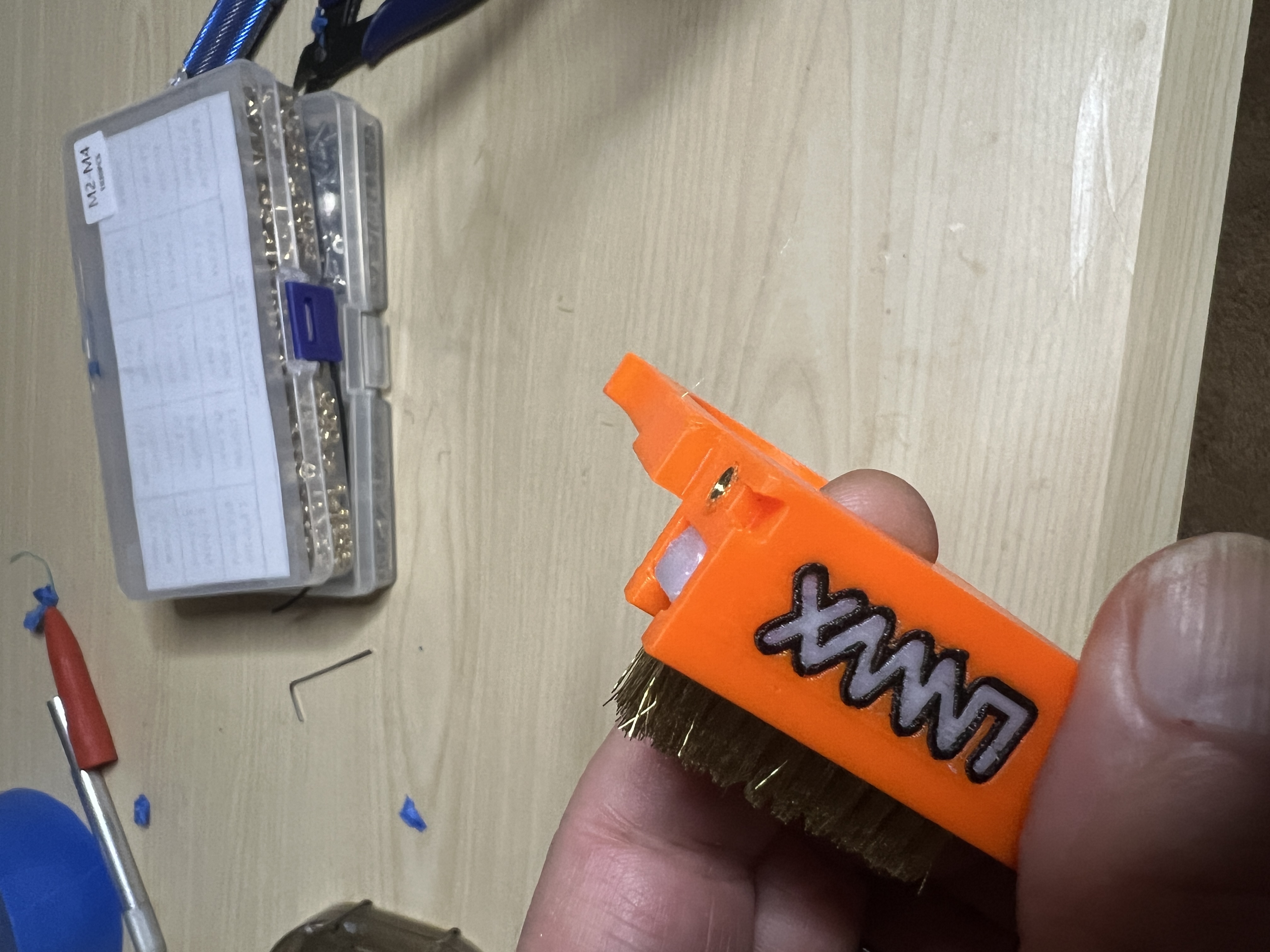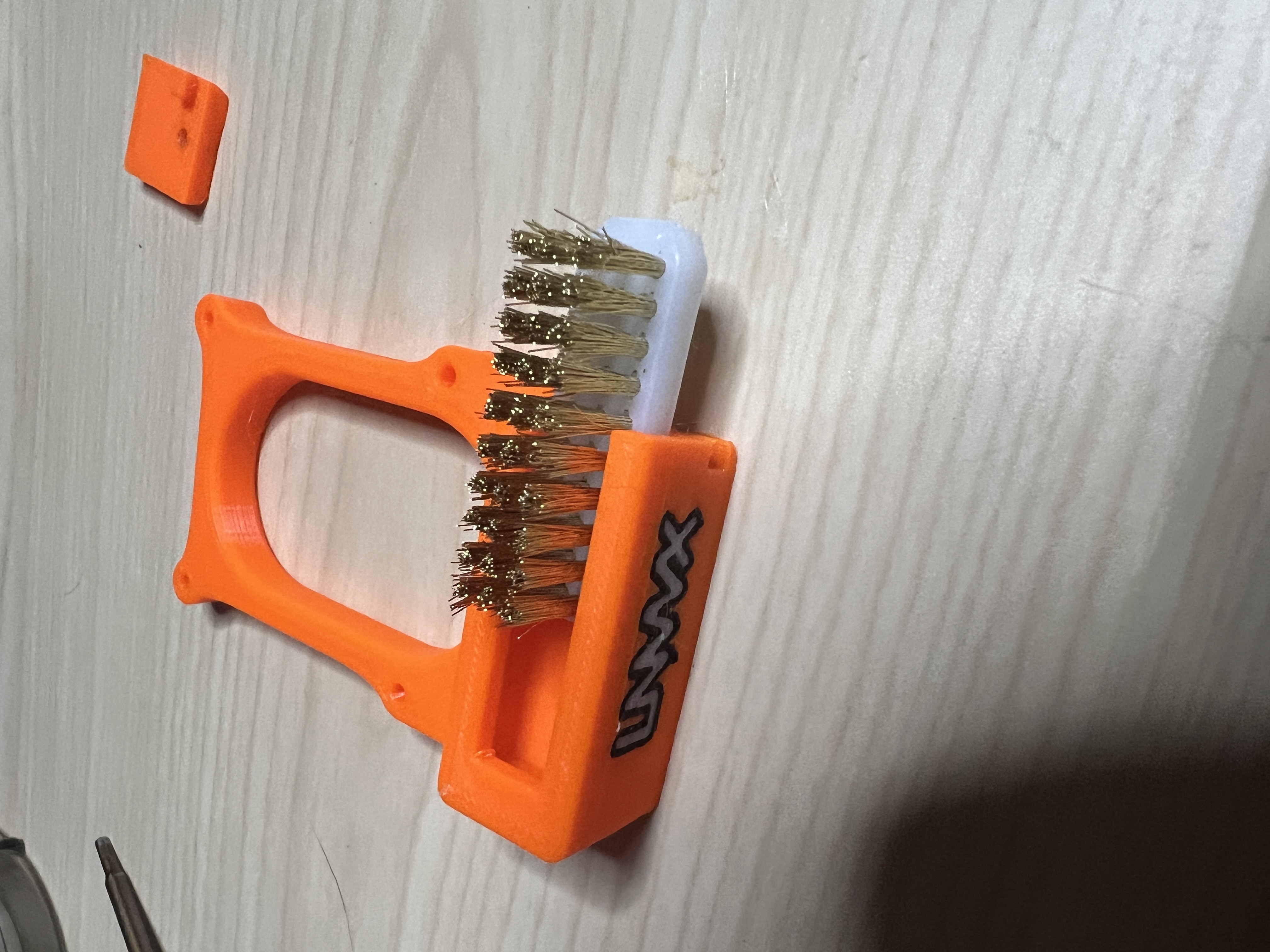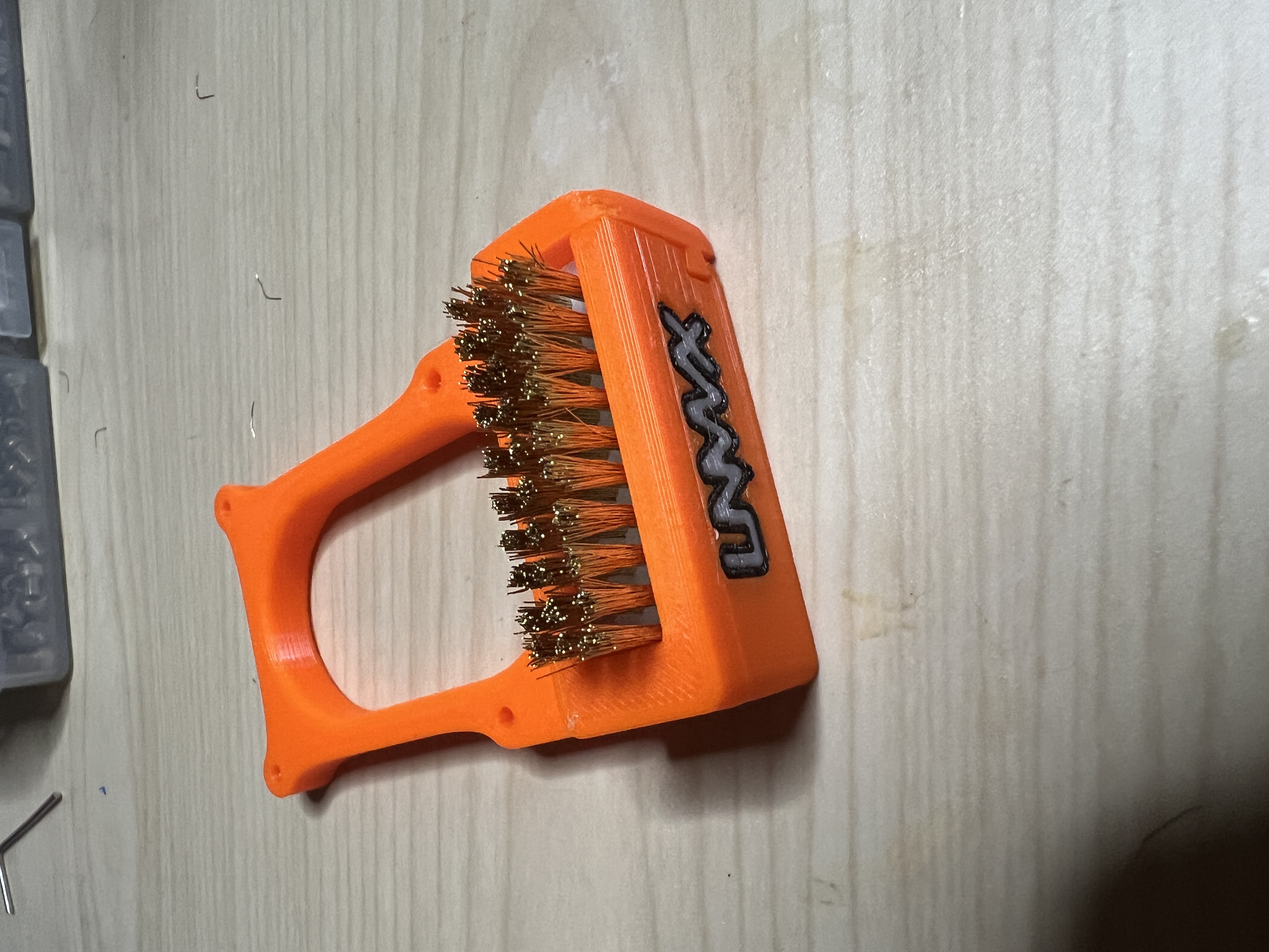 Đây là một thay đổi nhỏ để bắt đầu chu trình lau ở Y-1 thay vì Y-9, về cơ bản chỉ đảo ngược thứ tự diễn ra trong TRỤC Y, vì tôi nhận thấy việc di chuyển thẳng đến Y-9 khá ồn. Việc này làm dịu bớt một chút bằng cách bắt đầu gần mép bàn và di chuyển ngược lại. Tại sao lại thêm một bàn chải vệ sinh đầu phun nữa? Tôi đã thấy nhiều biến thể về bàn chải vệ sinh đầu phun, và chúng có vẻ hợp lý, tuy nhiên chúng cũng có xu hướng sử dụng bàn chải mua trên Amazon, loại có thể có hôm nay và biến mất ngày mai (một vài cái đã có liên kết chết đến các bàn chải đang nói đến). Hơn nữa, bạn phải chỉnh sửa chúng để điều chỉnh chiều cao, và hầu hết sử dụng loại bàn chải bút chì nhỏ này, không có nhiều lông, và tôi không biết chúng sẽ bền như thế nào. Nếu chúng giống như các bàn chải tương tự cho Dremel của tôi, có lẽ sẽ không bền lắm. Vì tôi không biết chúng sẽ tồn tại được bao lâu, tôi cũng muốn có thể thay đổi chúng một cách dễ dàng mà không cần phải điều chỉnh lại vị trí mỗi khi cần thay thế, hoặc nếu vì lý do nào đó tôi cần tháo bộ phận lắp ráp ra, tôi muốn nó phải có vị trí không thể sai khi lắp lại. Rồi còn vấn đề về bản thân các bàn chải. Tôi muốn một bộ phận được sử dụng phổ biến, đã có sẵn và khó có thể biến mất, điều này sẽ yêu cầu phải làm lại bộ phận để điều chỉnh nó cho phù hợp với thứ khác. Vì vậy, tôi nhận thấy có hàng nghìn lượt tải về của bộ phận bàn chải đầu phun Voron với các biến thể khác nhau, và bộ phận này mà mọi người đều sử dụng có sẵn từ rất nhiều nhà cung cấp khác nhau, và hơn nữa chúng lại rất rẻ (khoảng 1,50 đô la một chiếc hoặc 5,50 đô la cho một gói 5 chiếc). Trông nó như thế này: