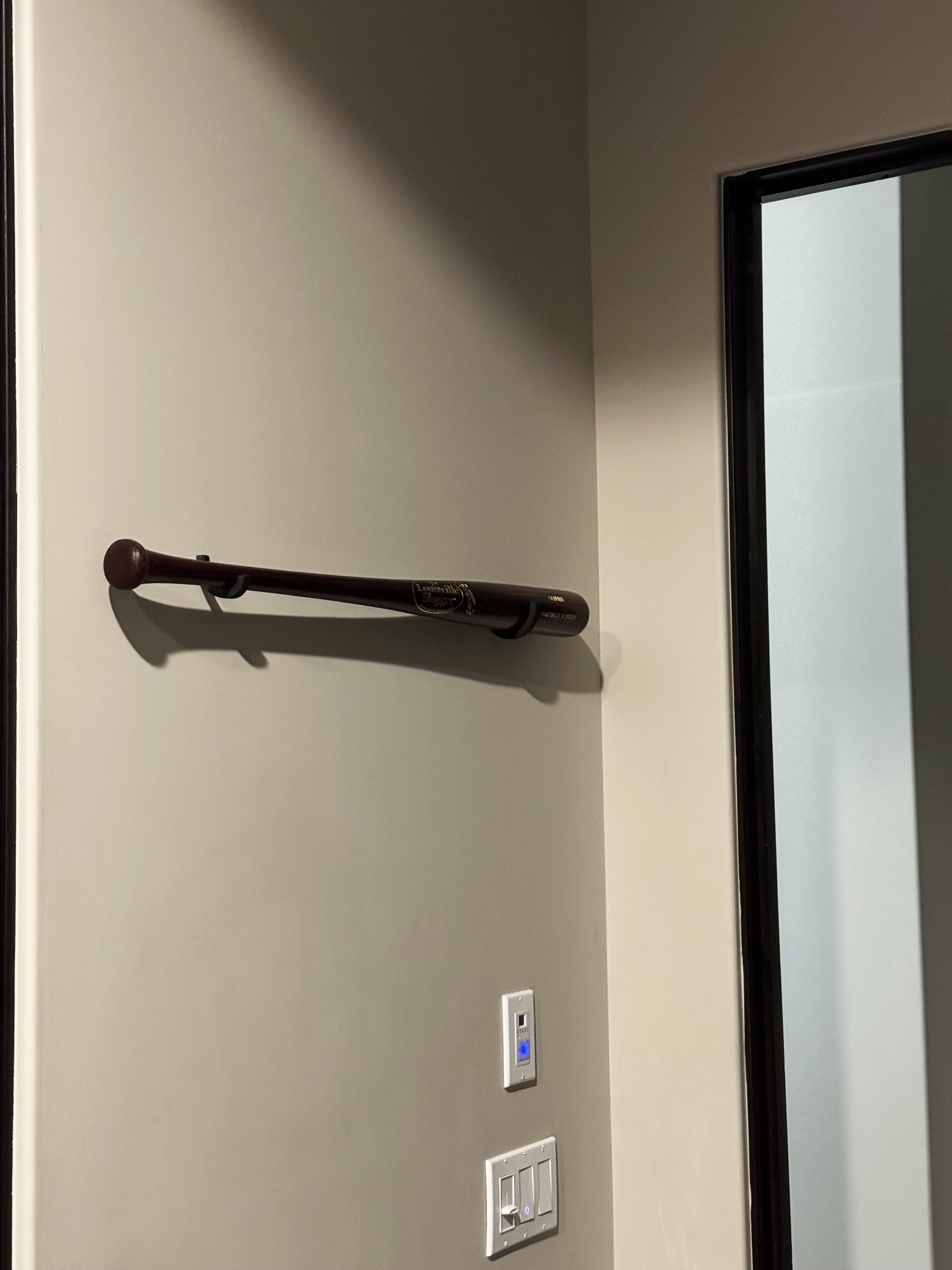 Giá đỡ gậy bóng chày tối giản và nằm ngang. Bao gồm một bộ phận hỗ trợ cho cán và cho phần đầu gậy cho gậy có đường kính 2 5/8 inch. Thiết kế được làm dựa trên một cây gậy gỗ Louisville Slugger. Thiết kế có lỗ khoét để bắt hai vít nở tường và nên giữ gậy chắc chắn, nằm ngang đều với tường.
