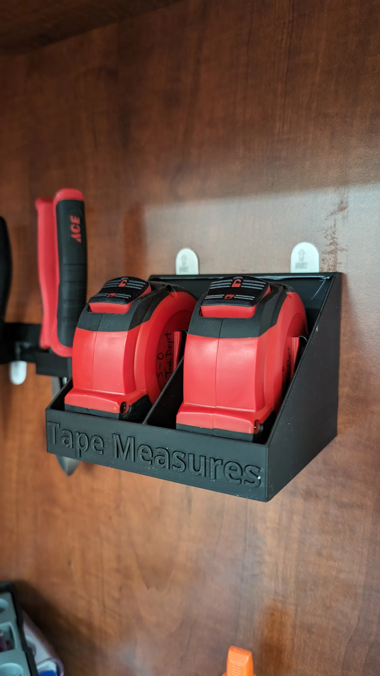 Đây là mấy cái khay đựng đồ nghề cho mấy món đồ điện tử tui để trên bàn làm việc nè. Gắn bằng miếng dán Command Strips. Mỗi cái đều có dán nhãn để khi ai đó mượn đồ nghề, họ biết chỗ trả lại.