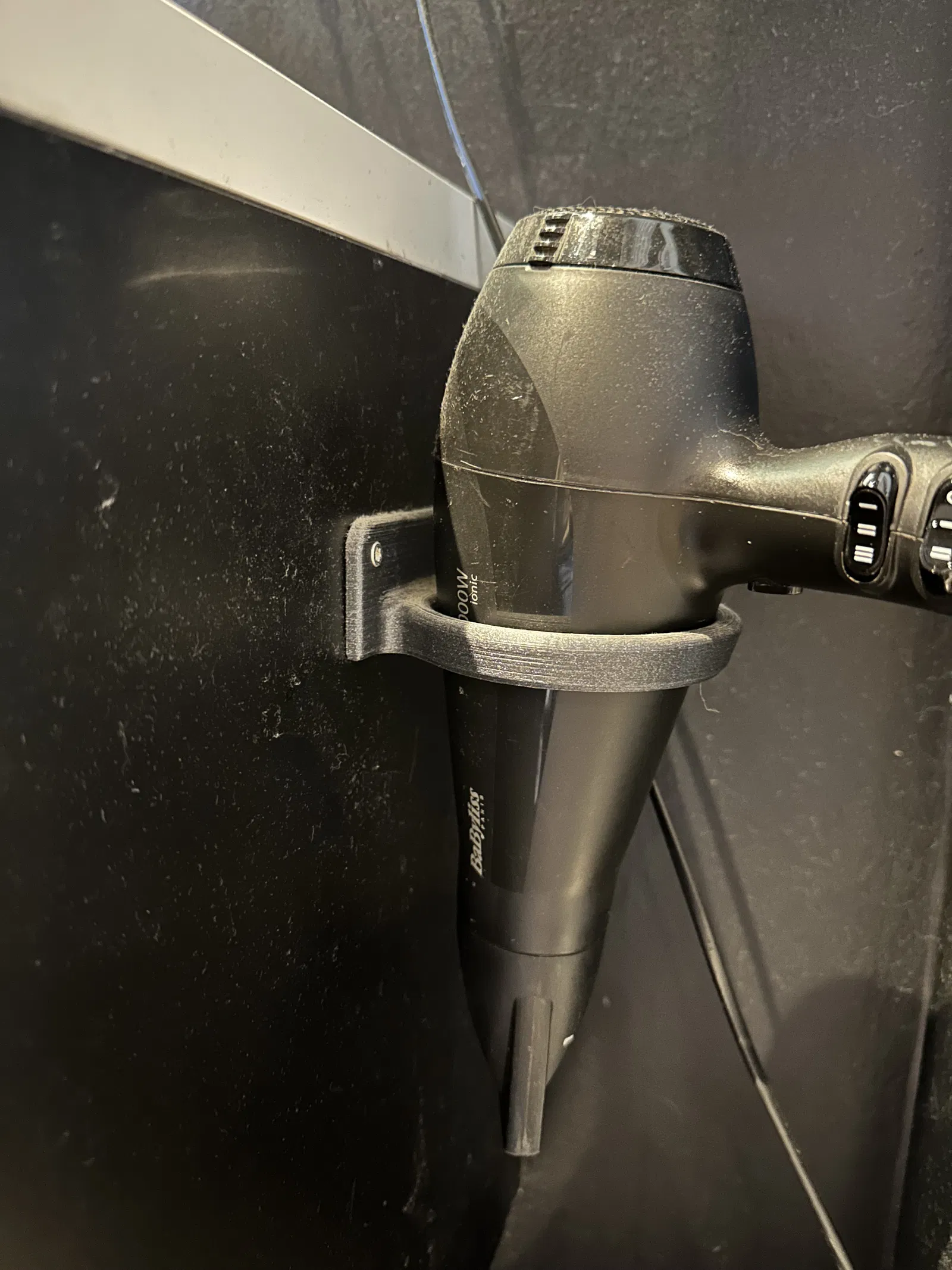 Một giá đỡ chắc chắn cho máy sấy tóc. Đường kính bên trong là 78mm. Sản phẩm được làm từ PLA, bạn có thể tải file STL về in.