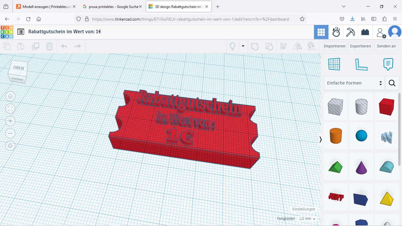 Phiếu giảm giá 1€ này, được tạo bằng Tinkercad, là một vật phẩm độc đáo cho những ai muốn thêm chút cá tính vào các giao dịch của mình. Hoàn hảo cho việc tặng quà hoặc chỉ đơn giản là để thêm một chút thú vị.
