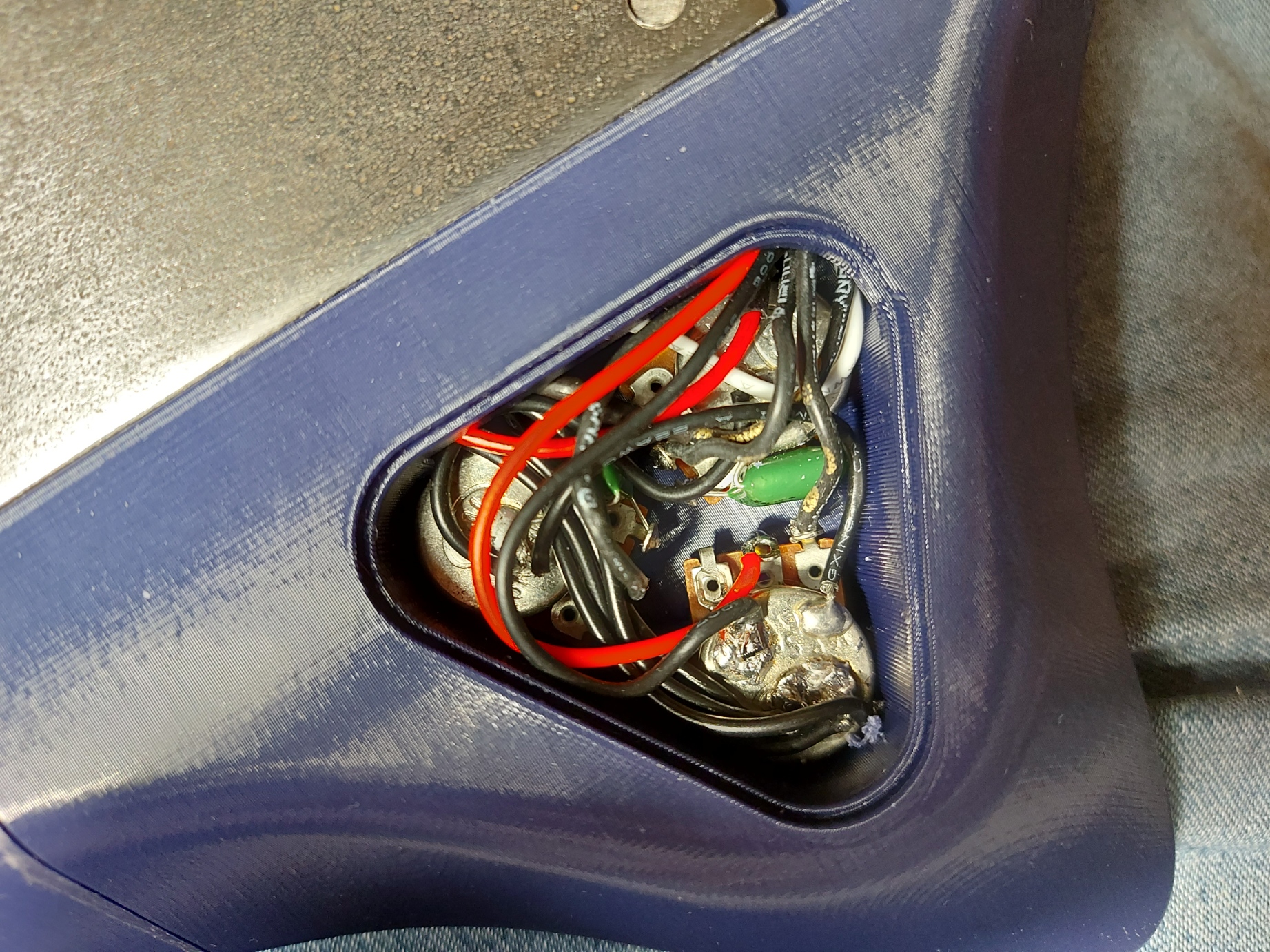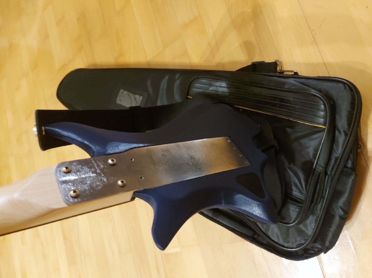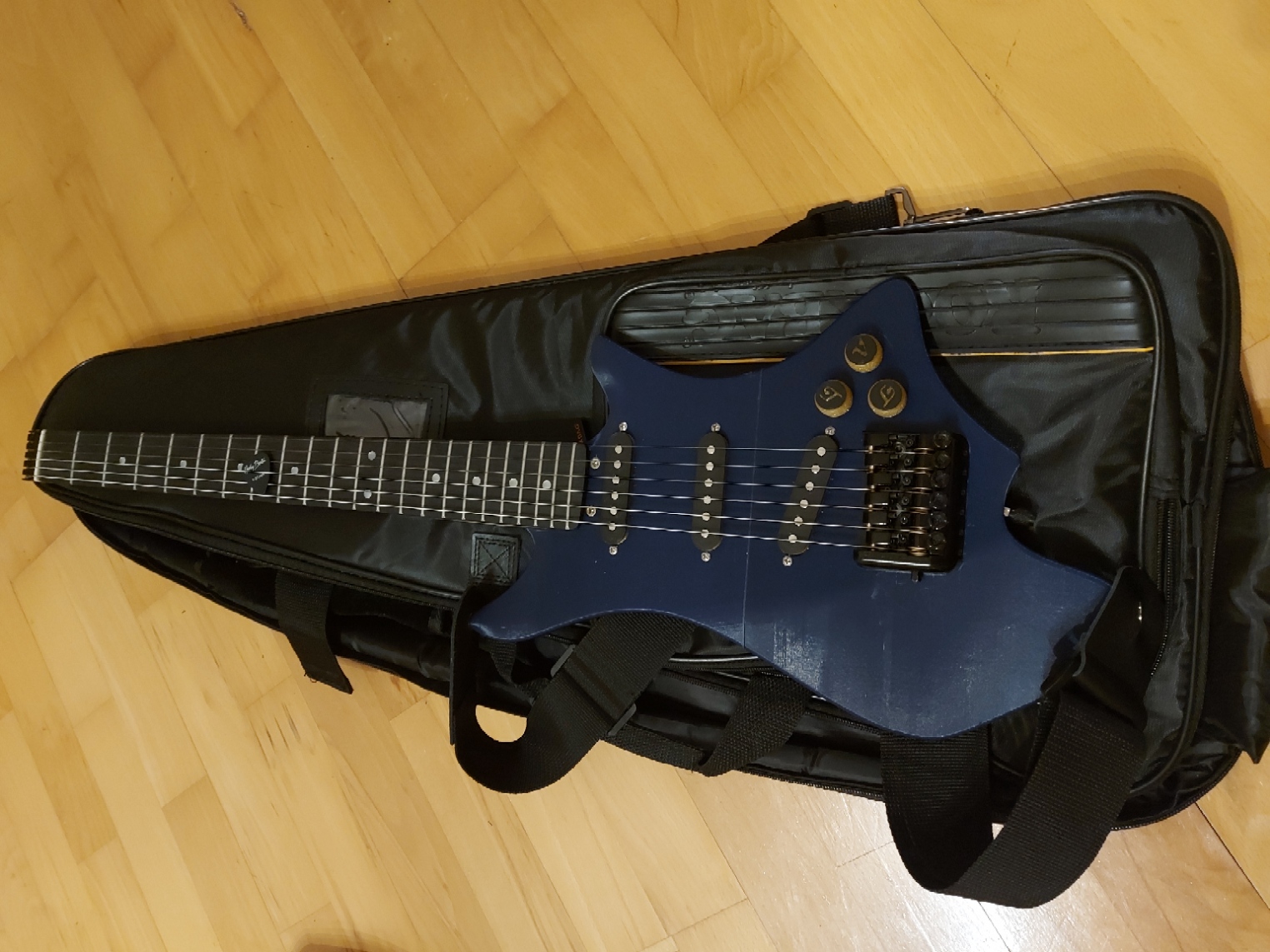 Đây là phiên bản thứ 3 của cây guitar du lịch điện không đầu của tôi. So với các phiên bản trước, phiên bản này có thiết kế công thái học hơn nhiều, hình dáng lấy cảm hứng từ đàn guitar Strandberg, vốn nổi tiếng về tính công thái học. Thật không may, thân đàn phải được làm lớn hơn một chút cho những thay đổi này, nhưng trọng lượng còn nhẹ hơn nữa, với v3 chỉ sử dụng tấm lưng dày 4mm. Sự thay đổi này đi kèm với một số rắc rối, thân đàn không thể chịu được trọng lượng của dây đàn, may mắn là giải pháp rất đơn giản, một thanh giằng được đặt đúng vị trí đã khắc phục được tình trạng cong vênh của thân đàn. Việc in ấn vẫn rất đơn giản với thiết kế gần như không cần hỗ trợ, tùy thuộc vào khả năng của máy in của bạn. Ổ cắm jack cắm cũng đã được thay đổi, để phù hợp với thân đàn mỏng hơn nữa. Phần còn lại của linh kiện điện tử vẫn từ bộ kit HB. Việc đi dây khá là đau đầu, vì khoang chứa linh kiện rất chật chội, nhưng một khi bạn đã tìm ra cách thì cũng không quá khó. Để được trợ giúp lắp ráp, hãy xem tệp .step được cung cấp.