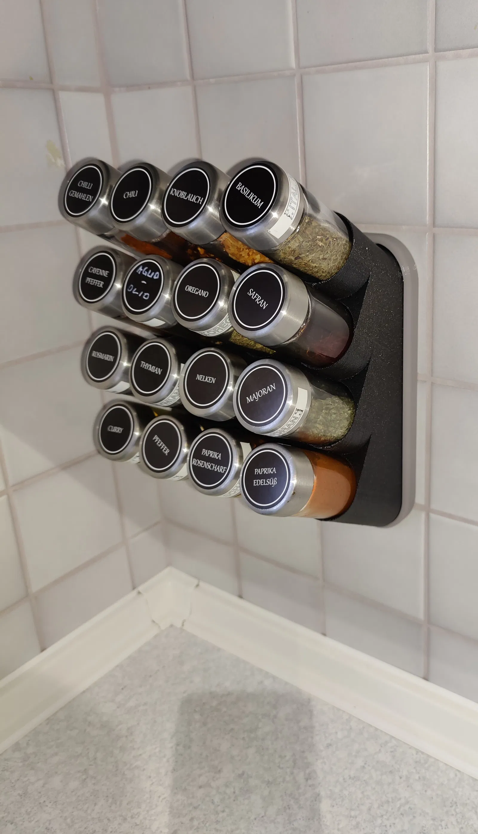 Giá đỡ này dùng được cho 16 hũ gia vị Ikea Örtfylld. Phần "giá giữ hũ" được giữ bằng 4 cục nam châm và có thể tháo ra để vệ sinh. Phần "giá treo tường" thì dán lên gạch men bằng 4 miếng dán Tesa Powerstrips, không cần khoan đục gì hết. Nhờ có khe hở, bạn có thể tháo miếng dán Powerstrips ra khi cần.
