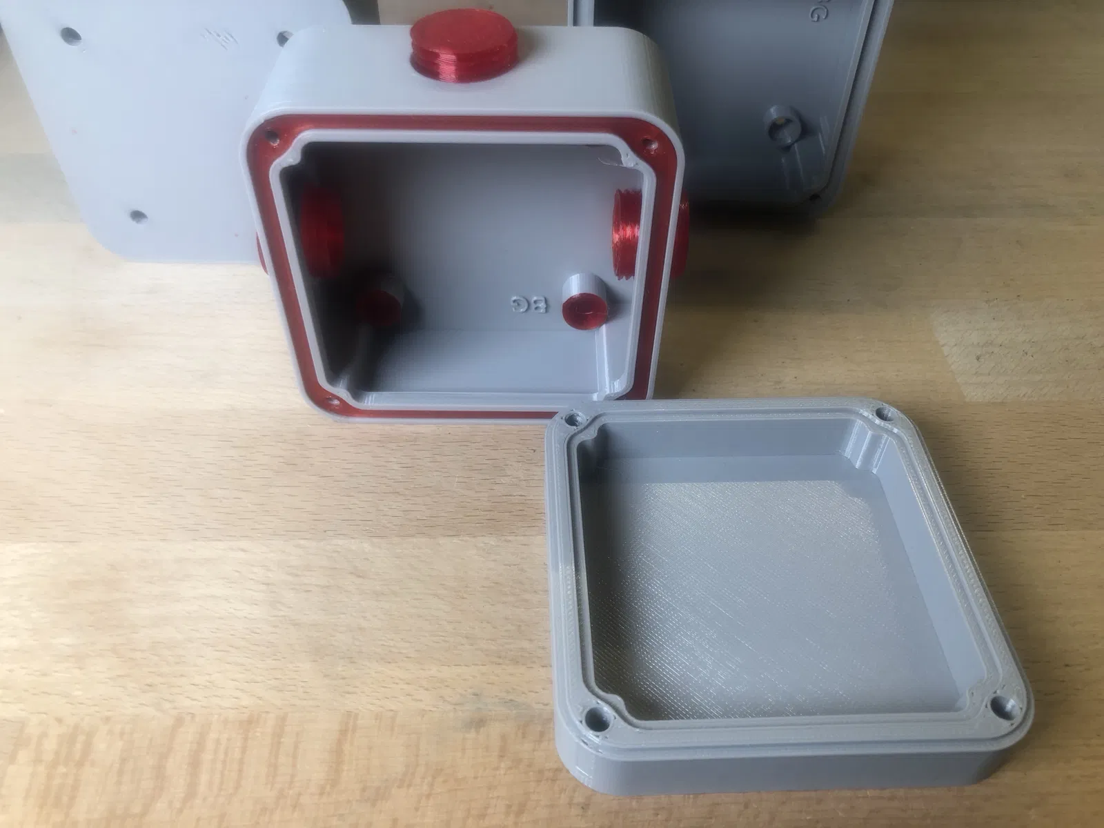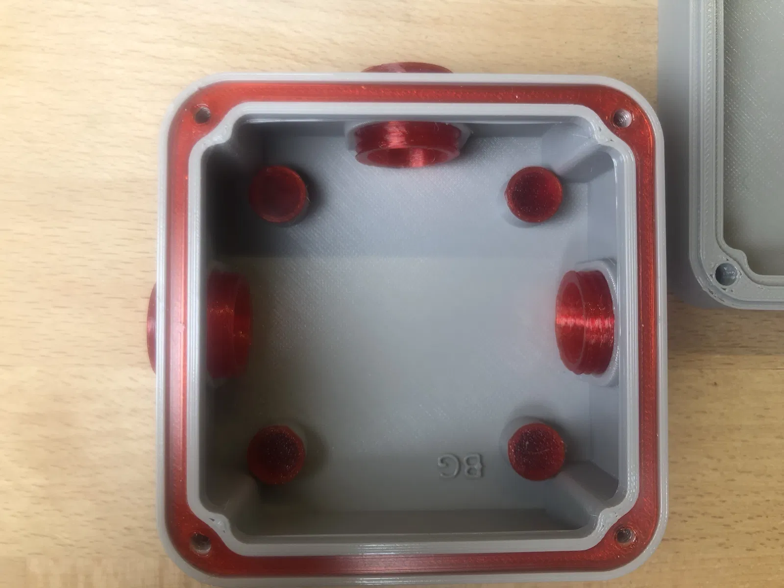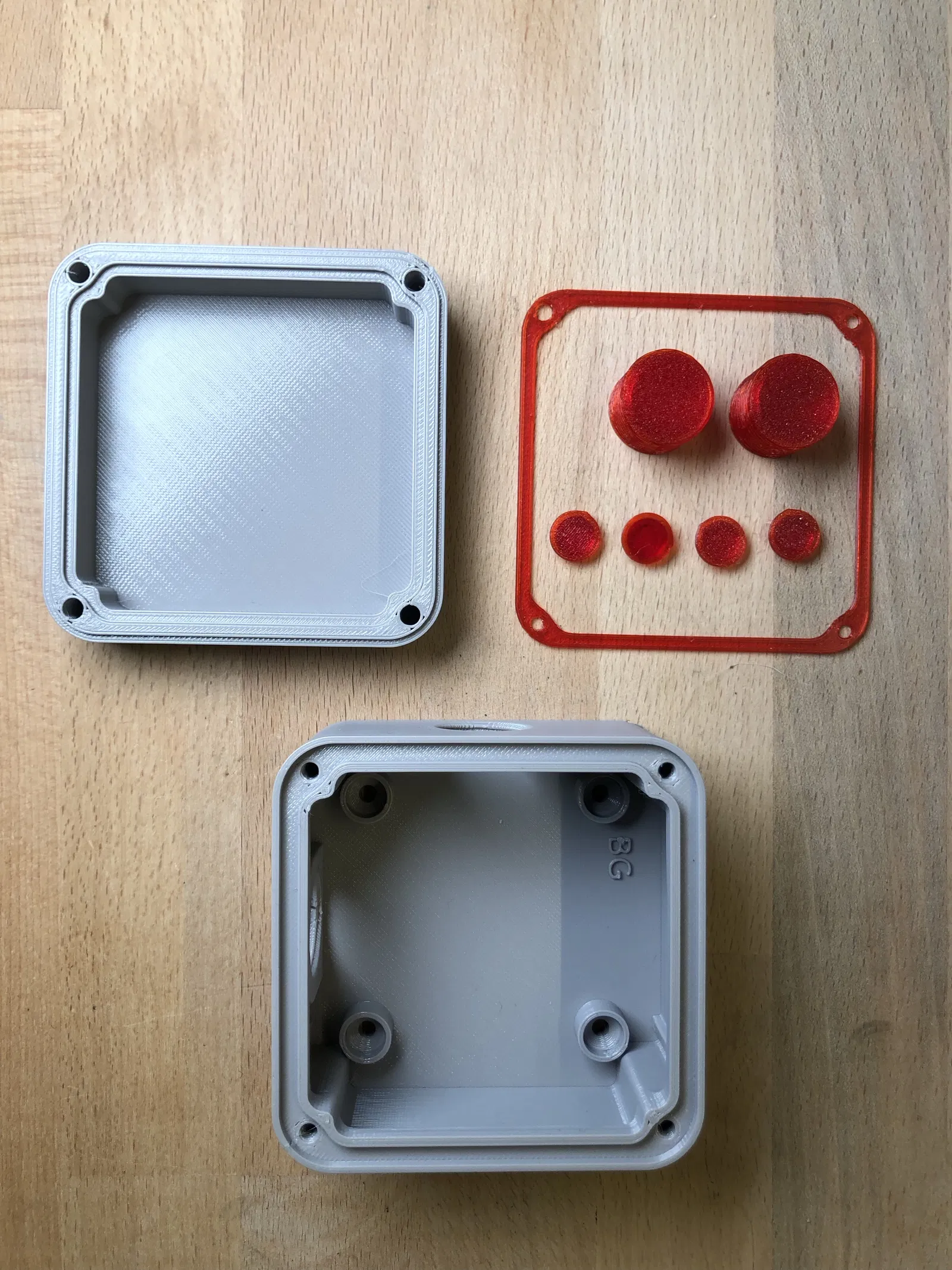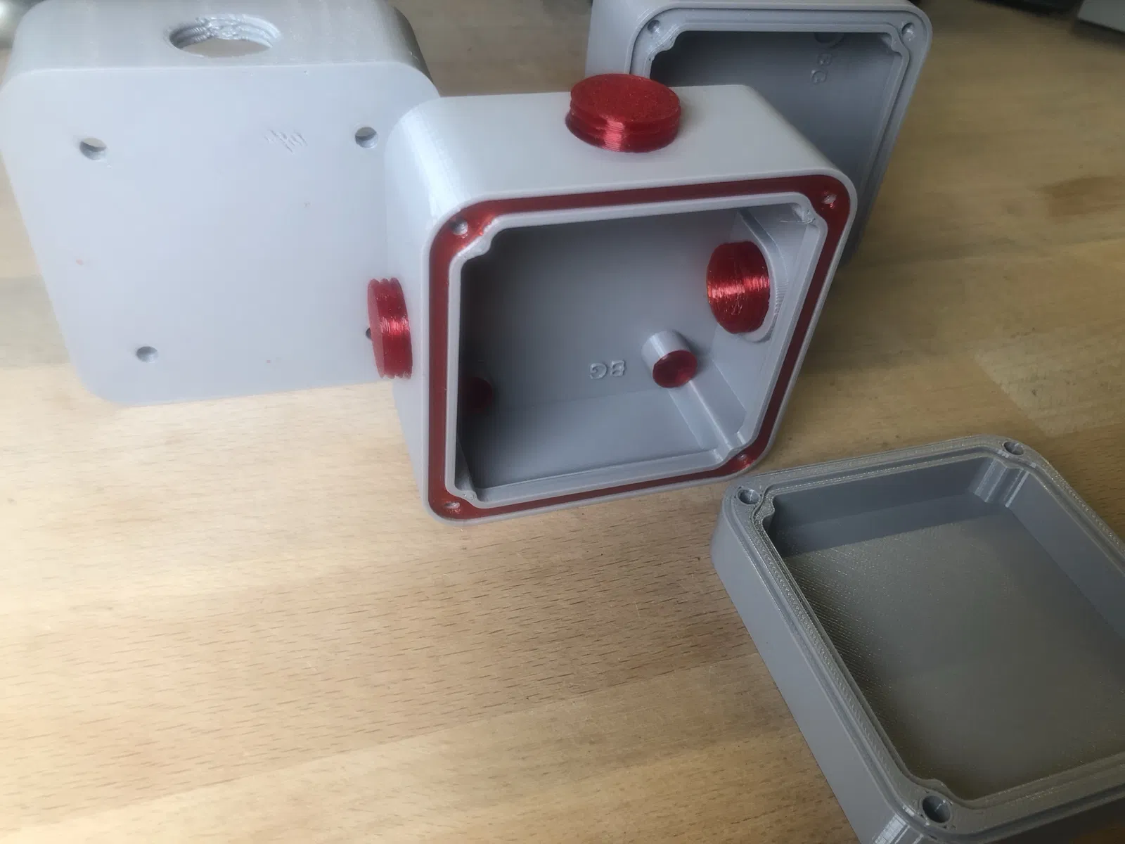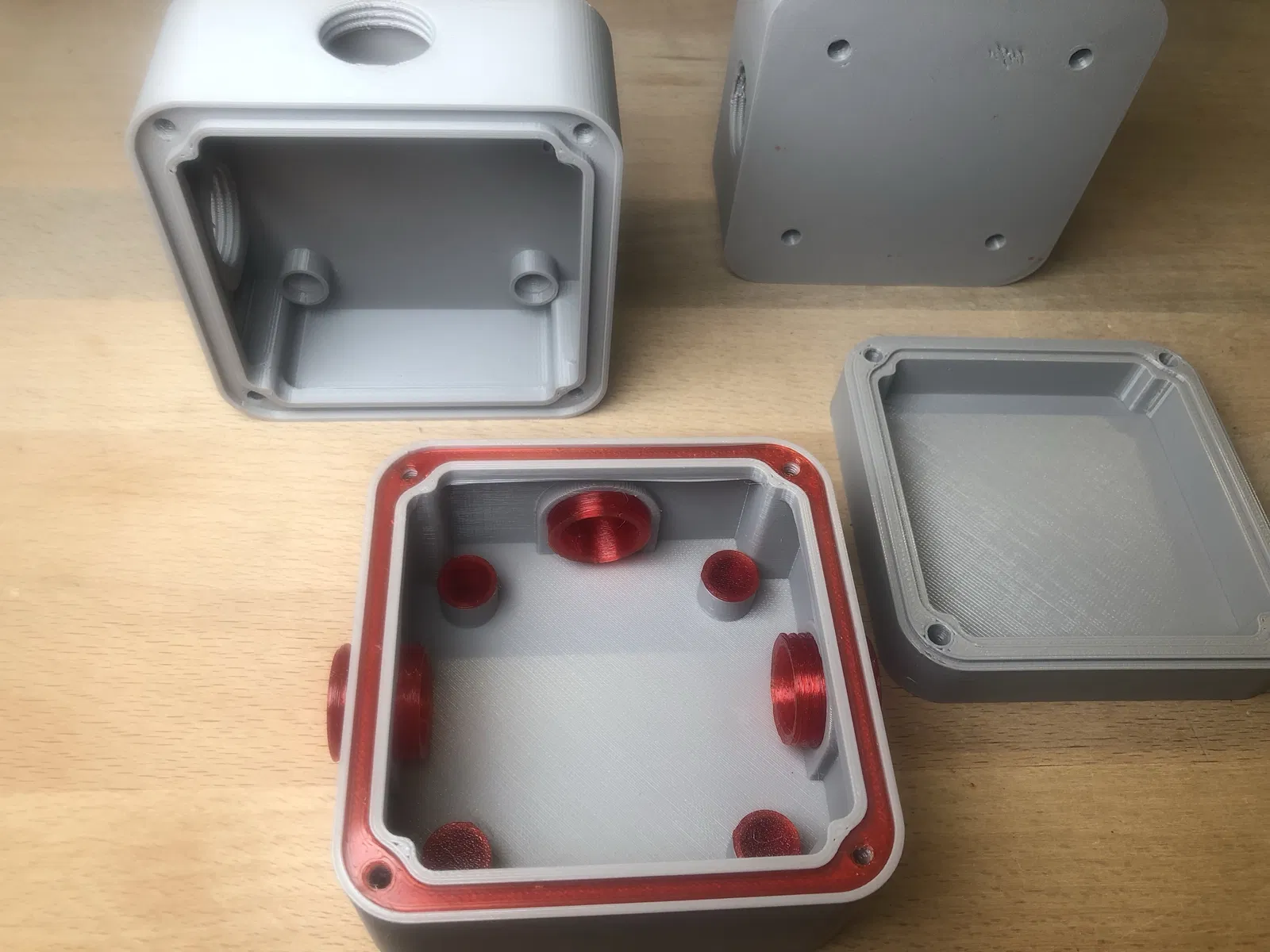 Một gioăng có thể in được chèn vào giữa nắp và thân hộp. Tất cả các gioăng đều được in 3D bằng TPU và có độ mềm dẻo (phần màu đỏ).