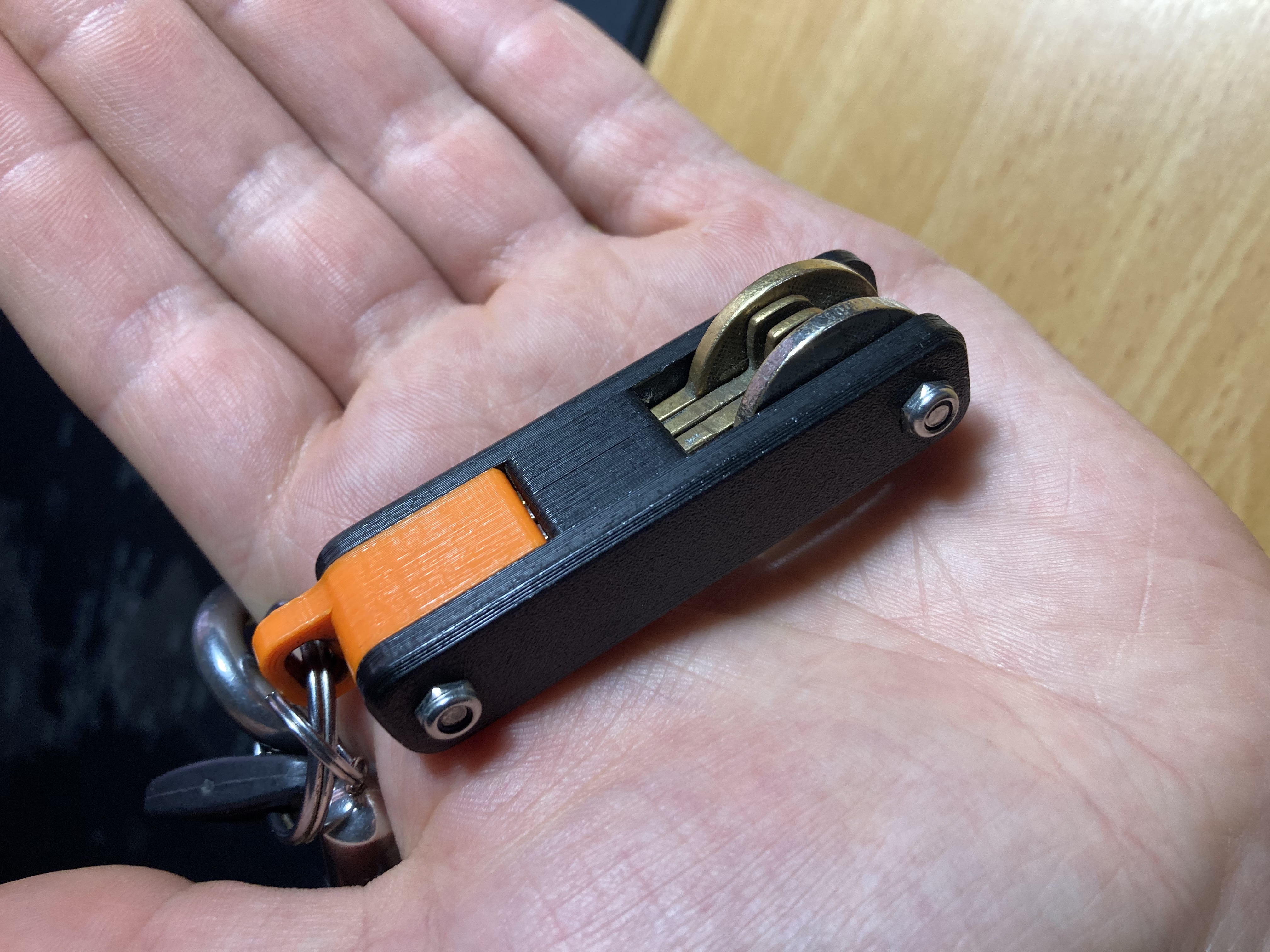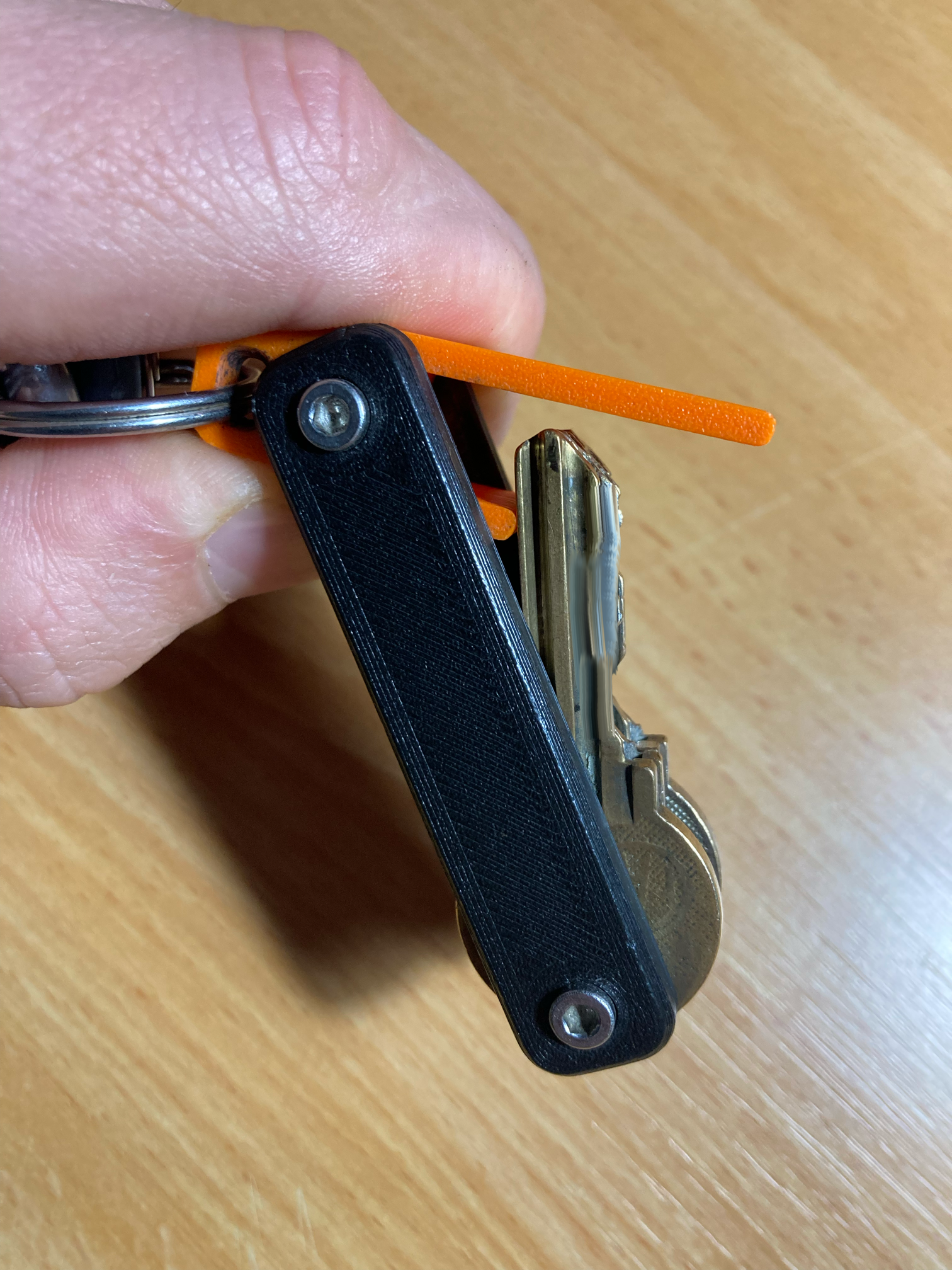 Tao thử giảm bớt cái mớ chìa khoá của tao lại. Tao lấy cảm hứng từ mấy cái giải pháp sắp xếp chìa khoá trên mạng, và kết quả là cái này, một cái sắp xếp chìa khoá cho 4 chìa khoá tiêu chuẩn. Để lắp ráp, mày cần 2 con ốc M3, dài 18mm, và 2 con đai ốc lục giác (lock nut).