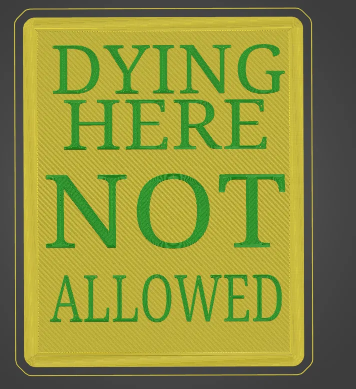 Một tấm biển báo cơ bản với thông điệp "chết ở đây không cho phép". Sản phẩm được in với brim để đảm bảo không bị cong vênh trong quá trình in ấn. Thích hợp cho các dự án nghệ thuật hoặc trang trí độc đáo.