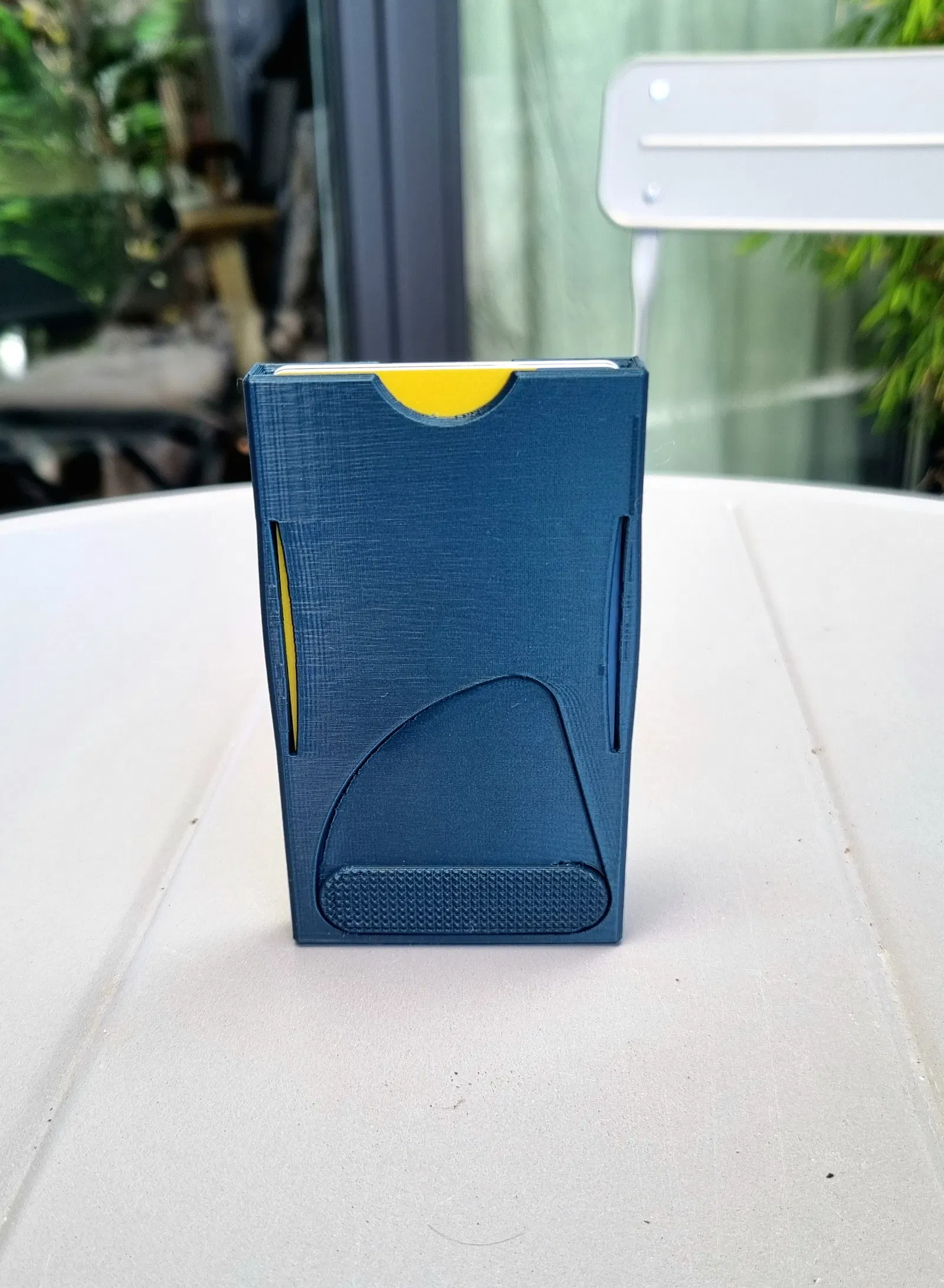 Các thẻ được giữ cố định nhờ 2 khe phía trước tận dụng độ đàn hồi của nhựa để giữ chúng không bị rơi ra ngay cả khi úp ngược. Tôi đã chia cơ cấu giữ thành 2 phần (với rãnh ở cạnh không thẳng) để ngăn một thẻ lớn làm căng tất cả nhựa và làm rơi tất cả các thẻ khác.