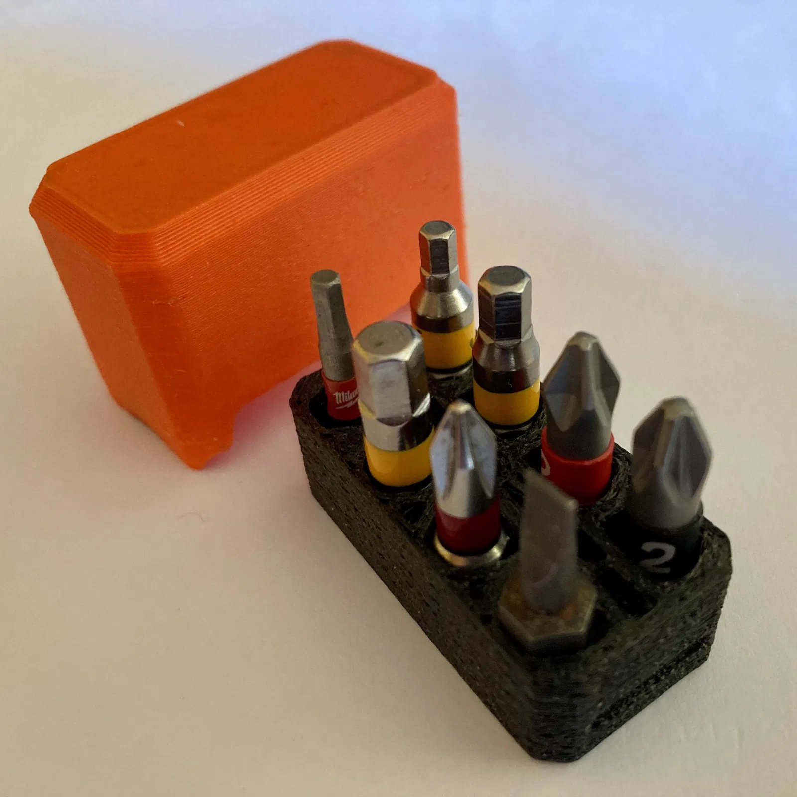 Một hộp đựng mũi khoan 1/4" đơn giản, có đế in TPU linh hoạt và nắp cứng. Phiên bản cải tiến với 7 hoặc 9 khe cắm giúp lấy mũi khoan ra dễ dàng hơn.