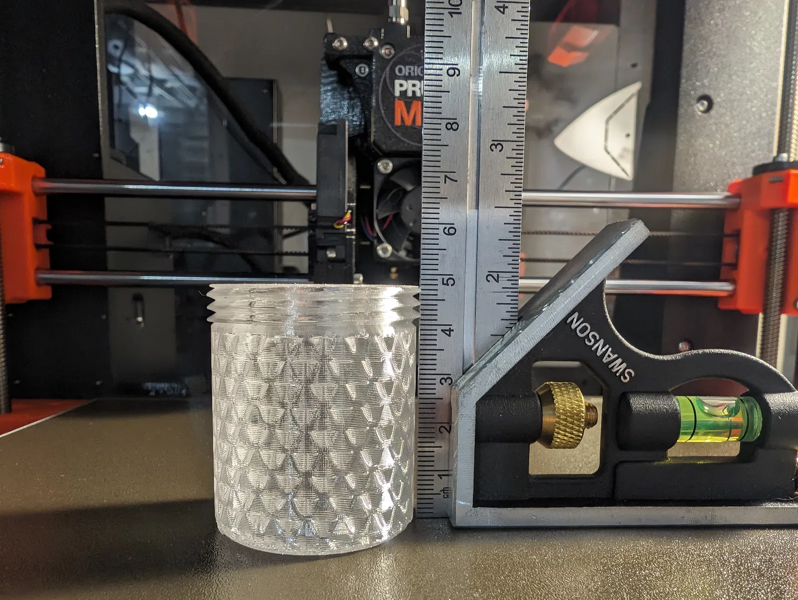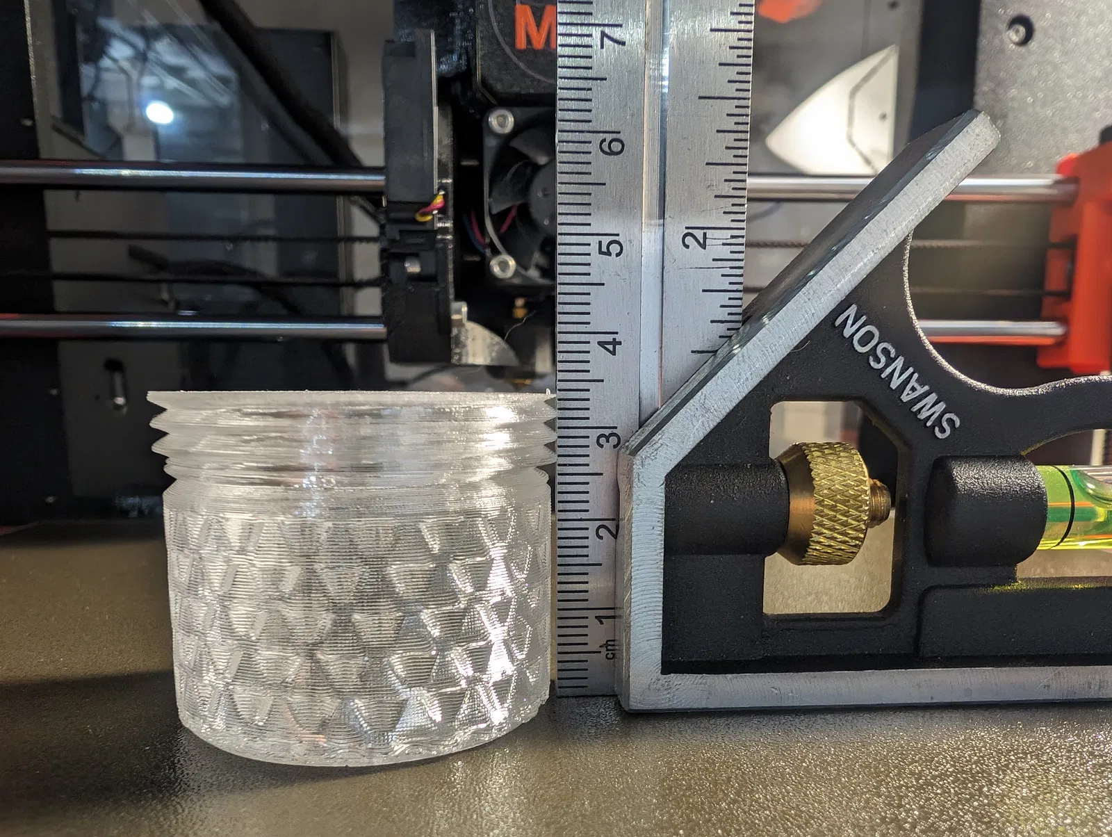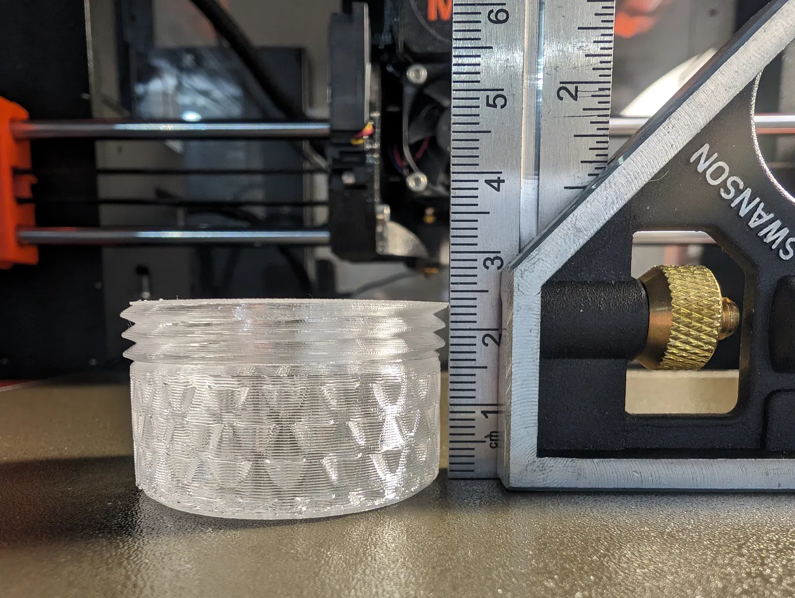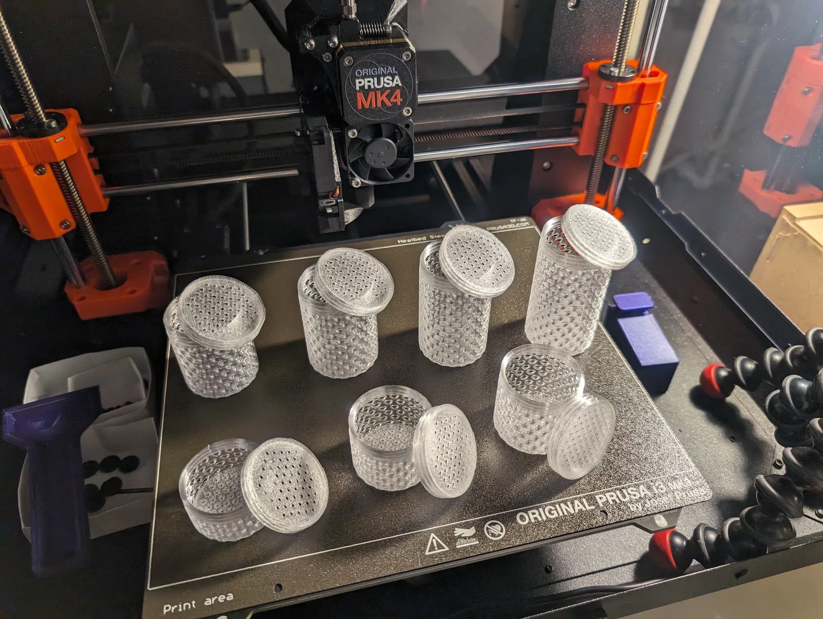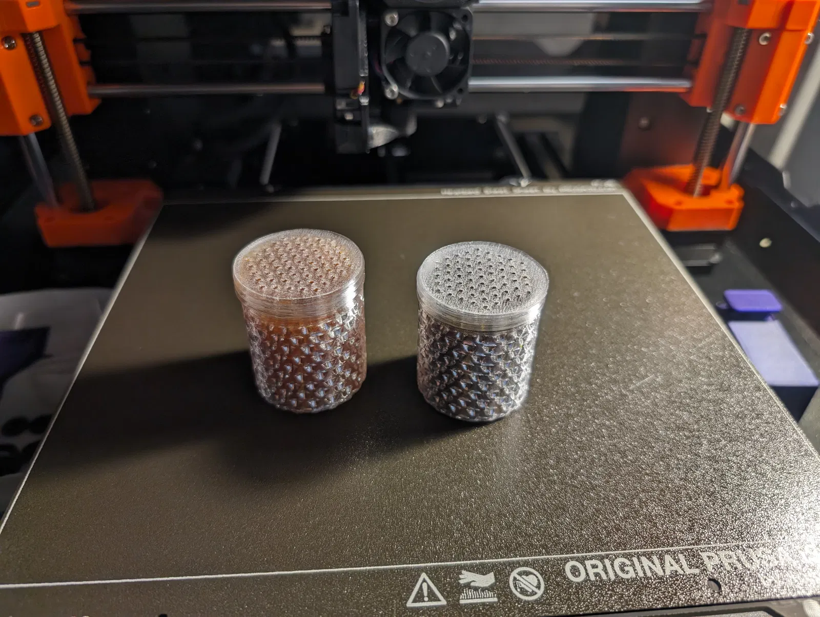 CHỈNH SỬA 2024-02-10 - Tui cuối cùng cũng đã in mấy cái này bằng ColorFabb HT clear trên máy MK4 có vỏ bọc của tui. Filament trong suốt cho thấy chất hút ẩm đổi màu rất rõ. Biến thể 48mm đang ở trên cân, cho thấy kích cỡ đó chứa khoảng 40g chất hút ẩm (khô). Các file gcode mới thêm là cái tui đã dùng trên MK4 của tui. Nhớ nha, bạn có thể nhập cài đặt từ gcode vào PrusaSlicer nếu bạn muốn xem chi tiết mọi thông số của tui. Tui đã dùng chiều cao lớp thay đổi (mà tui nghi ngờ sẽ không tải từ gcode) để có các lớp dày ở hai bên thân để in nhanh hơn, nhưng vẫn giữ các lớp mỏng ở phần ren (nếu không thì phần ren sẽ không in đúng). Tui cũng đã thay thế tất cả các file 3mf bằng cái mà tui đã dùng để tạo gcode.