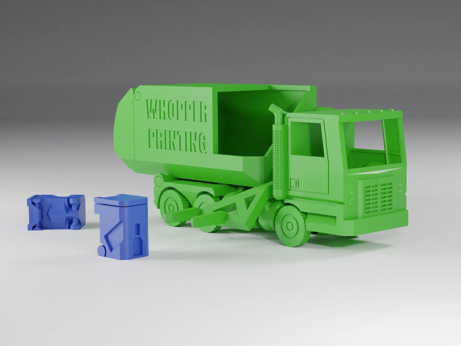 Mô hình xe rác in-place không cần hỗ trợ, có chức năng nhấc thùng rác, cửa sau và bánh xe. Phiên bản tiêu chuẩn và mini có cùng dung sai, phù hợp với bàn in nhỏ. Cập nhật thêm cánh tay thay thế. Ủng hộ tác giả qua Patreon, mua hàng hoặc xem trên website.