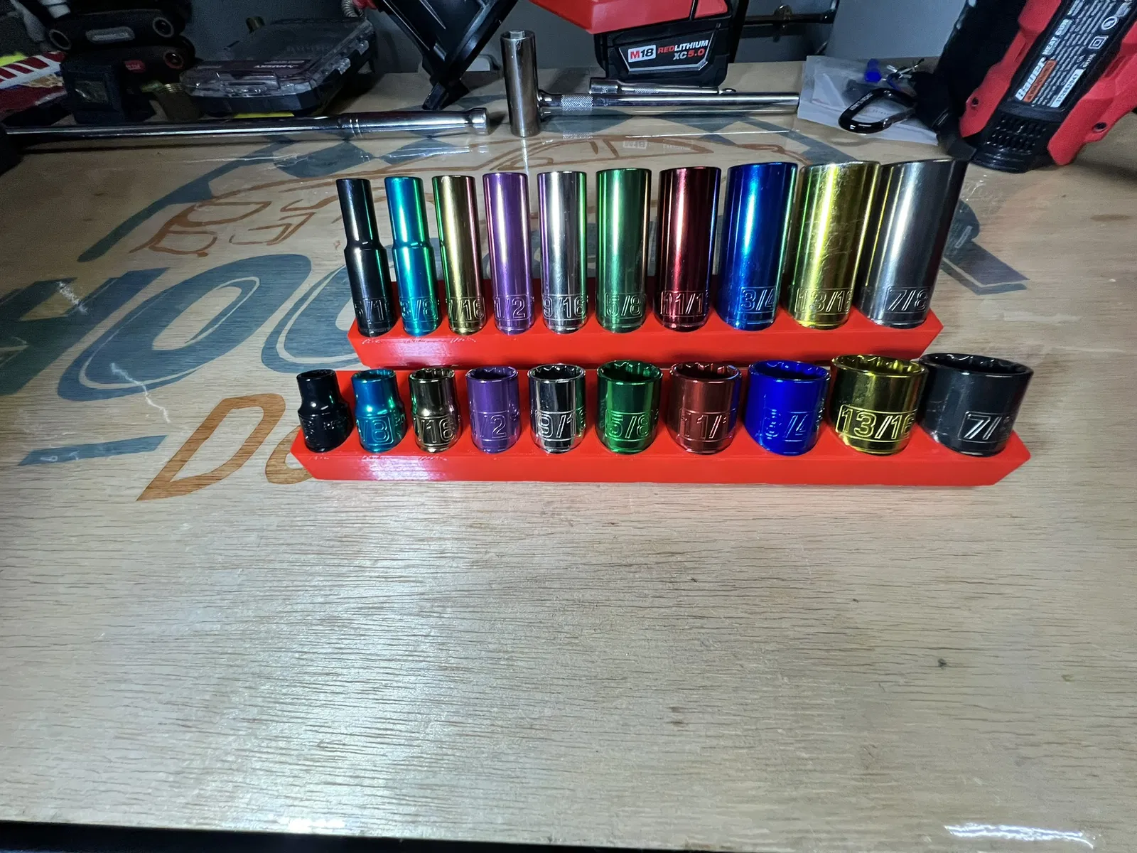 Module Gridfinity 6x1 dùng để đựng các loại tuýp của Harbor Freight cỡ 3/8 inch. Tôi có bộ tuýp Pittsburgh nhiều màu, nhưng tôi tin rằng bộ màu crôm cũng sẽ vừa. Nếu bạn thử, hãy để lại bình luận cho tôi biết nhé. Tôi đã thử với tuýp Craftsman mà tôi có trong bộ du lịch, một số vừa, một số không vừa, xem hình. Nó khá sát nên bạn có thể chà nhám sau khi in để làm cho chúng vừa. Nếu bạn in những cái này cho loại tuýp khác, vui lòng đăng ảnh để người khác có thể xem chúng vừa như thế nào.
