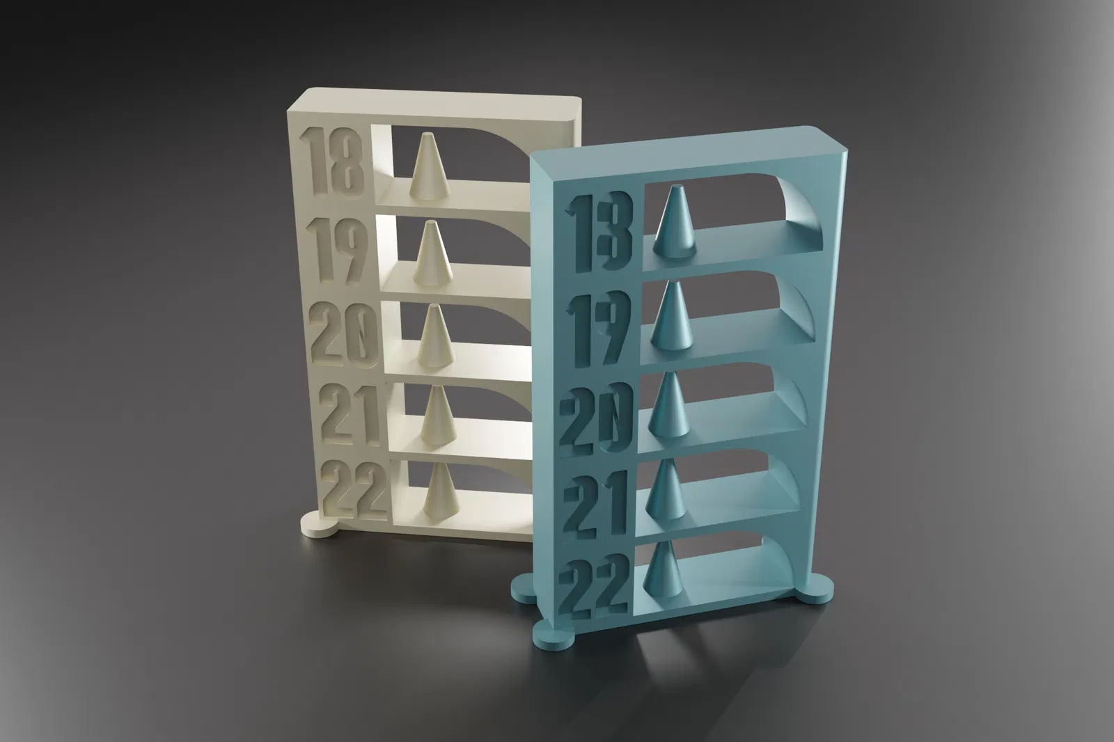 Mô hình tháp nhiệt độ nhỏ này dùng để kiểm tra nhiệt độ filament từ 180 độ C đến 220 độ C. Các mốc nhiệt độ được ghi rõ từ dưới lên, giảm dần 10 độ mỗi bước: 220, 210, 200, 190, 180.