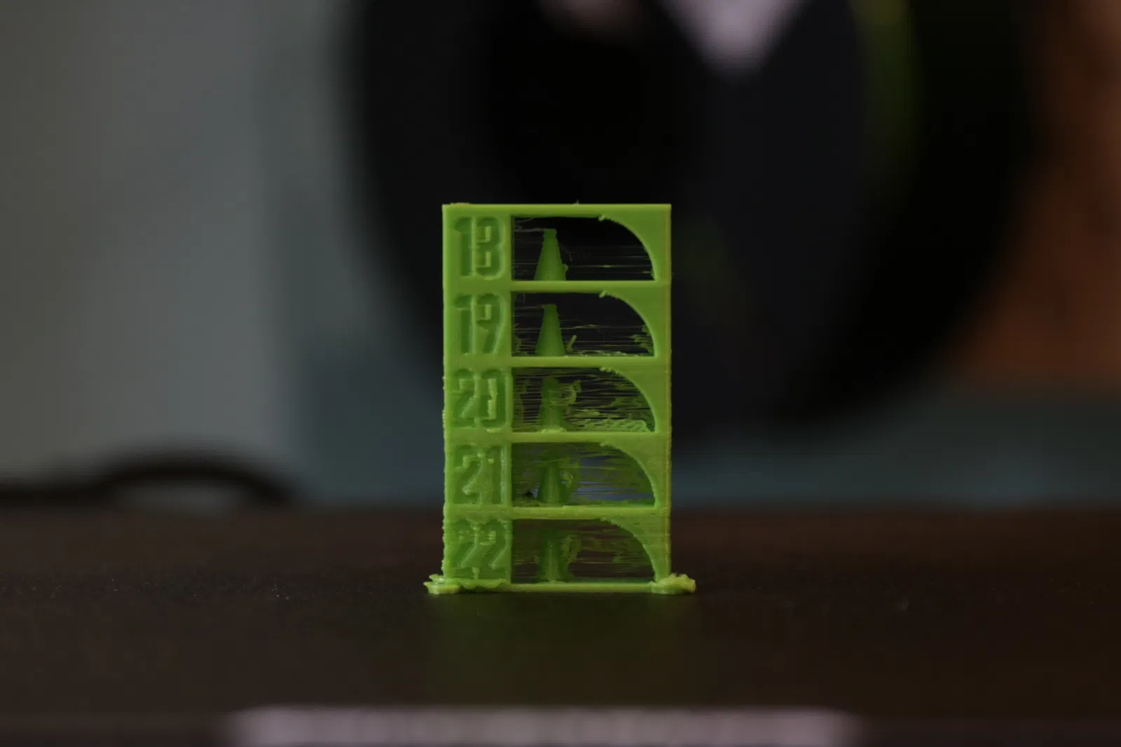 Cái trụ nhiệt độ này là một mẫu để kiểm tra nhiệt độ của filament từ 180 độ C đến 220 độ C, mặc dù nhiệt độ được ghi nhãn từ dưới lên trên và giảm 10 độ mỗi bước: 220, 210, 200, 190, 180.