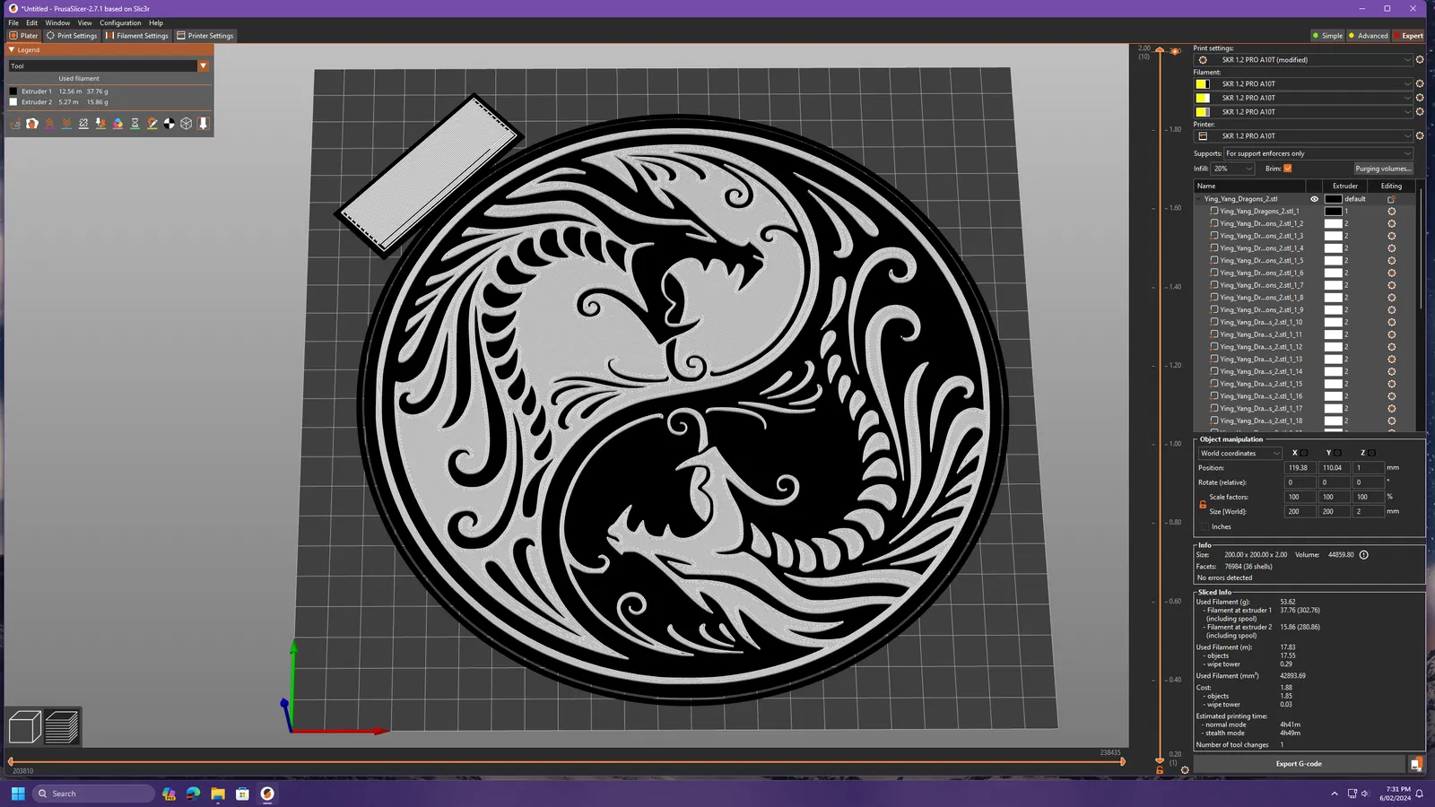 Mô hình "Con Rồng Năm Âm Dương" này in ra đẹp lắm, kích thước 200x200mm, dày 2mm, in tầm 4 tiếng. Hướng dẫn chi tiết cách in cho máy nhiều đầu phun và máy một đầu phun.