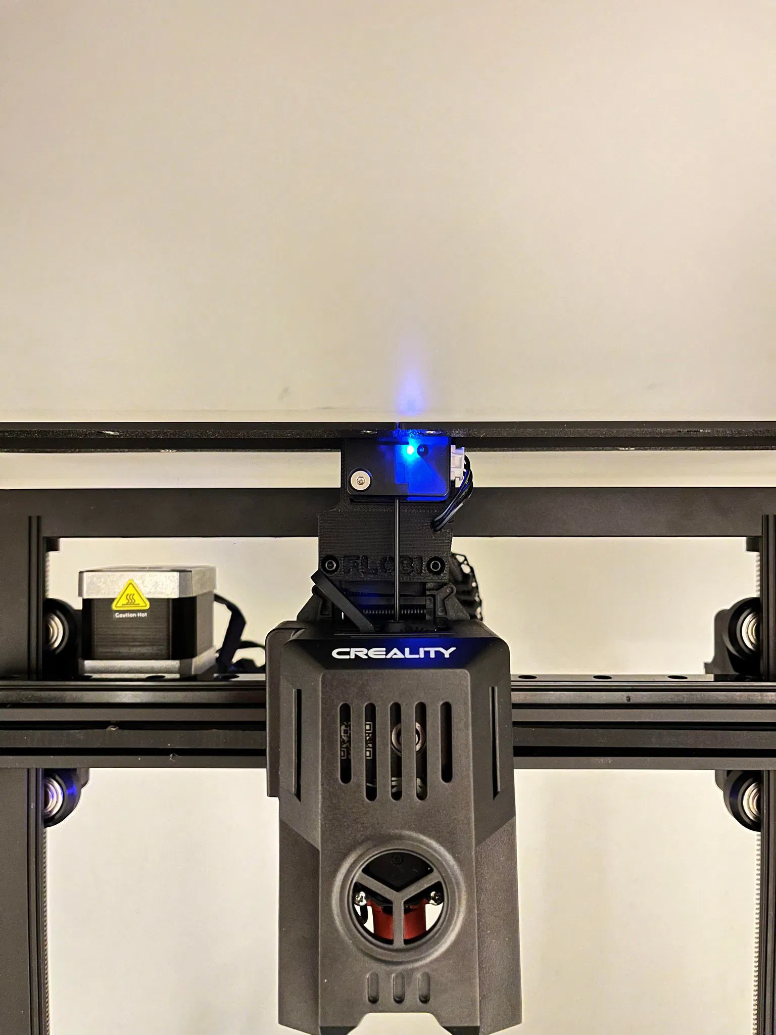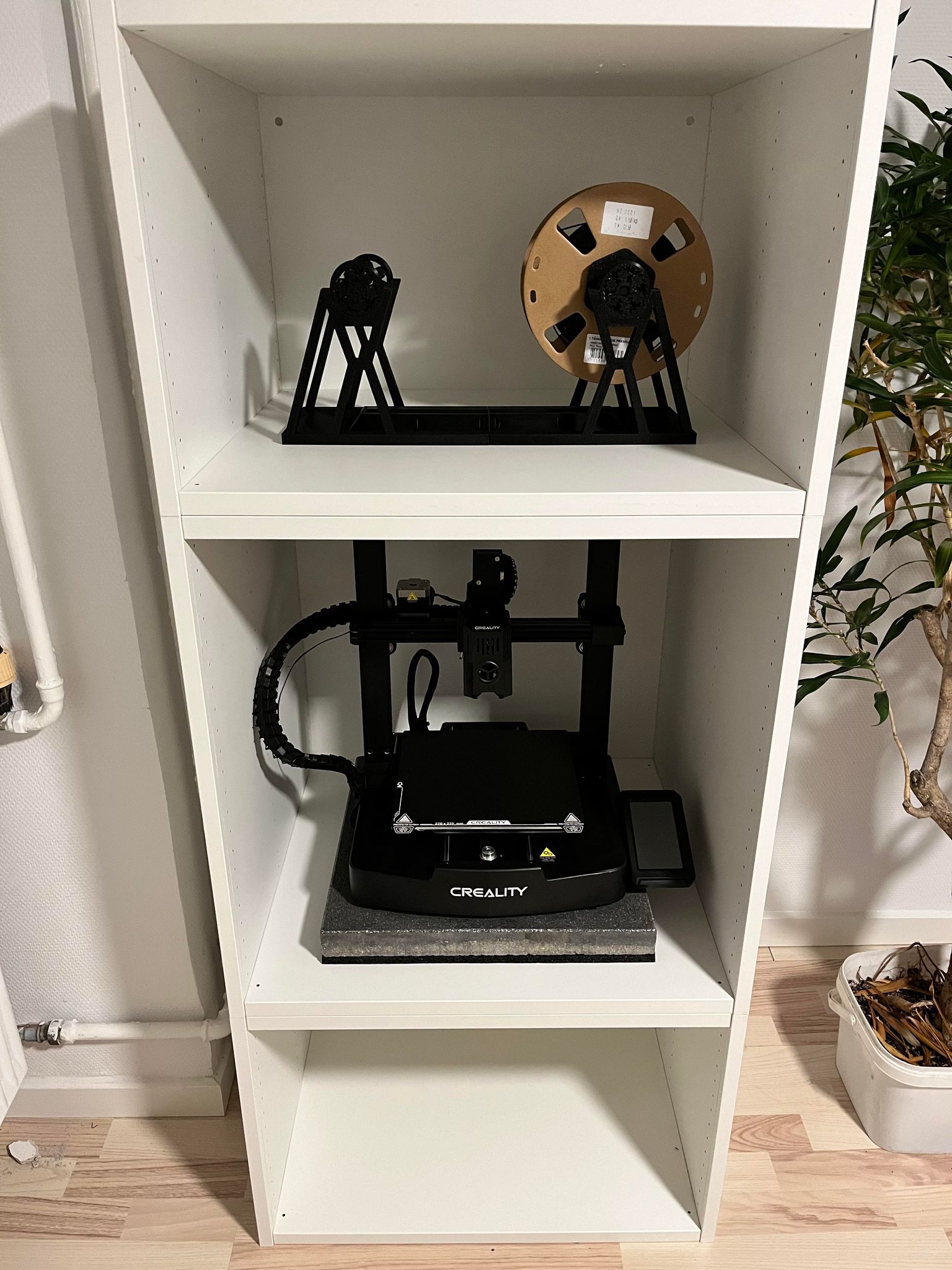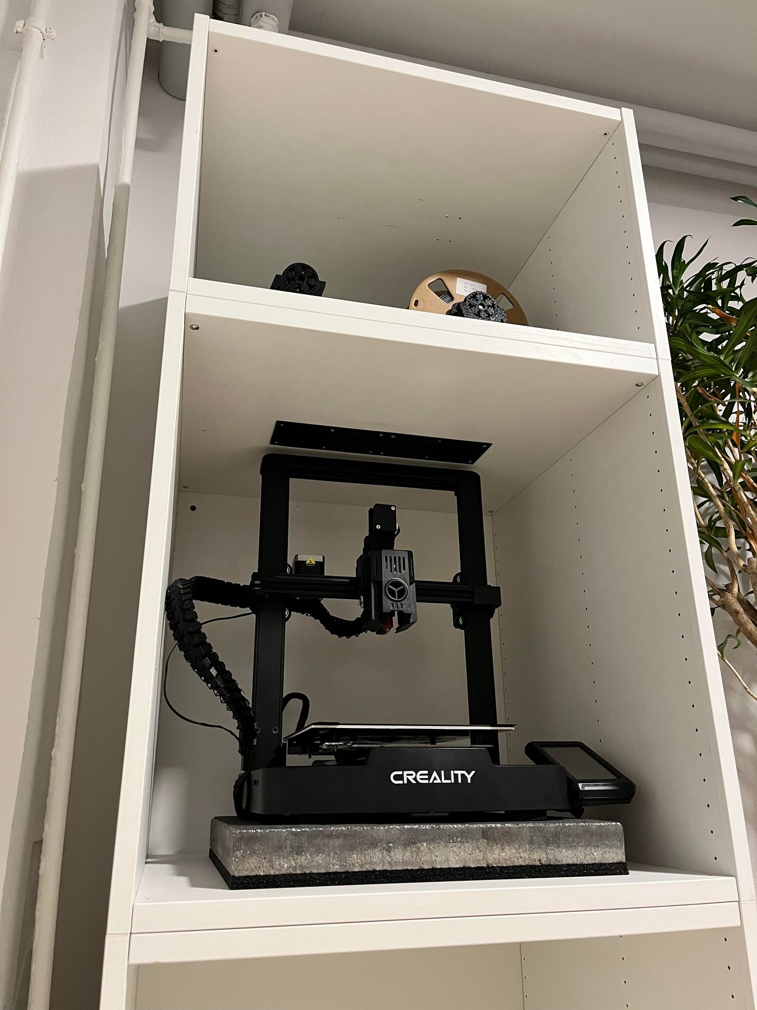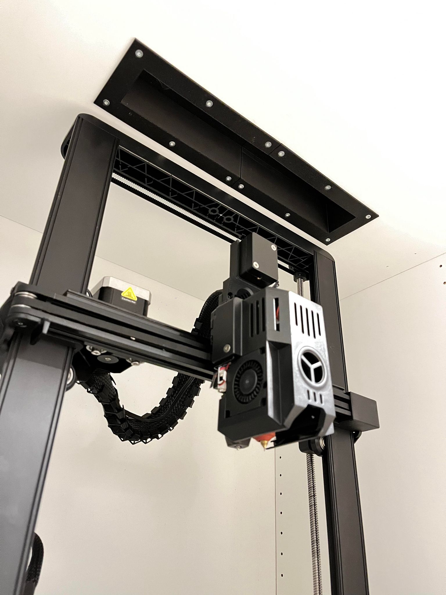 Cái enclosure này đáng lẽ cũng xài tốt cho mấy máy in khác. Nhưng vì con Ender V3 KE nó cao quá trời, nên mình cần một giải pháp khác, vì cái tủ bình thường của IKEA Platsa không vừa. Thế nên... Mình dời cái cảm biến hết sợi (filament runout sensor) lên ngay phía trên đầu in.