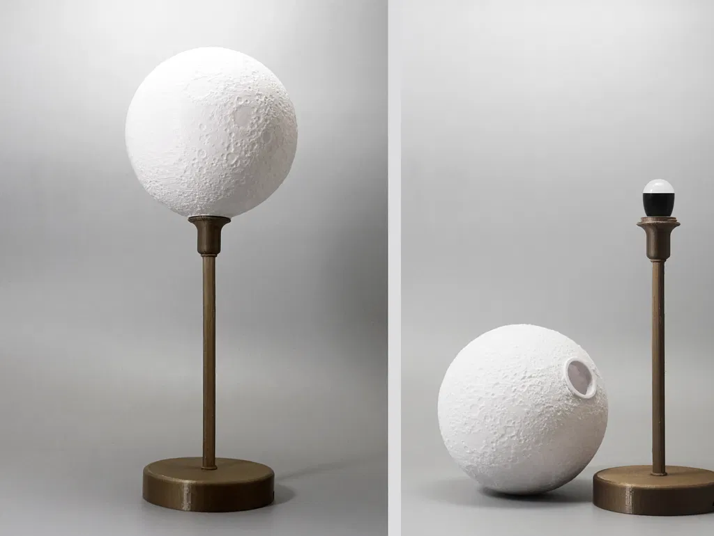 Mô hình đèn mặt trăng với đế, kích thước 144X144X140mm, gồm 5 file và 6 bộ phận. Thời gian in khoảng 15 giờ, cần raft nhưng không cần support. Sử dụng bóng tBulb S. Hoàn hảo để trang trí nhà cửa.