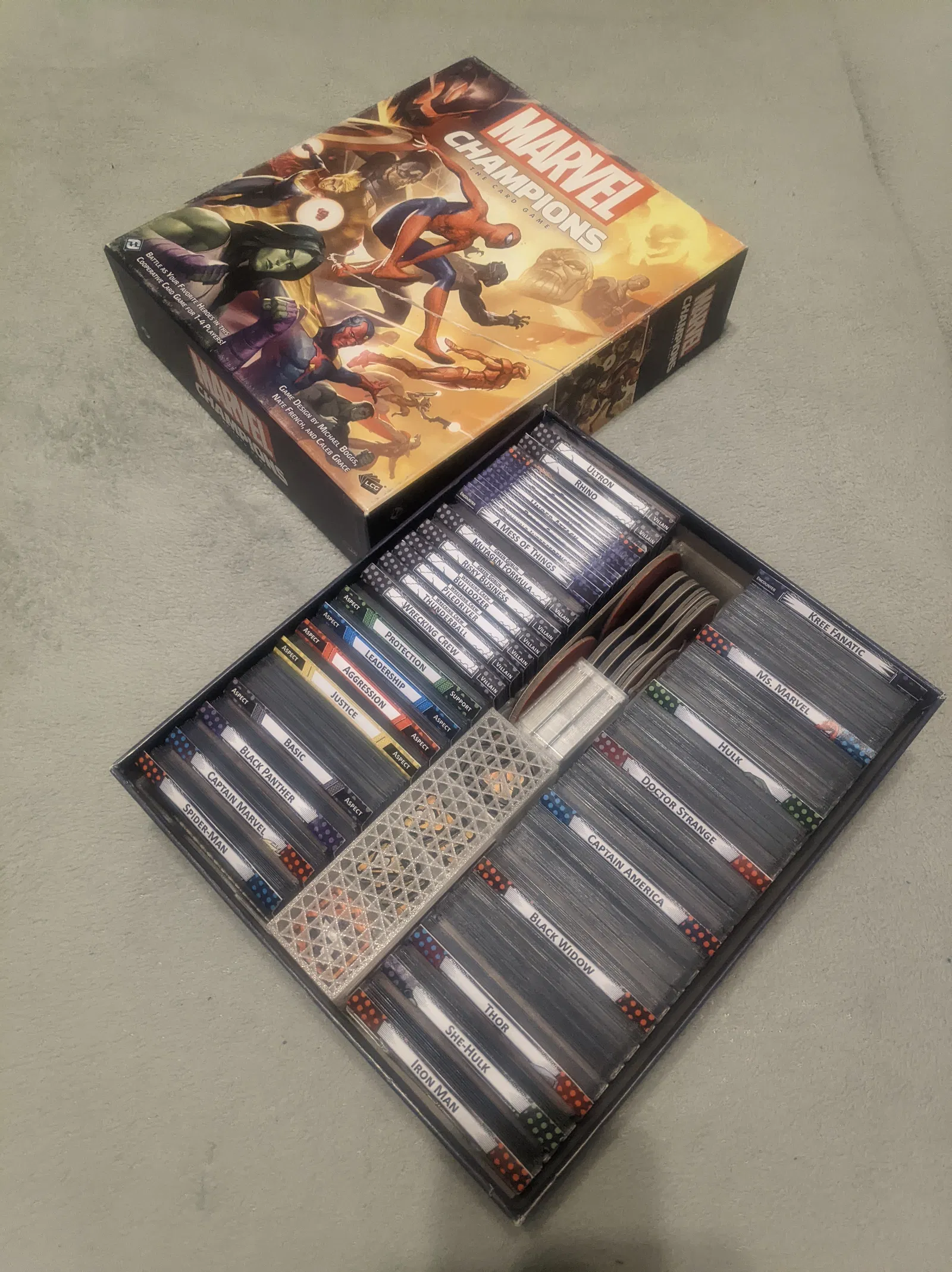 Tạo Insert cho Marvel Champions LCG vì không có cái nào vừa với sleeve 93.5 x 67mm. Có khay đựng token riêng biệt và ngăn đựng thẻ tiện dụng. Bao gồm cả khay đựng token Ready/Used có thể tải về riêng. Hướng dẫn in chi tiết kèm theo.