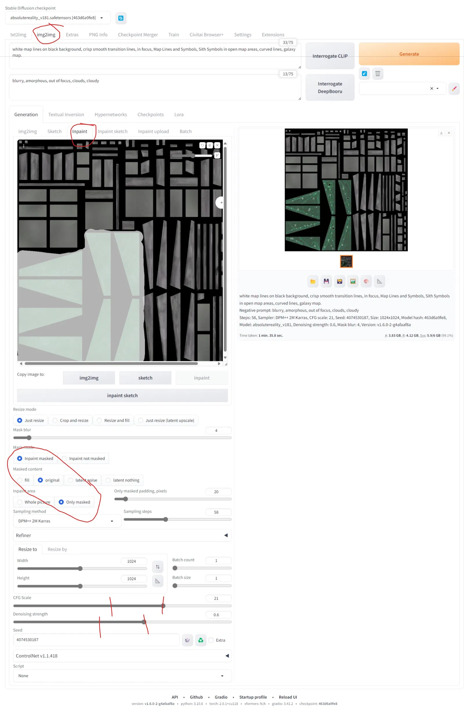Cho mấy anh em nào quan tâm ha. Tui có đăng mấy tấm hình trước và sau của UV map nè. Cái nào ít chi tiết hơn là cái gốc đó nha. Tui dùng image2image với inpaint 2 lần á. Lần đầu, tui tạo mask che mấy vùng bản đồ ở góc dưới bên trái màn hình rồi cho nó rework lại bản đồ chi tiết hơn. Sau đó, tui lấy cái hình mới đó bỏ vô image to image, dùng inpaint lần nữa để che mấy vùng xám và tạo ra mấy cái ký tự Sith khắc chìm trên nền vân gỗ. Điều khiển vi sai nhiều lắm. Chạy ngon lành cành đào luôn. Có thể làm bao nhiêu lần tùy ý cho mấy cái uv map phức tạp bị gấp/mở ra theo nhiều cách ngẫu nhiên. Đã tạo lại và thêm ảnh chụp màn hình trang stable diffusion cùng cài đặt của tui cho giai đoạn đầu.