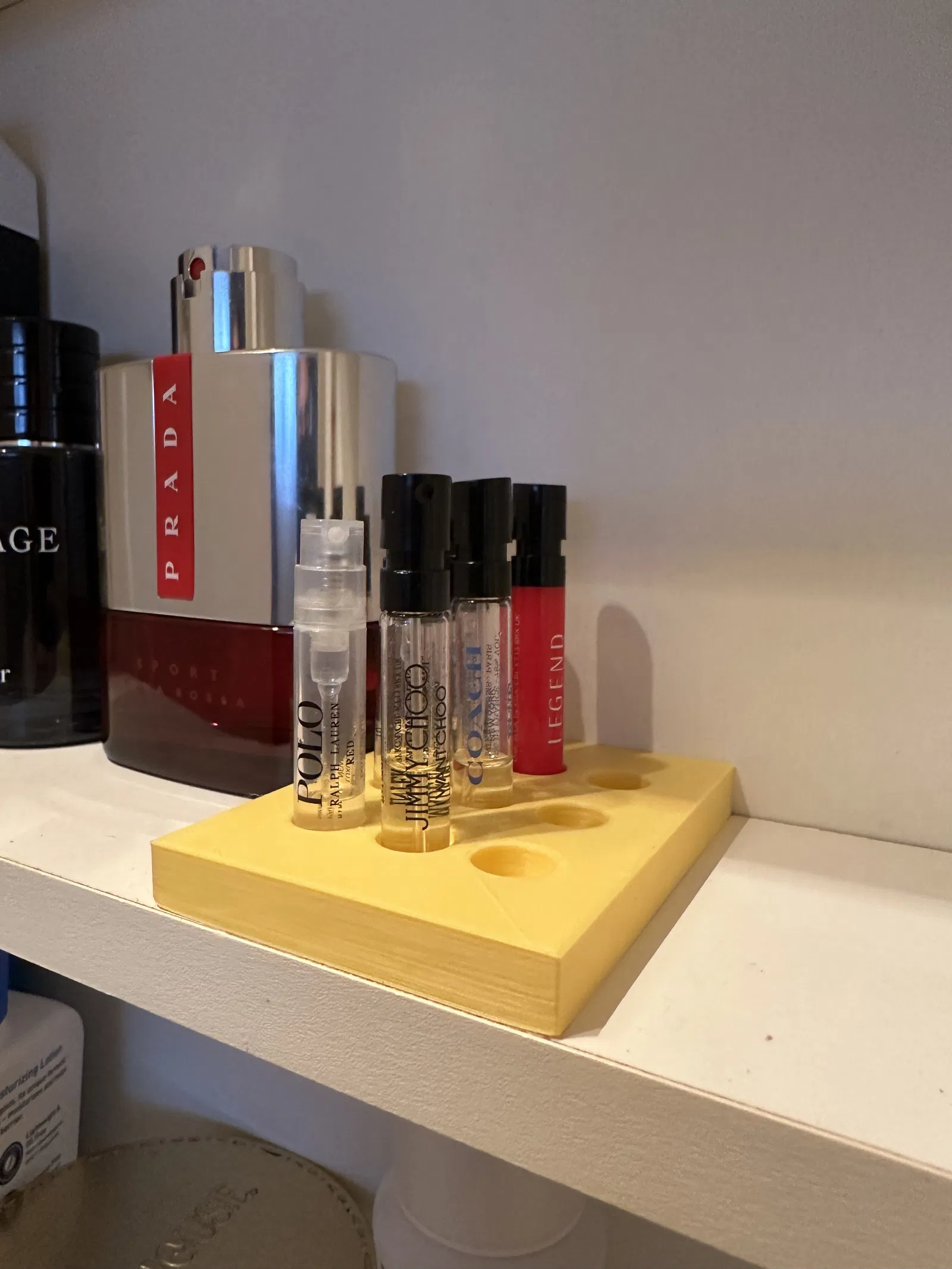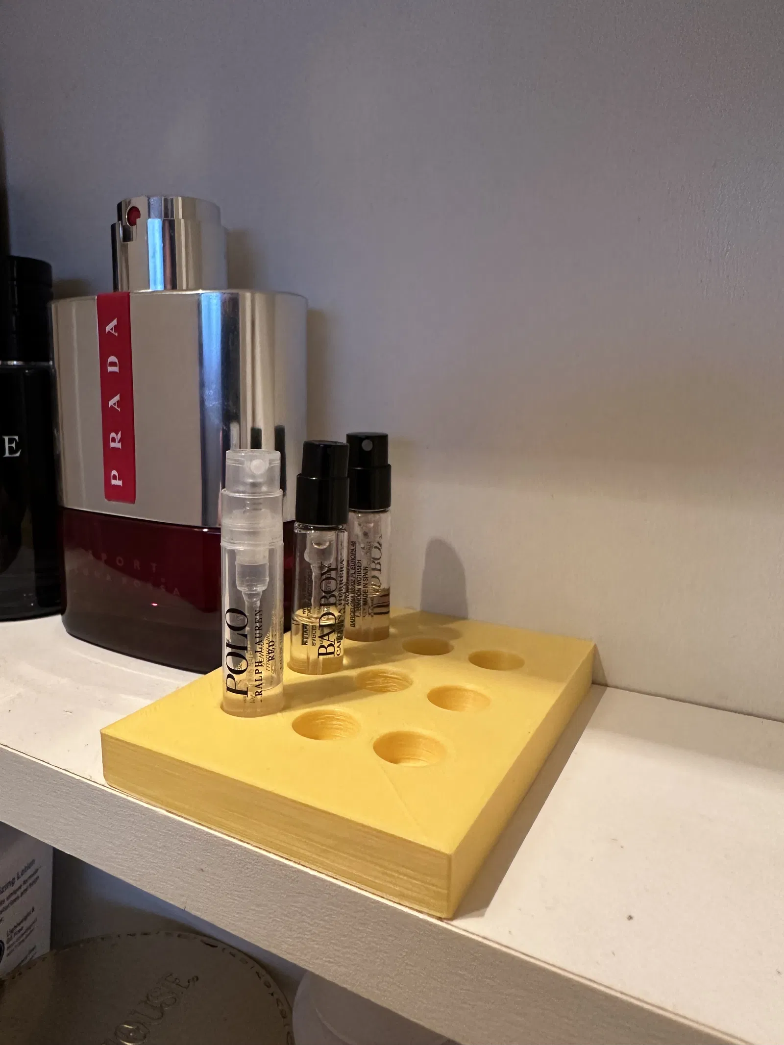 Mệt mỏi vì mẫu nước hoa lăn lộn trong tủ? Đã thiết kế một cái kệ đơn giản để giữ chúng đứng thẳng. Kích thước 3.5" x 2.5", phù hợp với tủ phòng tắm Mỹ. Giữ mẫu đứng vững mà vẫn nhìn rõ tên. Làm tốt với mẫu ngắn/rộng, cũng dùng được với mẫu cao/mỏng. Có thể làm riêng cho mẫu mỏng nếu cần!