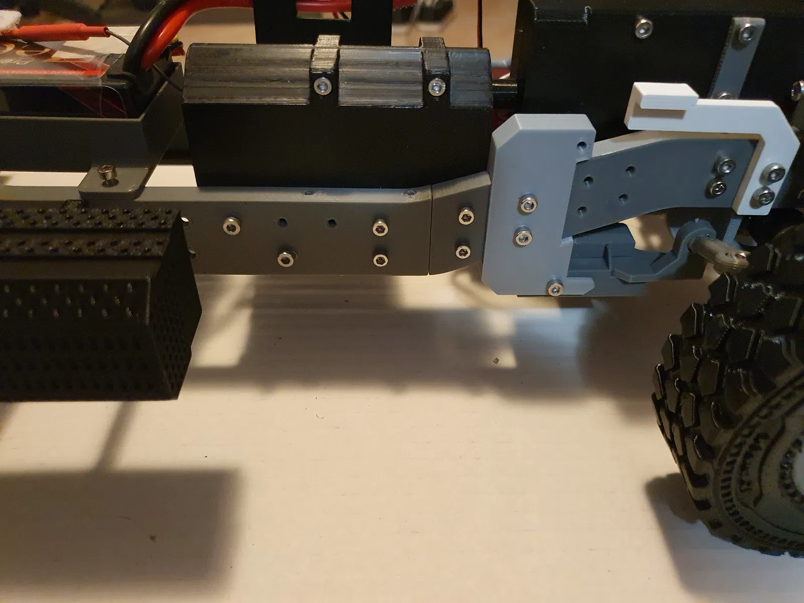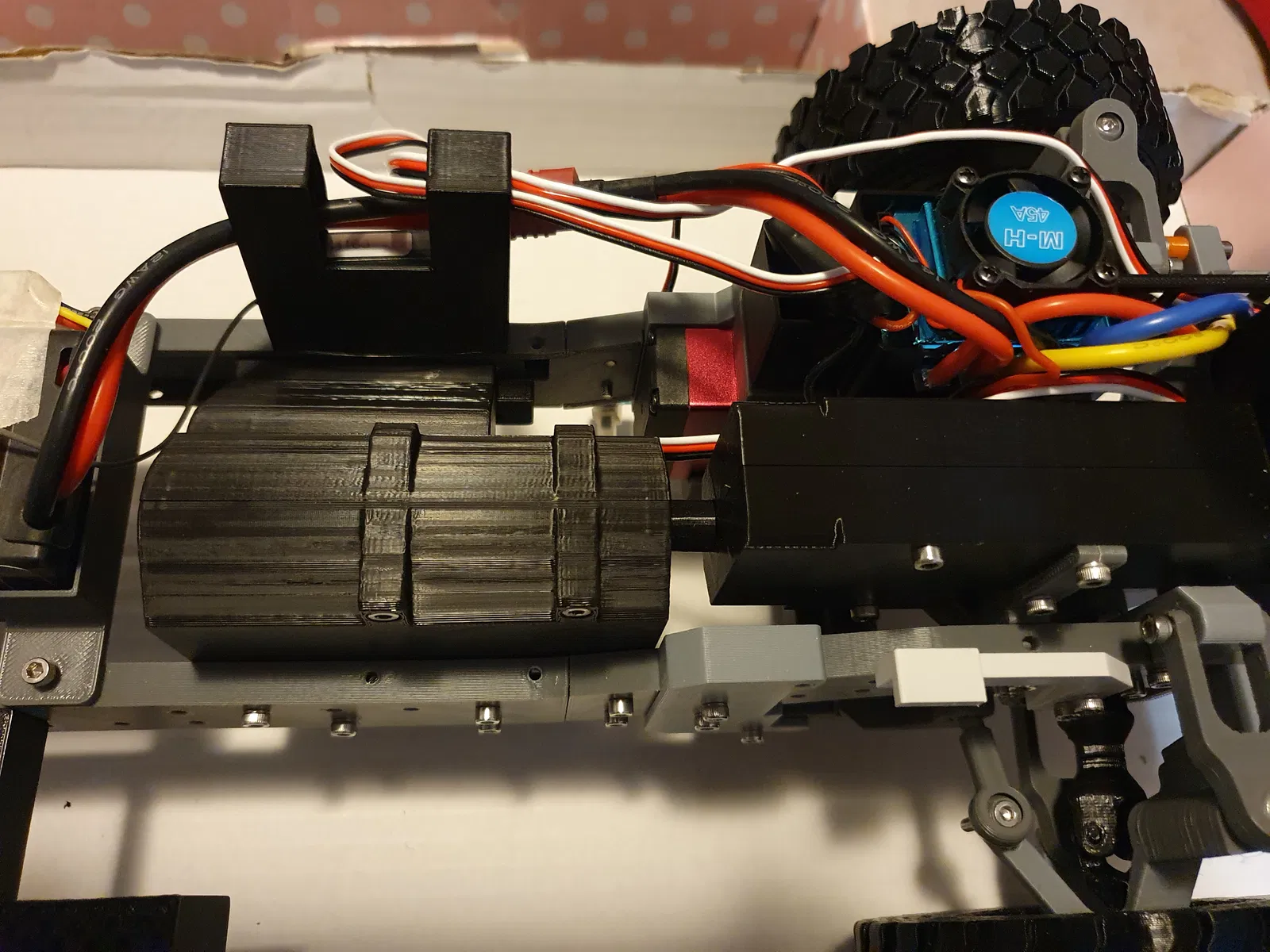 Ở tốc độ 6500 vòng/phút (tốc độ vòng quay tối đa của động cơ 2216 880KV ở 2S) từ động cơ, bánh xe chỉ quay ở tốc độ 100 vòng/phút. Cùng với vi sai chống trượt, xe tải sẽ có khả năng vận hành địa hình tốt hơn.