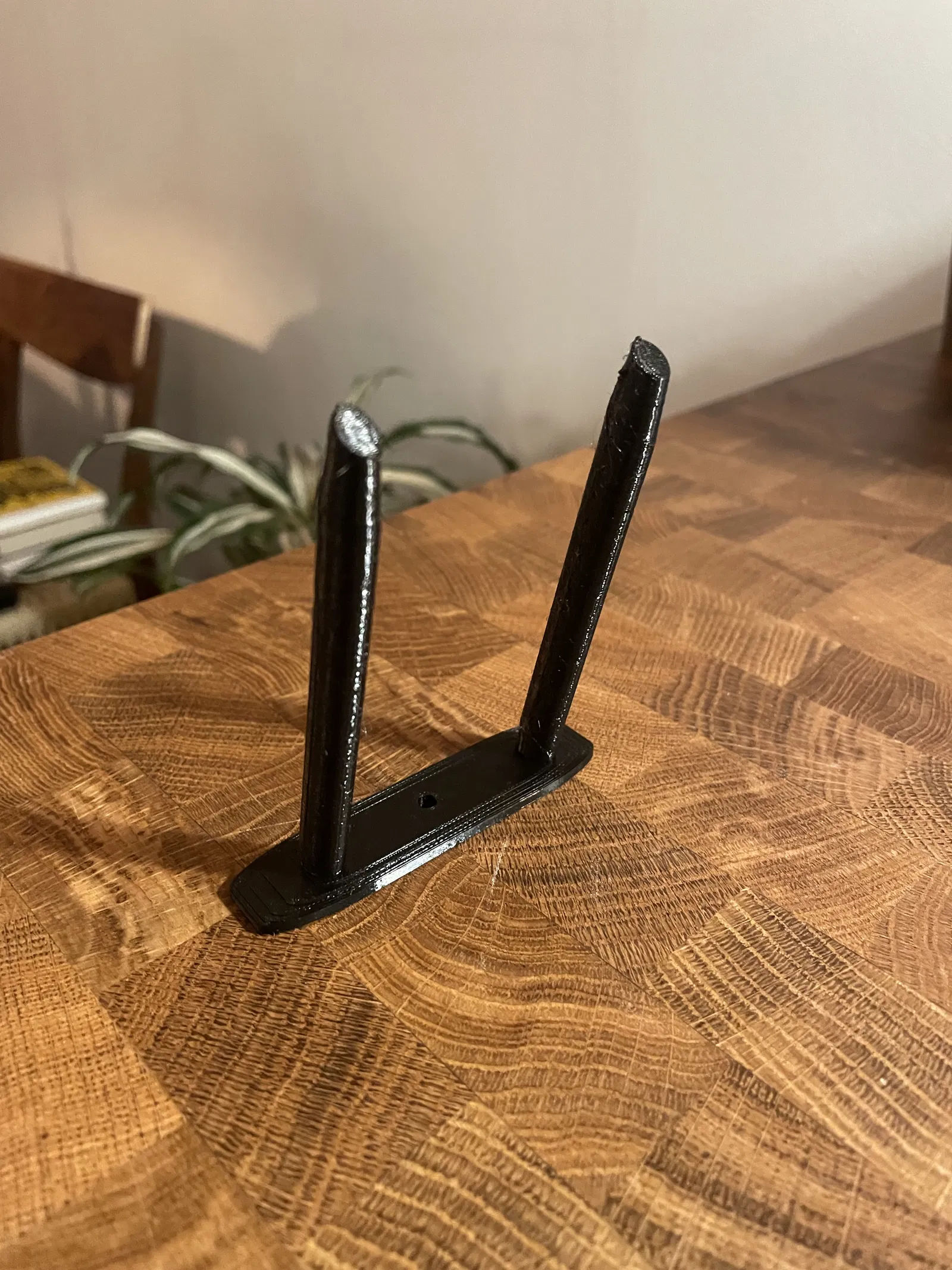 Cái giá treo tường này có thể dùng để treo một con rối Wayang của Indonesia. Khoảng cách giữa hai móc treo là 4,5 cm.