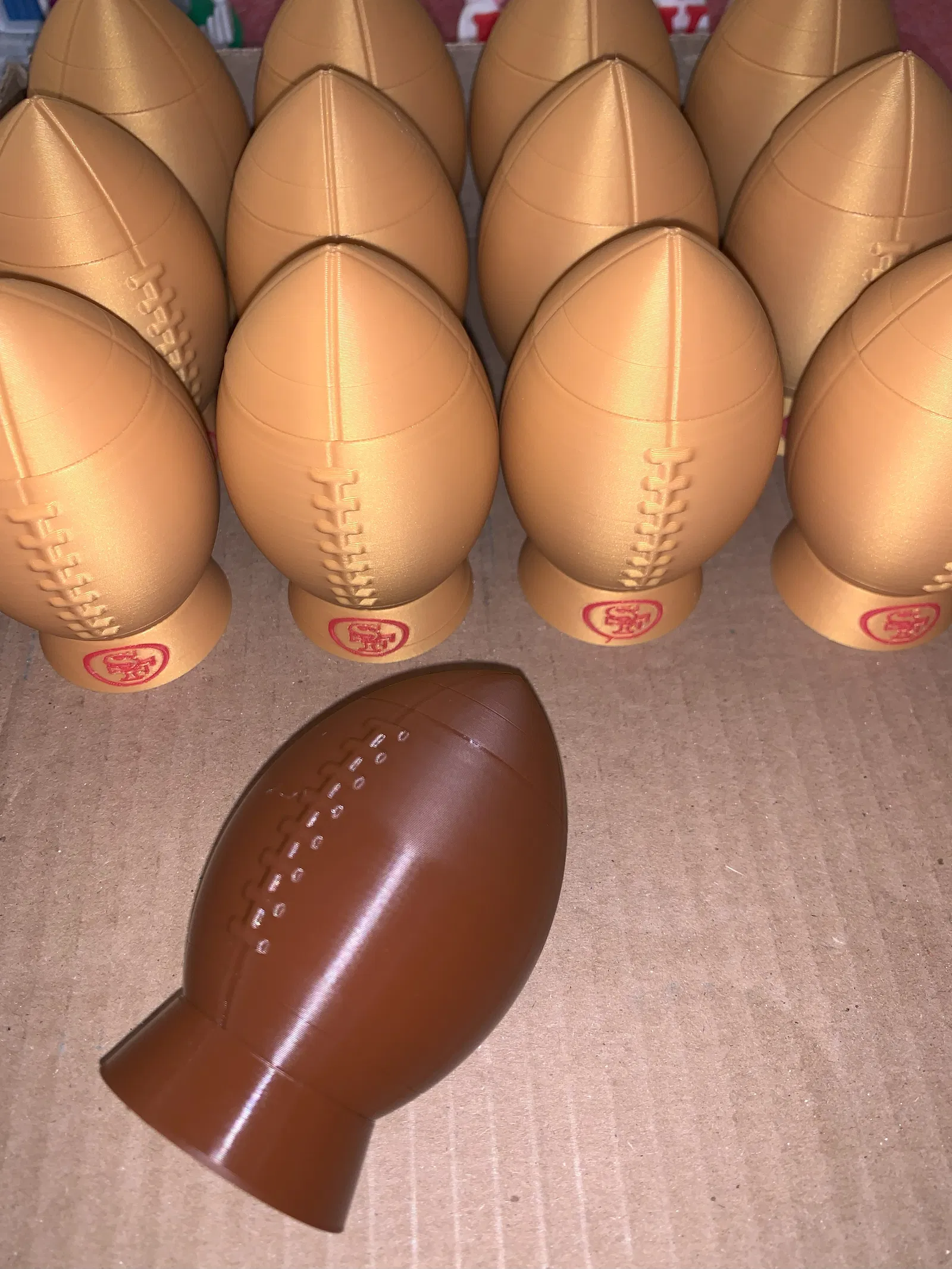Tui muốn có một ly chụp hình/ly uống rượu nhỏ hình trái banh để xài một lần cho Super Bowl. Cái này cũng có thể dùng để đựng kẹo hoặc đồ ăn vặt. Có thể tùy chỉnh cho các đội thể thao khác nhưng có sẵn mẫu cho 49ers và Chiefs. Nếu cái chốt không vừa thì chỉnh kích thước nhỏ lại 1%.