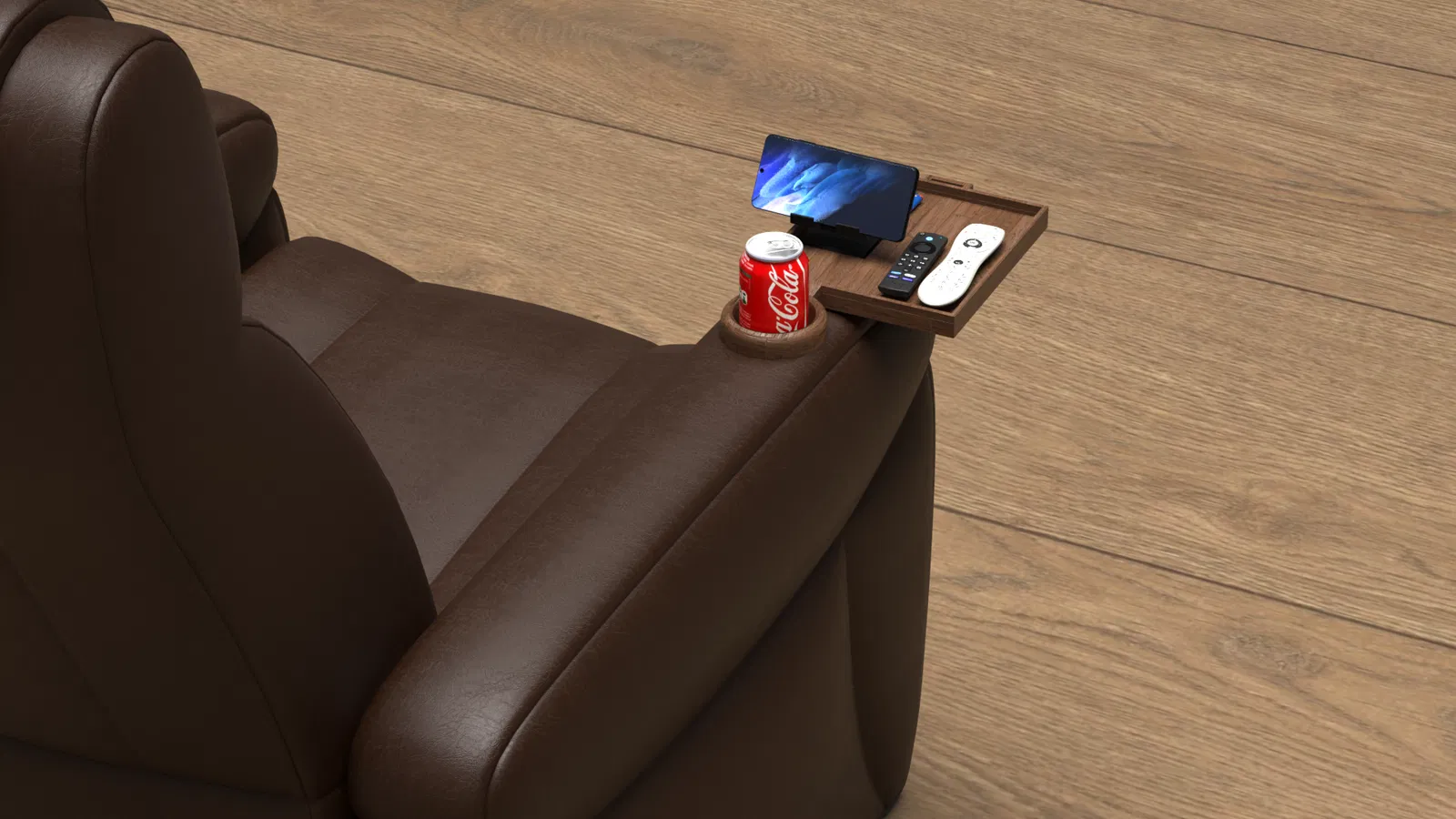Một khay đựng đơn giản dành cho ghế thư giãn, có chỗ để remote và giá đỡ điện thoại. Phiên bản cập nhật còn có thêm khay đựng bật lửa và các cạnh được bo tròn, phù hợp với các loại lon 0.25L và 0.33L.