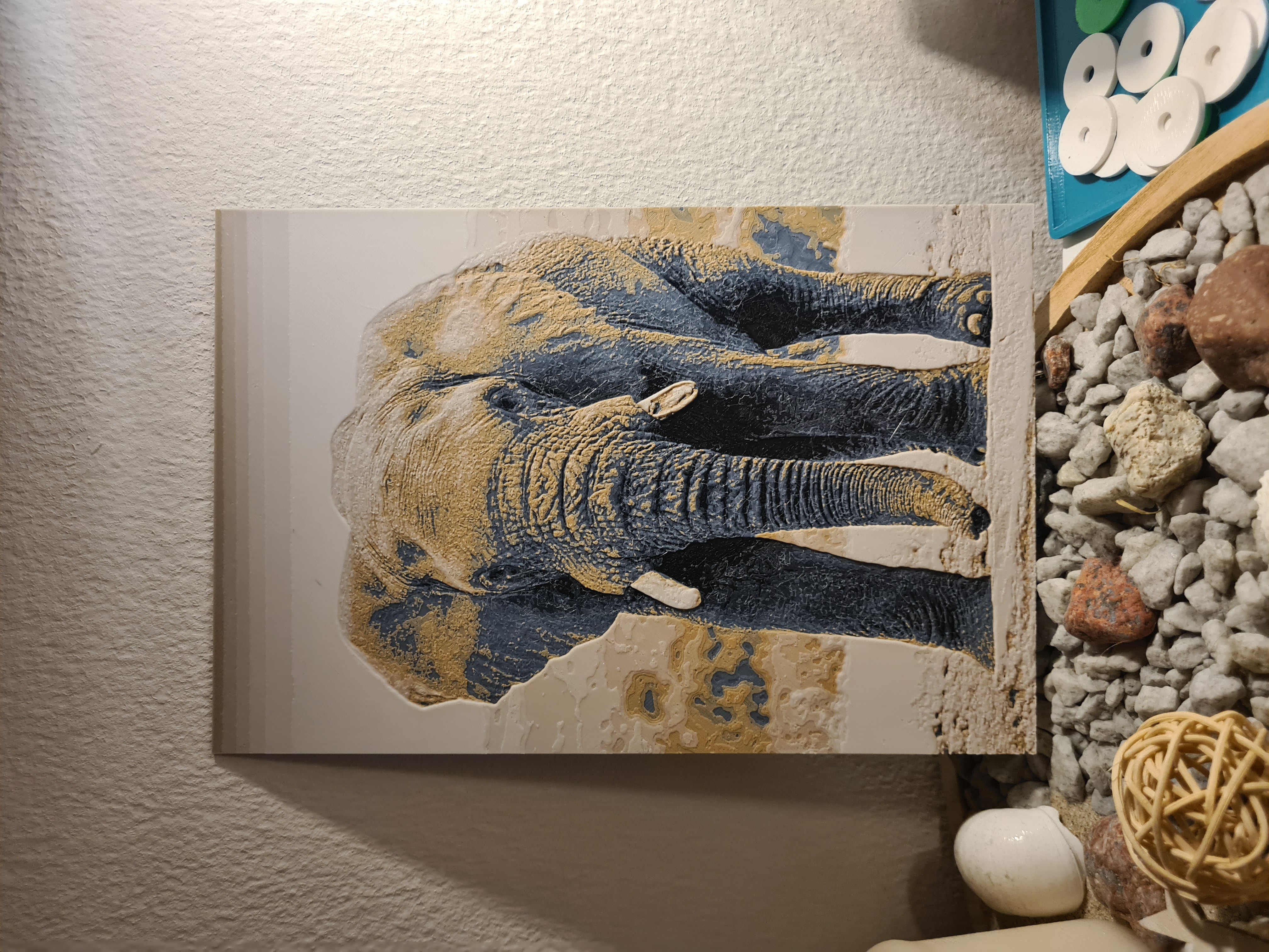 In mô hình Hueforge hình con voi này bằng PLA+. Hướng dẫn chi tiết các lớp đổi màu filament, từ Black, Blue Gray, Latte Brown đến Jade White, cho ra sản phẩm in 3D độc đáo.