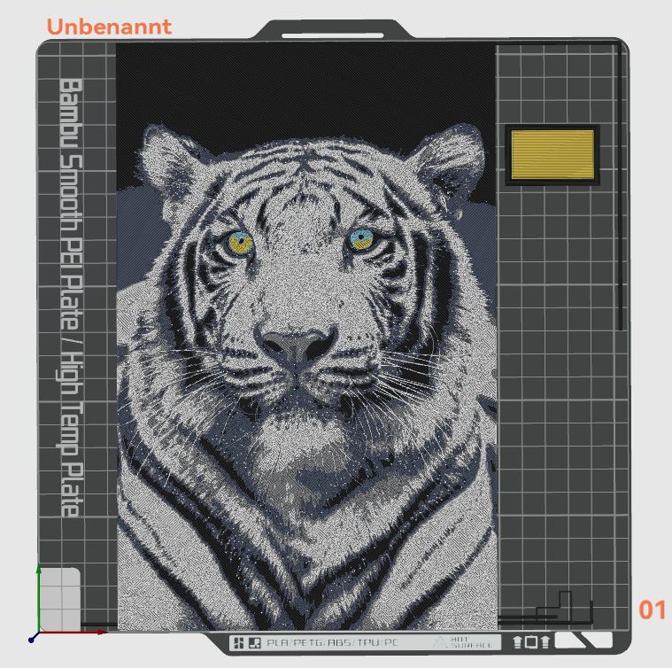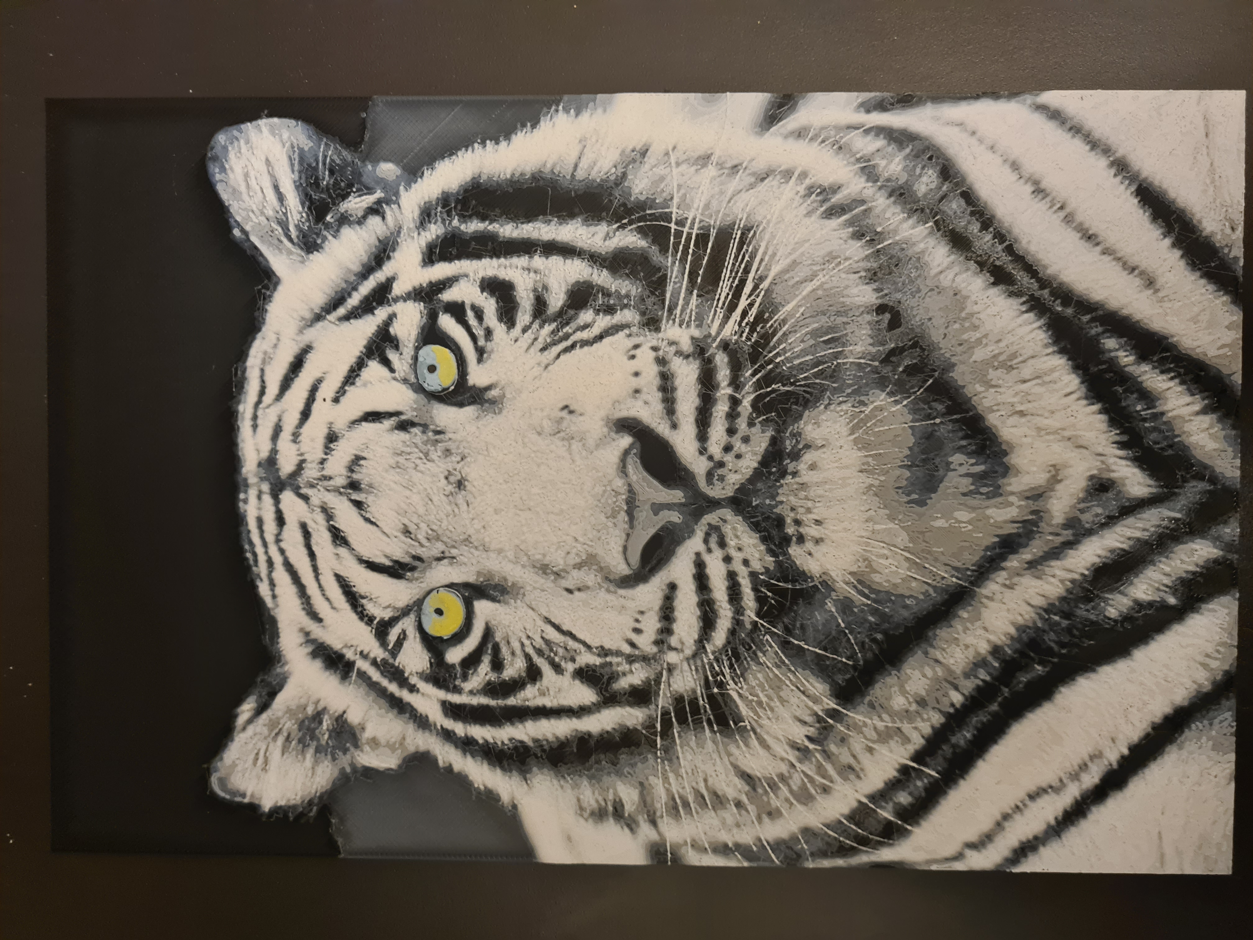 Chi tiết mô hình Hueforge Hổ Trắng V2, hoàn hảo cho bộ sưu tập của bạn. In ở chế độ 100% infill, lớp dày 0.08mm và lớp nền 0.16mm. Sử dụng PLA+ Sunlu Black Transmi.