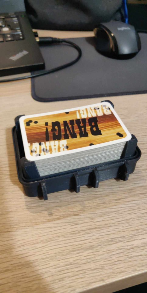 Hộp đựng bài BANG! này được thiết kế dựa trên mẫu hộp UNO cứng cáp của Markus_p. Kích thước bên trong đã được điều chỉnh cho vừa với bộ bài BANG!, sử dụng chốt thay vì ốc vít để lắp ráp.
