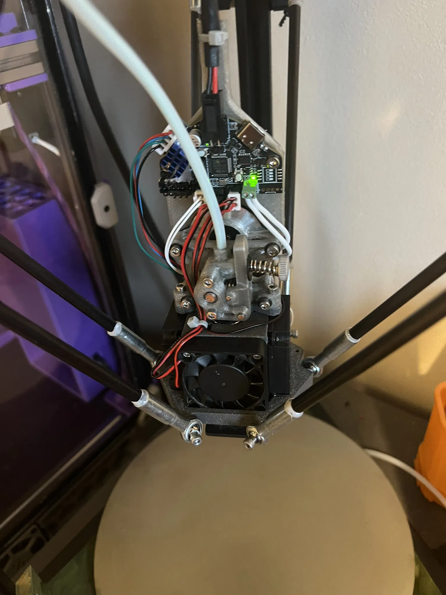 Rất khuyến khích sử dụng bản remix của plate effector của mình để tăng độ cứng, đối phó với áp lực tăng thêm do trọng lượng tăng này lên đầu in. Phiên bản gốc từ thingiverse bị quá mềm và gây ra các hiện vật trên bề mặt in cũng như lớp đầu tiên không ổn định.