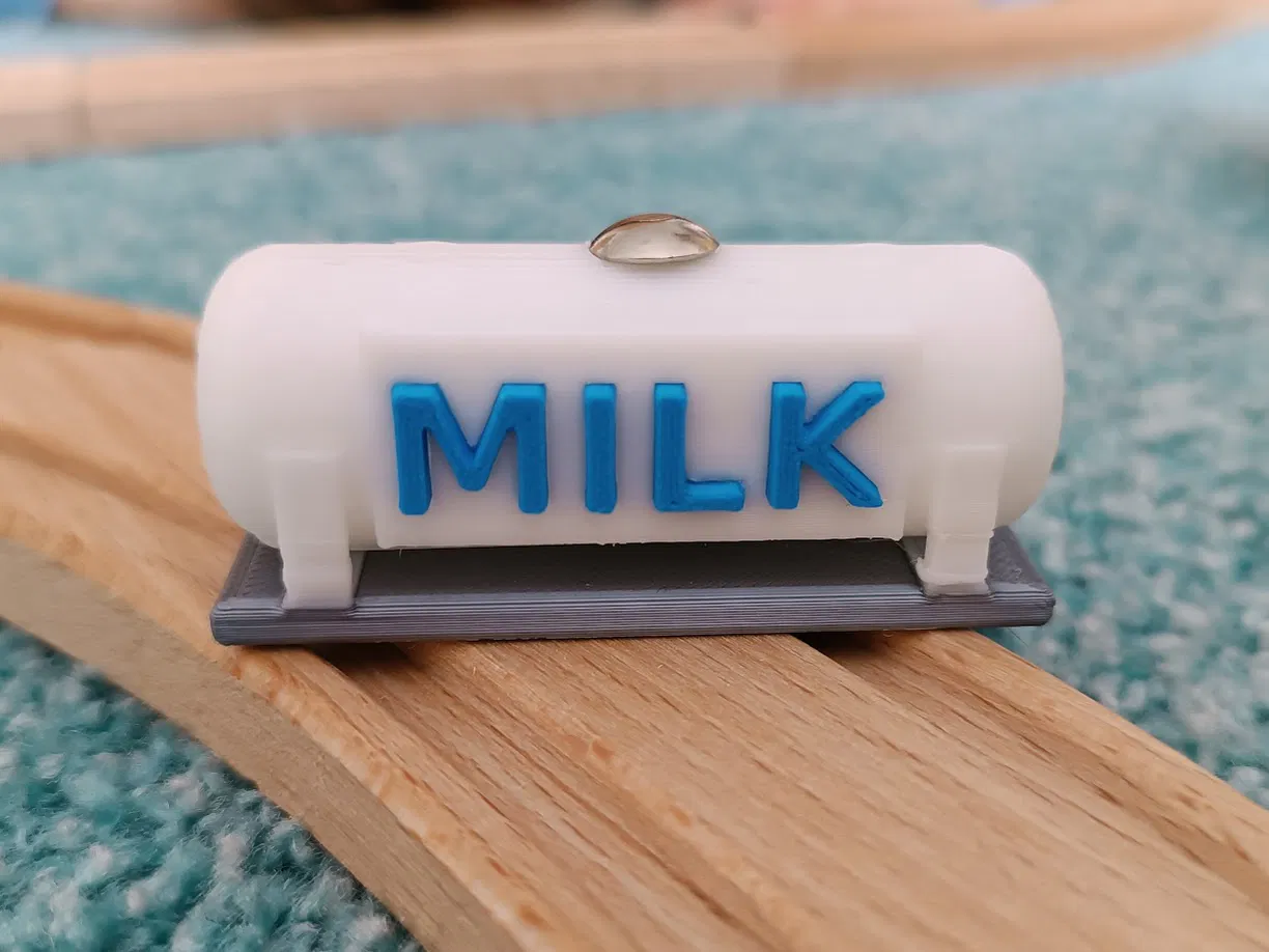 Mô hình thùng sữa làm phụ kiện cho xe lửa gỗ, in bằng PLA. Hướng dẫn chi tiết cách in và lắp ráp, lưu ý an toàn khi sử dụng nhiệt để gắn mộng và các phụ kiện khác.