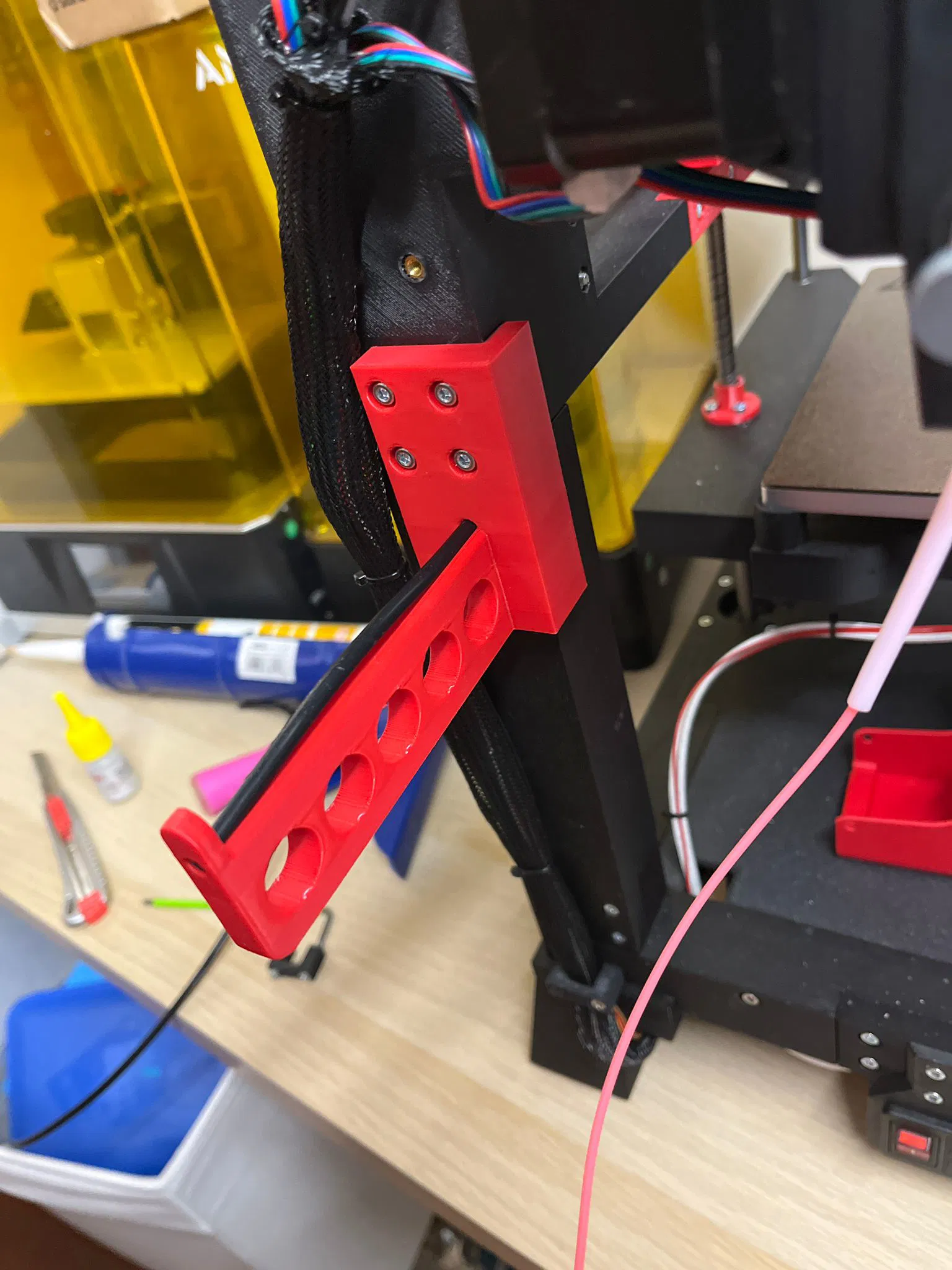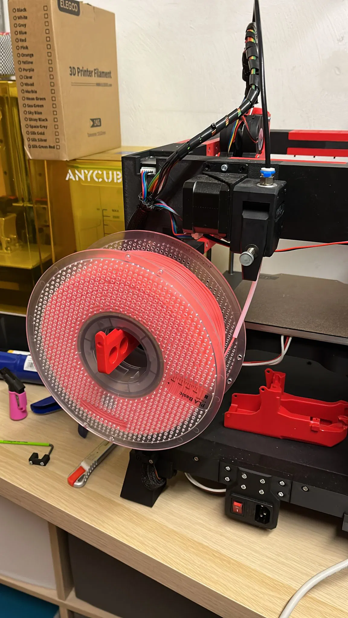 Tui có thiết kế cái chỗ giữ cuộn dây tóc (filament spool holder) nè, gắn vừa với khung tiêu chuẩn của máy The 100 luôn.