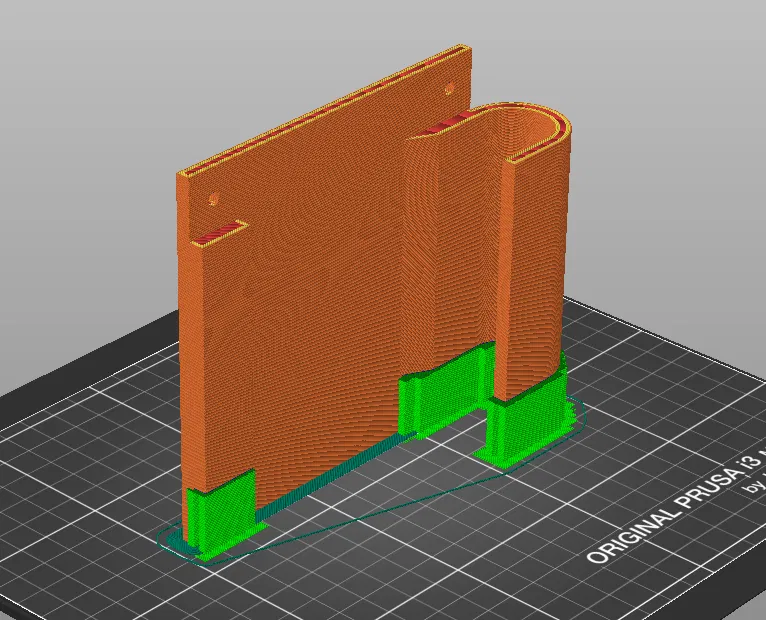 Tôi đã in bằng PETG và đặt nằm nghiêng với 4 lớp ngoại vi (xem hình đính kèm bên dưới) vì tôi tin rằng điều này sẽ mang lại sự ổn định tốt hơn. Cũng thêm giá đỡ và viền để bám dính tốt hơn với mâm in.