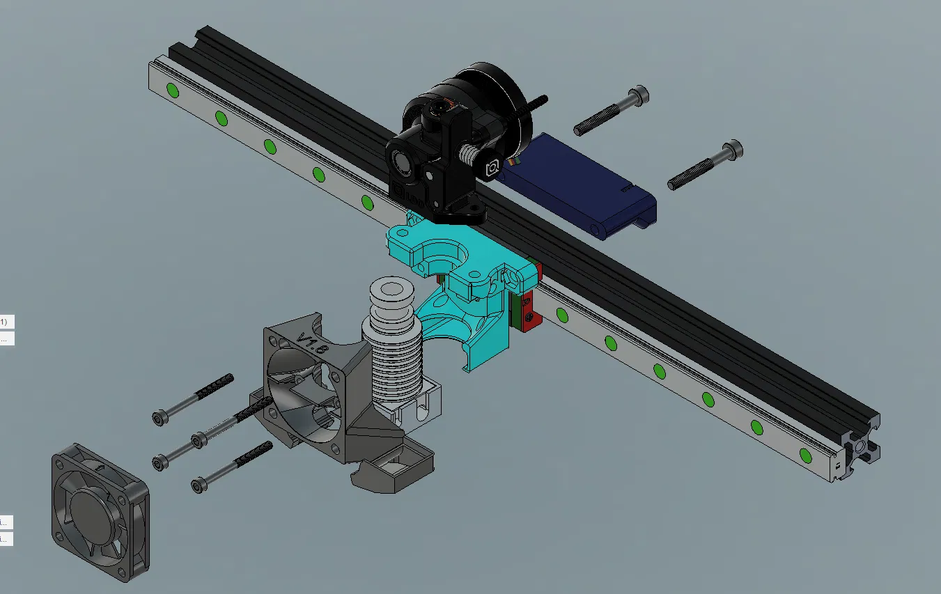 Bộ phận đai trục X được gắn ở phía trên ray trượt, gần khối lượng lớn nhất trên xe đẩy, đó là động cơ bước của bộ đùn. Lực xoắn tạo ra rất ít vì độ rộng của bộ phận gắn đai vào xe đẩy. Tiếp theo, bộ đùn V6 được gắn trực tiếp vào khối ray 12H bằng 4 con ốc 35mm. Điều này tạo ra khung in 3D chắc chắn nhất có thể cho bộ đùn V6, hết ý kiến.