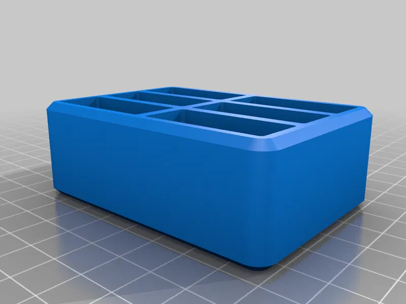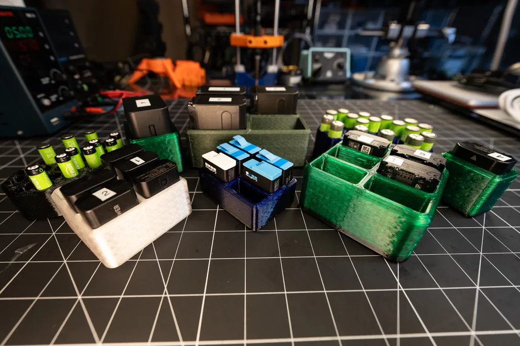Đế đựng sáu cục pin cho GoPro Hero 10 và 12, giúp phân biệt pin đầy hay hết dựa vào cách xoay. In bằng PETG với đầu phun 0.8. Có link tải file CAD trên Onshape.