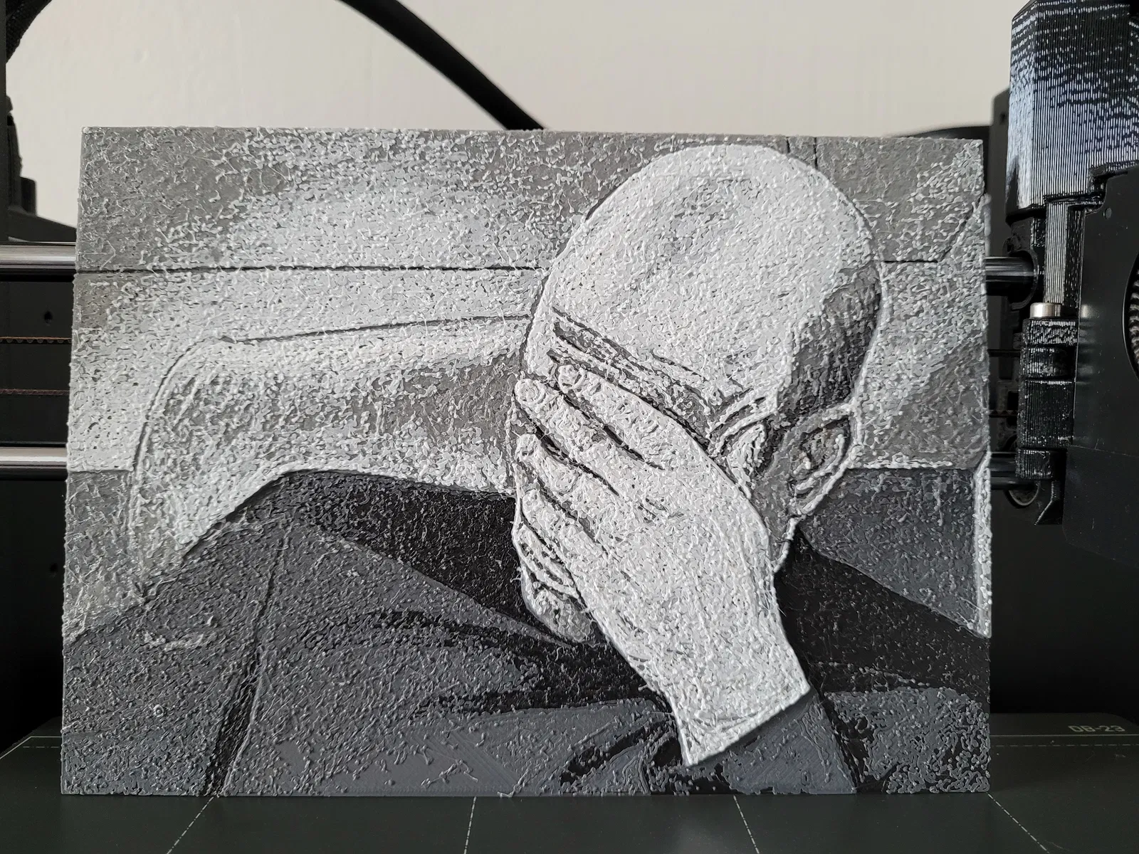 Mô hình Hueforge "Picard facepalm" mang tính biểu tượng, hoàn hảo để treo tường. Hướng dẫn chi tiết về cài đặt in và đổi màu filament, bao gồm các loại PLA JAYO và GEETECH, sẽ giúp bạn tạo ra một tác phẩm nghệ thuật độc đáo. Thích hợp cho fan Star Trek.