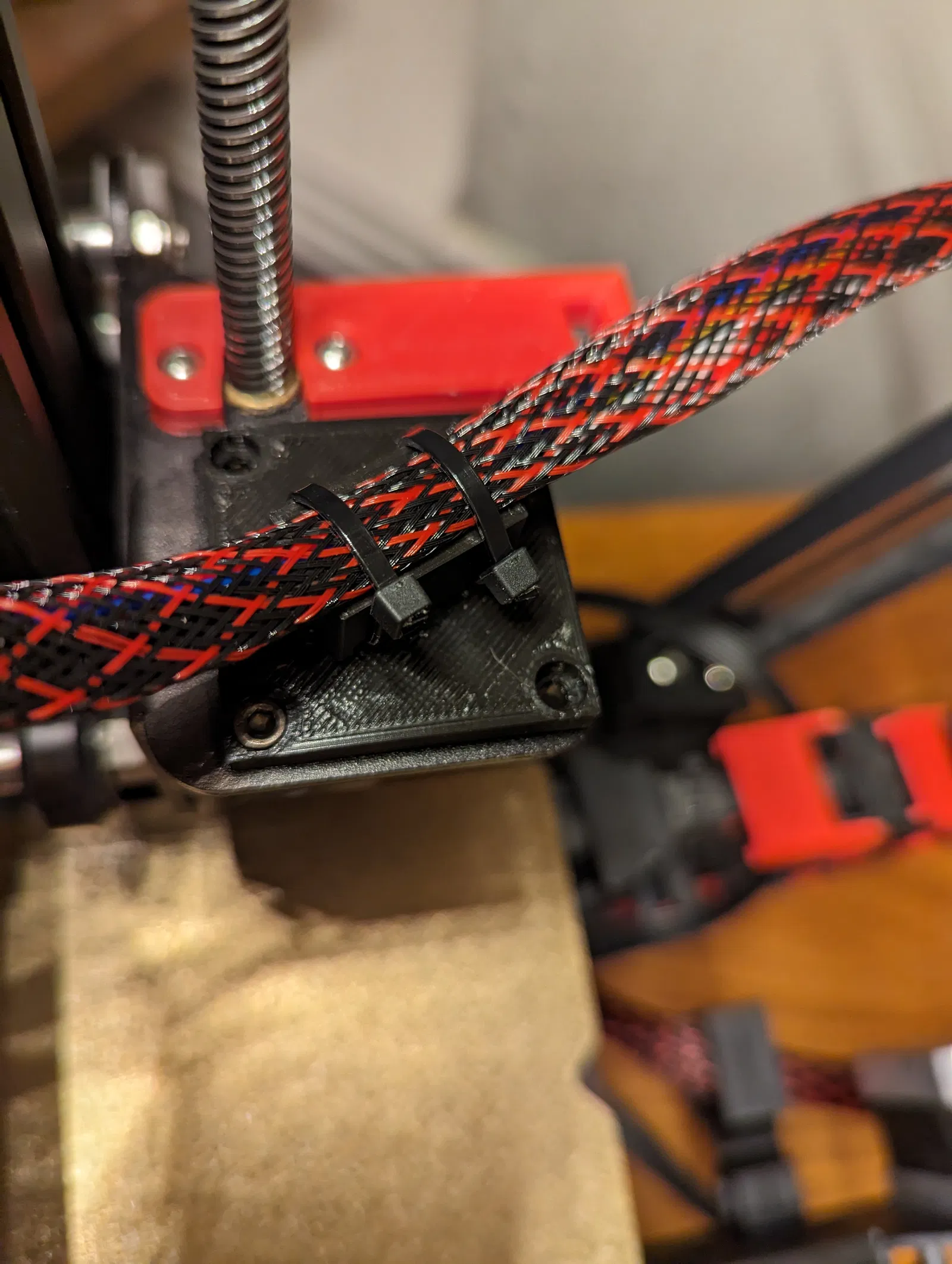Đây là một bộ phận giữ và kẹp cáp cho Ender 3 với bộ đùn trục trực tiếp (direct drive extruder). Bộ phận này được bắt vít vào tấm gắn động cơ của bộ đùn Bowden cũ. Một vòng bi nhỏ được gắn vào bộ phận và một trục có nắp gắn bộ phận này với bộ giữ cáp. Điều này cho phép bộ giữ cáp xoay theo chuyển động của đầu nóng (hot-end). Nó cũng giữ cho dây cáp của đầu nóng và động cơ đùn không bị vướng và đi theo đường thẳng với các bộ phận điện tử. Tôi đã in các bộ phận bằng nhựa PLA với mật độ 30%.