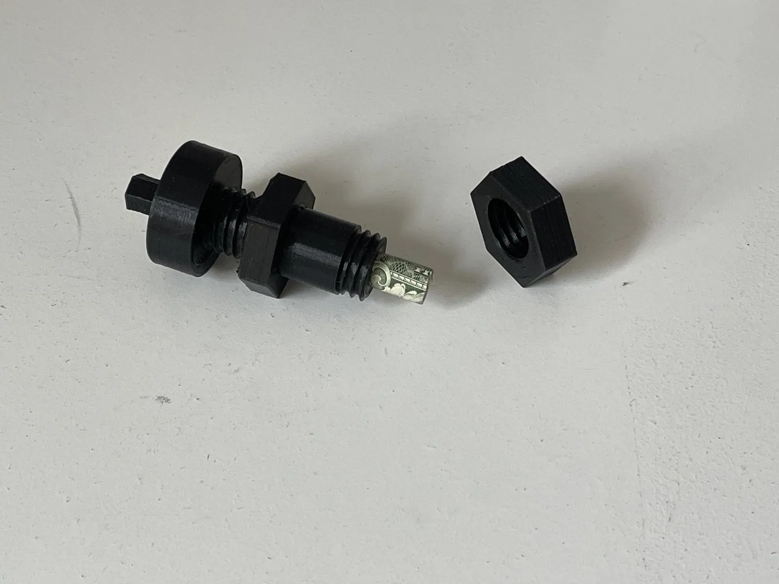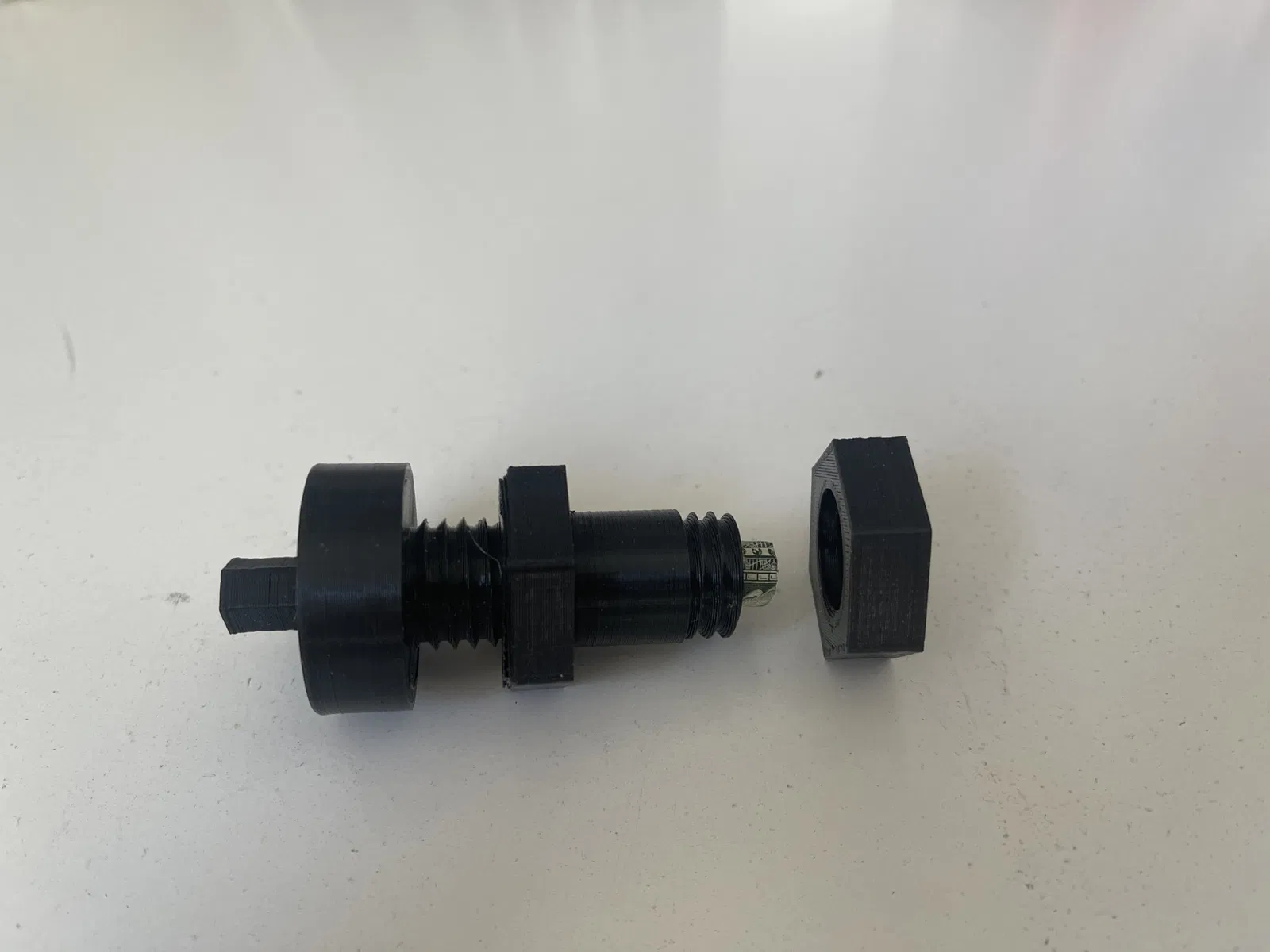 Đai ốc trung tâm có một ren bên phải tiêu chuẩn và là một cái hố thỏ khác. Bộ lắp ráp được in theo chiều dọc. Đai ốc hex trung tâm được in cao hơn đĩa 0,4 mm. Để giải phóng đai ốc trung tâm sau khi in, tôi đặt đầu tròn hình tròn vào một cái kẹp và xoay đai ốc bằng một cờ lê. Nó đã bật ra với một tiếng "snap" thỏa mãn.