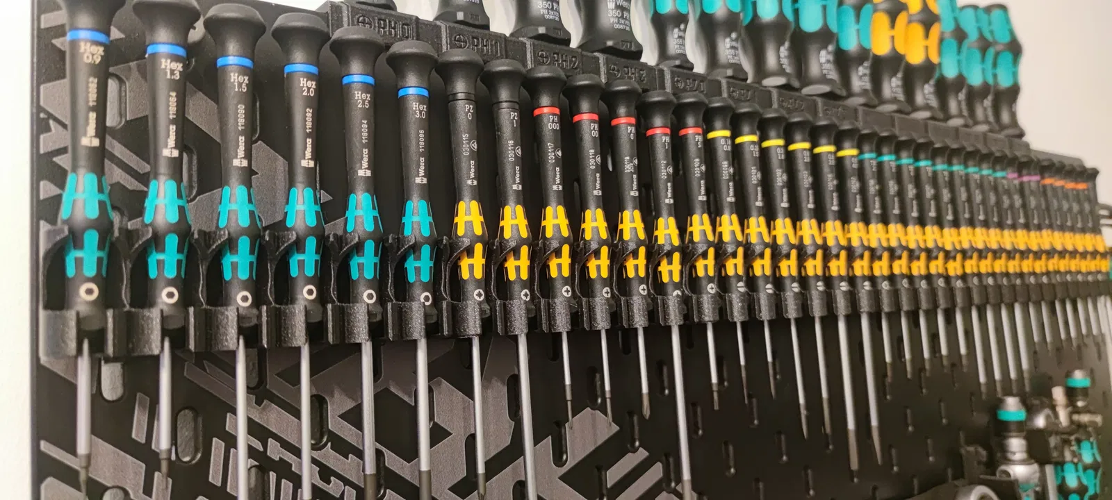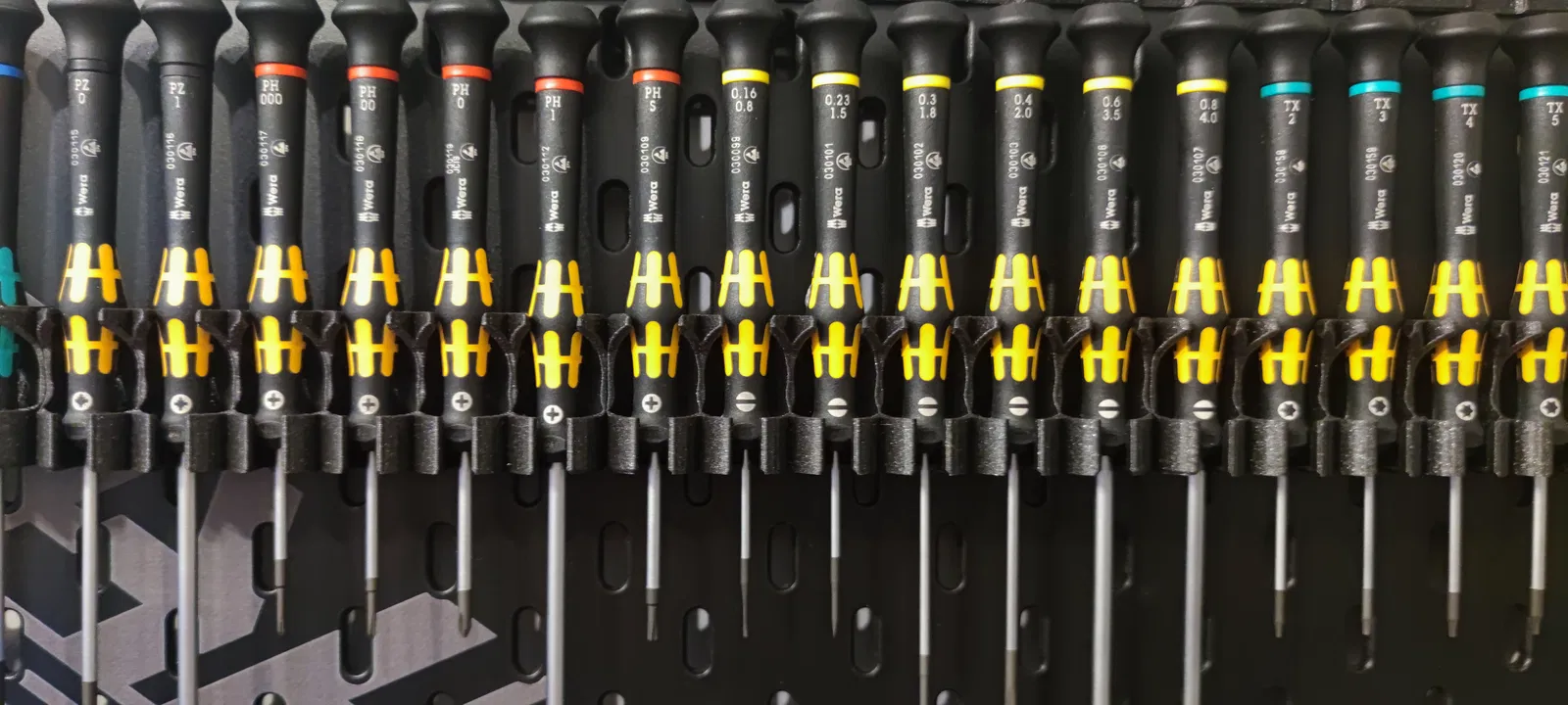Đây là Giá đỡ Skadis cho Tua vít Wera Kraftform Micro với 6 khe. Nó được gắn vào Bảng Skadis bằng Móc đa năng (Universal Hook) nổi tiếng từ CSD_Salzburg (bạn cần in 2 Móc).
