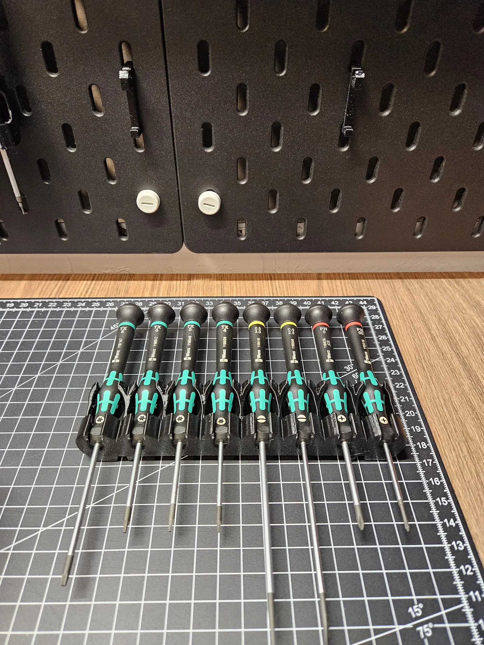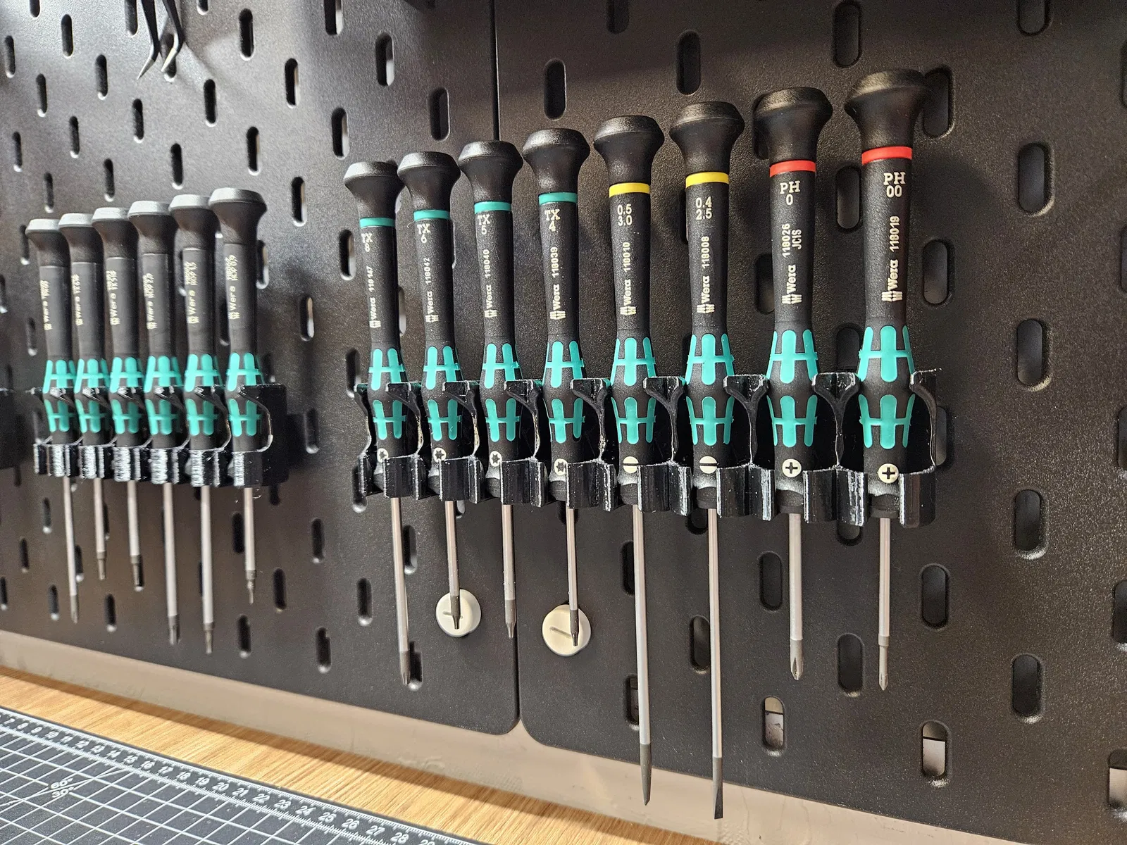 Giá đỡ IKEA Skadis dành cho tua vít Wera Kraftform với 8 khe cắm. Hoàn hảo để sắp xếp gọn gàng các dụng cụ của bạn trên bảng Skadis.