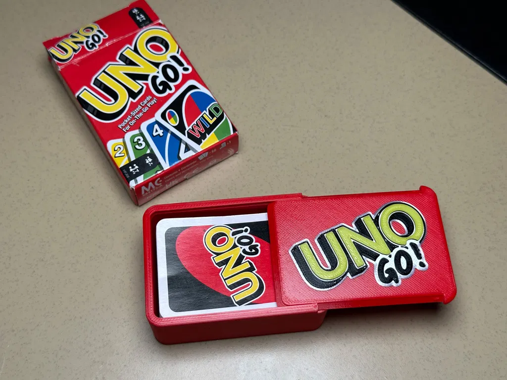 Đây là một cái hộp Uno Go! xịn sò, vì cái nắp trượt của nó giúp lấy bài ra vô dễ dàng. Cái nắp nó gài lại cái 'cạch' luôn và mình có thể in nắp với tối đa 4 màu để ra được cái logo Uno Go! đó nha.