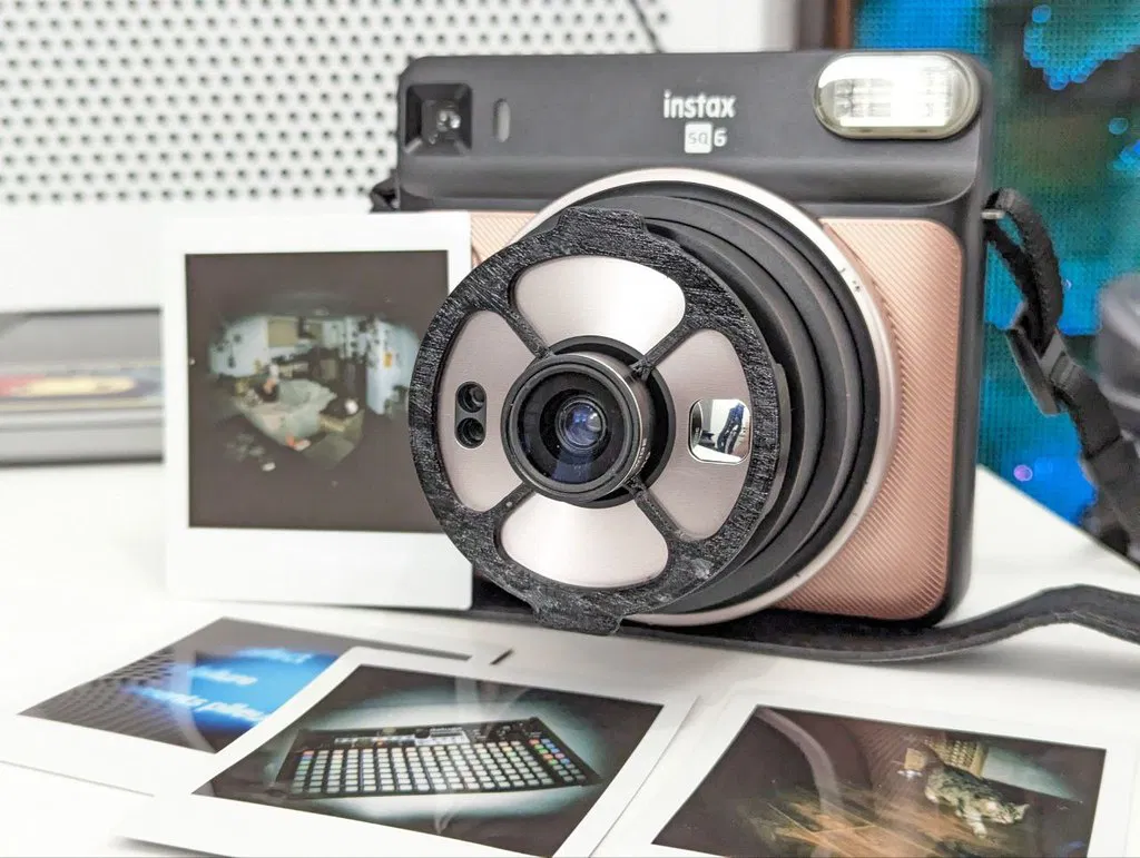 Bộ chuyển đổi nhỏ gọn gắn ống kính mắt cá, macro cho điện thoại. Sử dụng ren M17x1, kẹp chắc chắn. Thiết kế cho Instax SQ6 nhưng có thể tương thích các mẫu khác. Cần vật liệu hỗ trợ khi in. File F3D/STEP có sẵn.