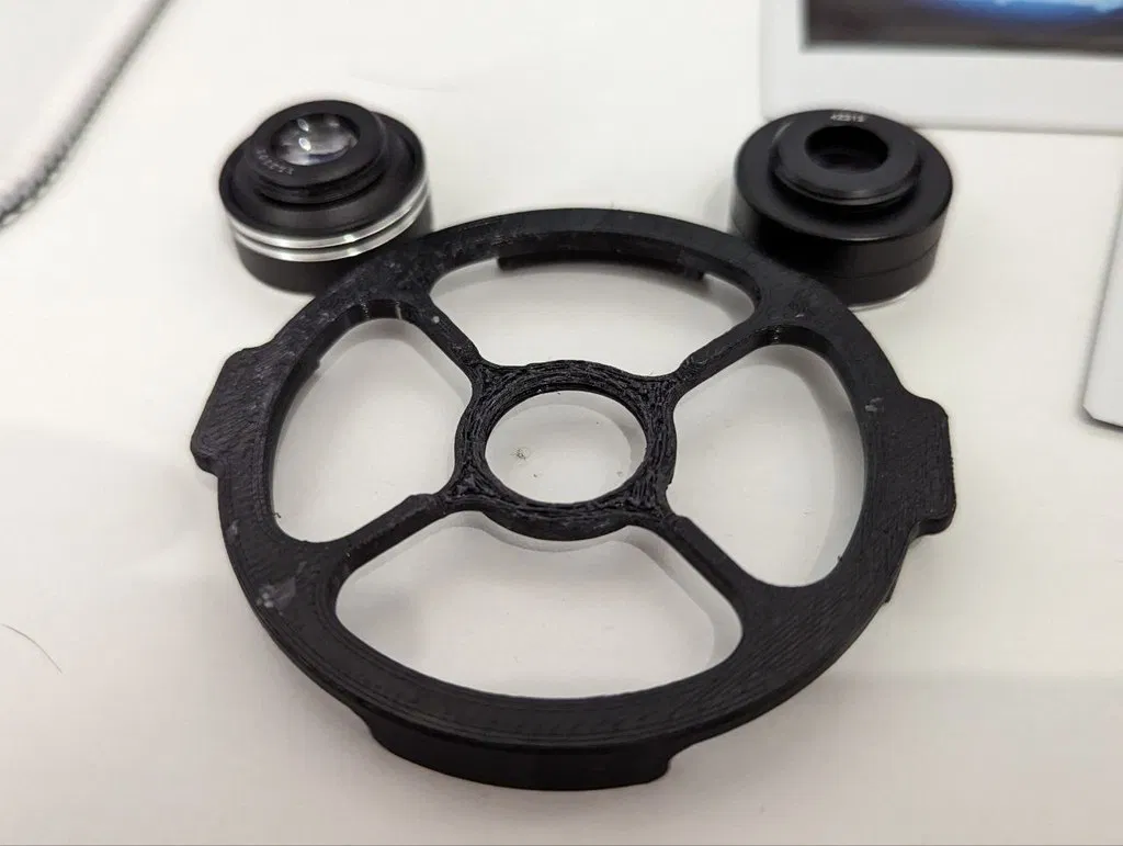 Một bộ chuyển đổi nhỏ để gắn các ống kính mắt cá, macro, v.v. tí hon của điện thoại vào. Chúng sử dụng ren M17x1. Kẹp chắc chắn vào phần mở rộng ống kính phía trước.