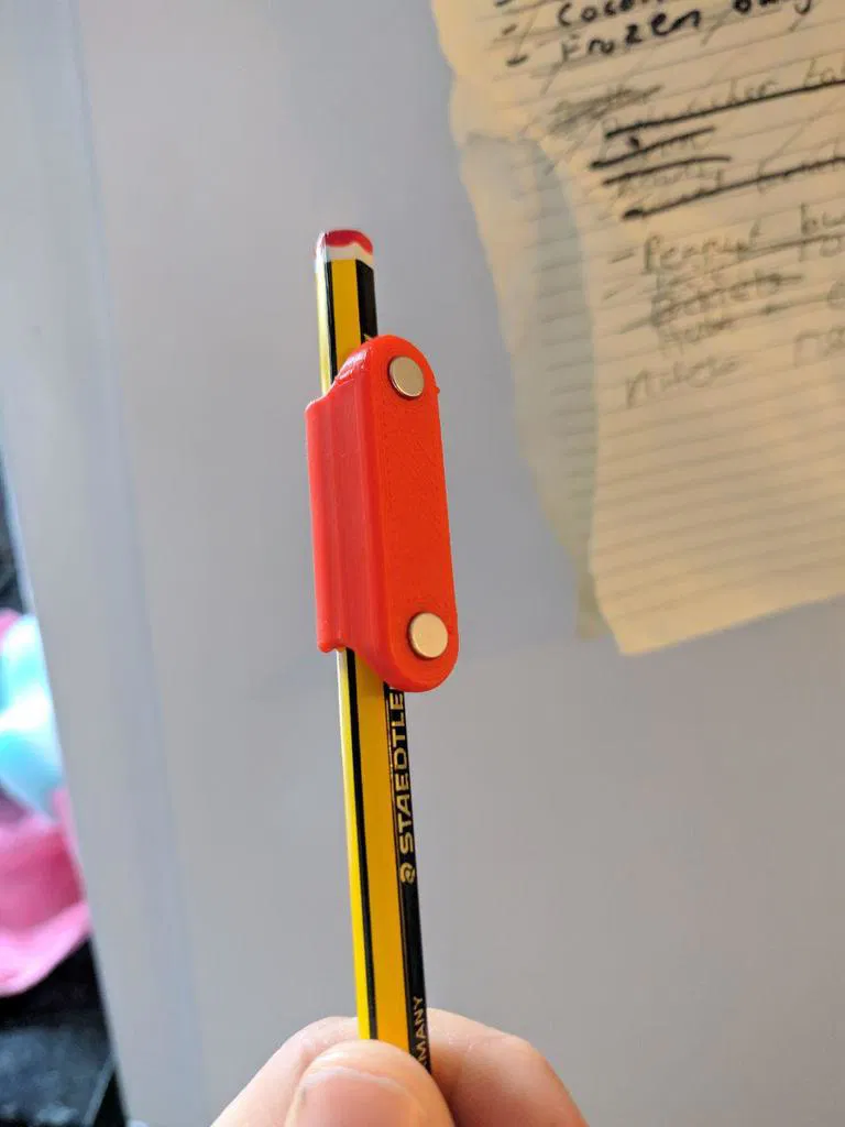 Chỉ có mấy ông xui xẻo mới tốn thời gian đi kiếm cây viết khi cần ghi chú gì đó trên danh sách tủ lạnh. Cần 2 viên nam châm Neodymium 5x2mm và vừa với bút (bút chì) đường kính 8mm. In với lớp dày 0.25mm bằng vật liệu cứng. Ép nam châm vào bản in.