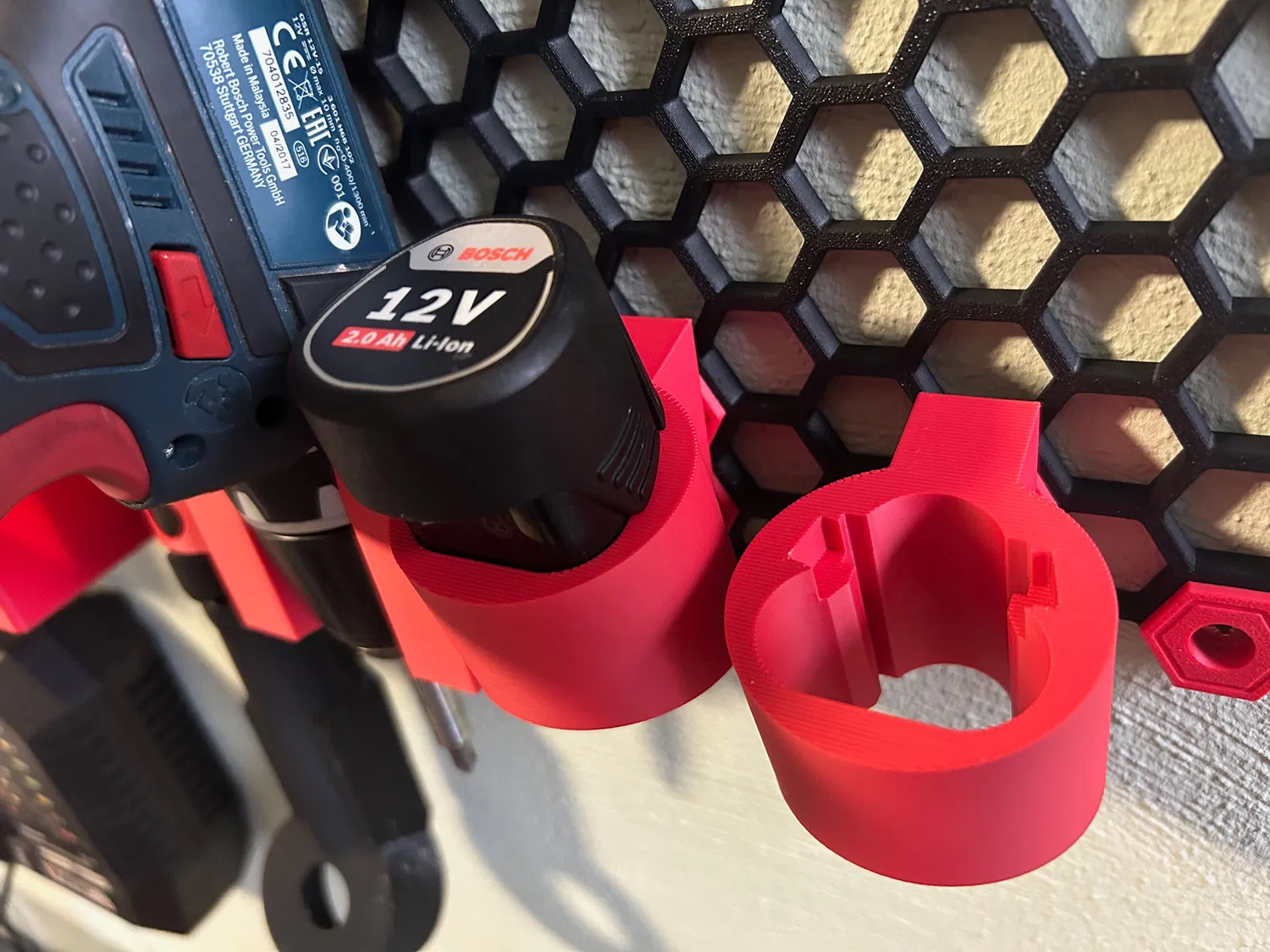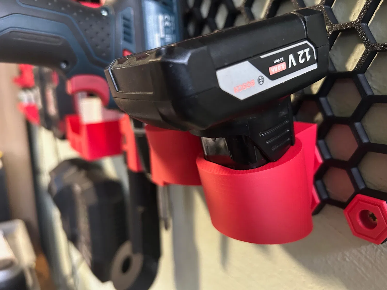 Giá đỡ pin Bosch GSR 12V cho Honeycomstoragewall. Giá đỡ được hơi nghiêng một chút để tiện lợi và ôm sát hoàn hảo.