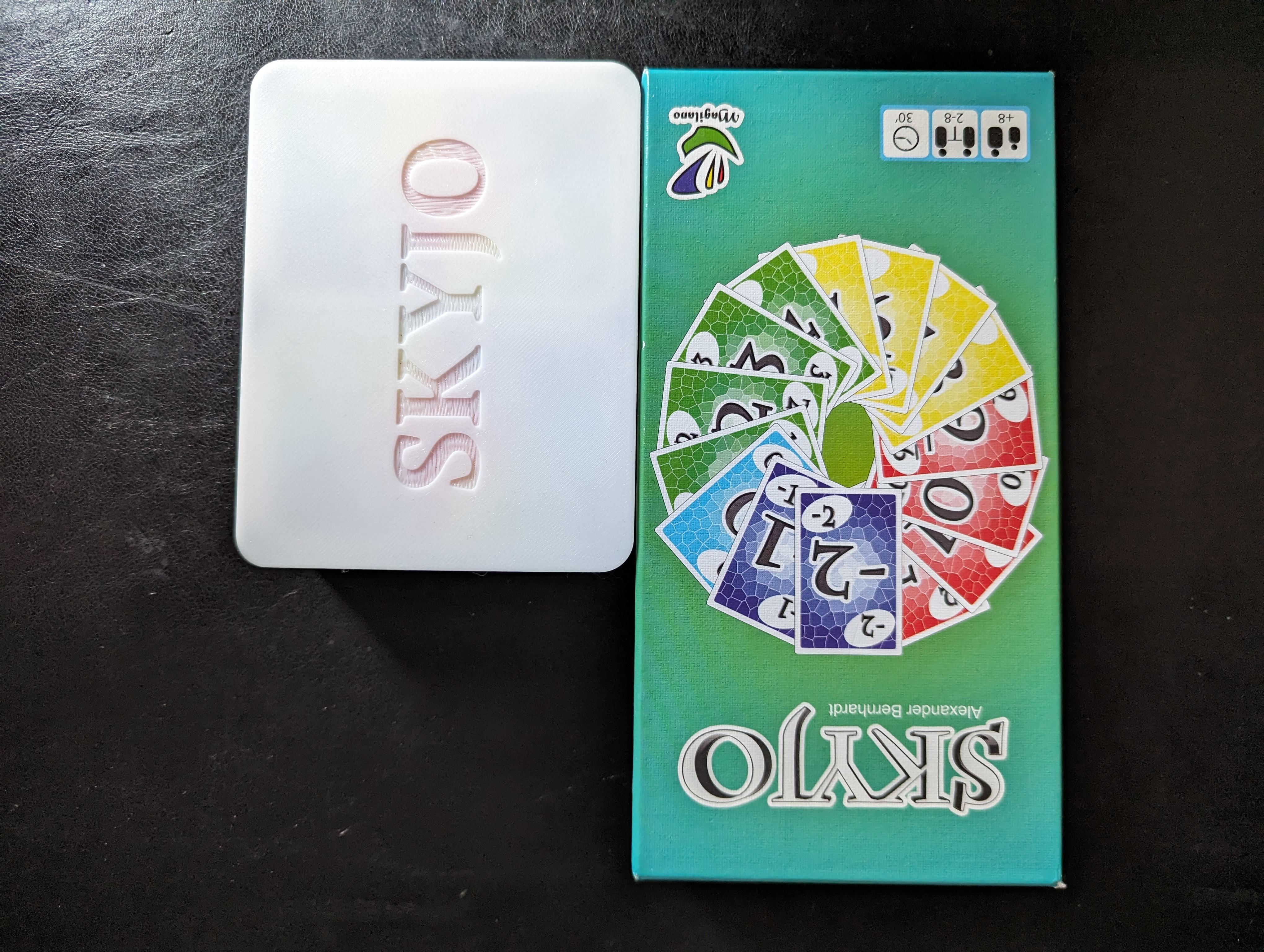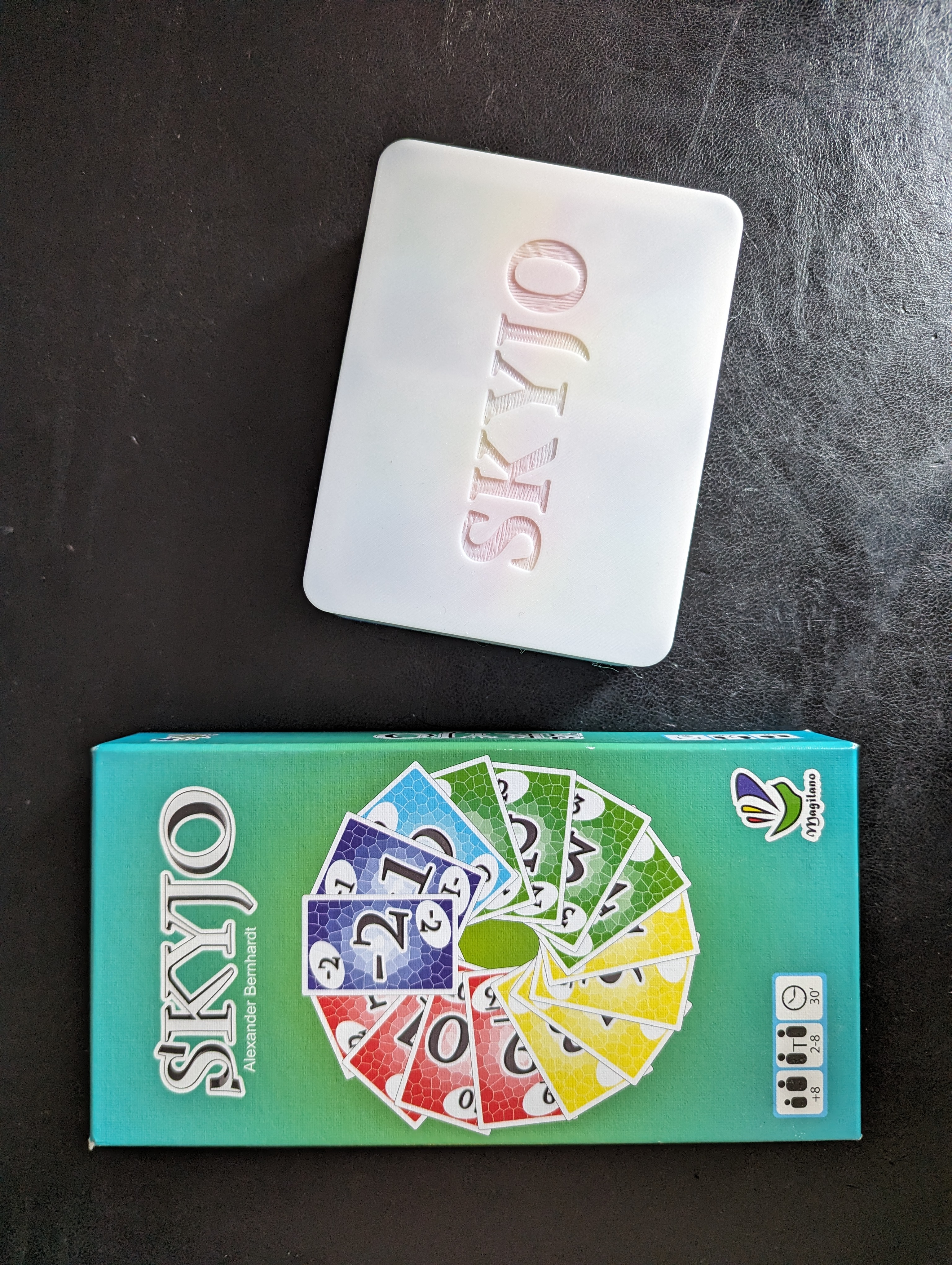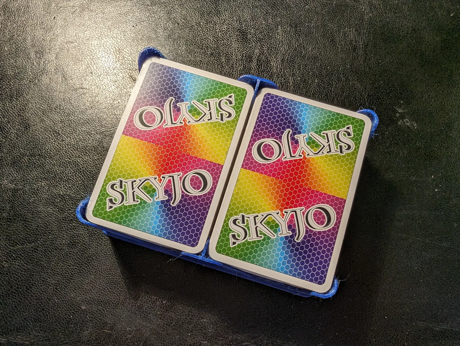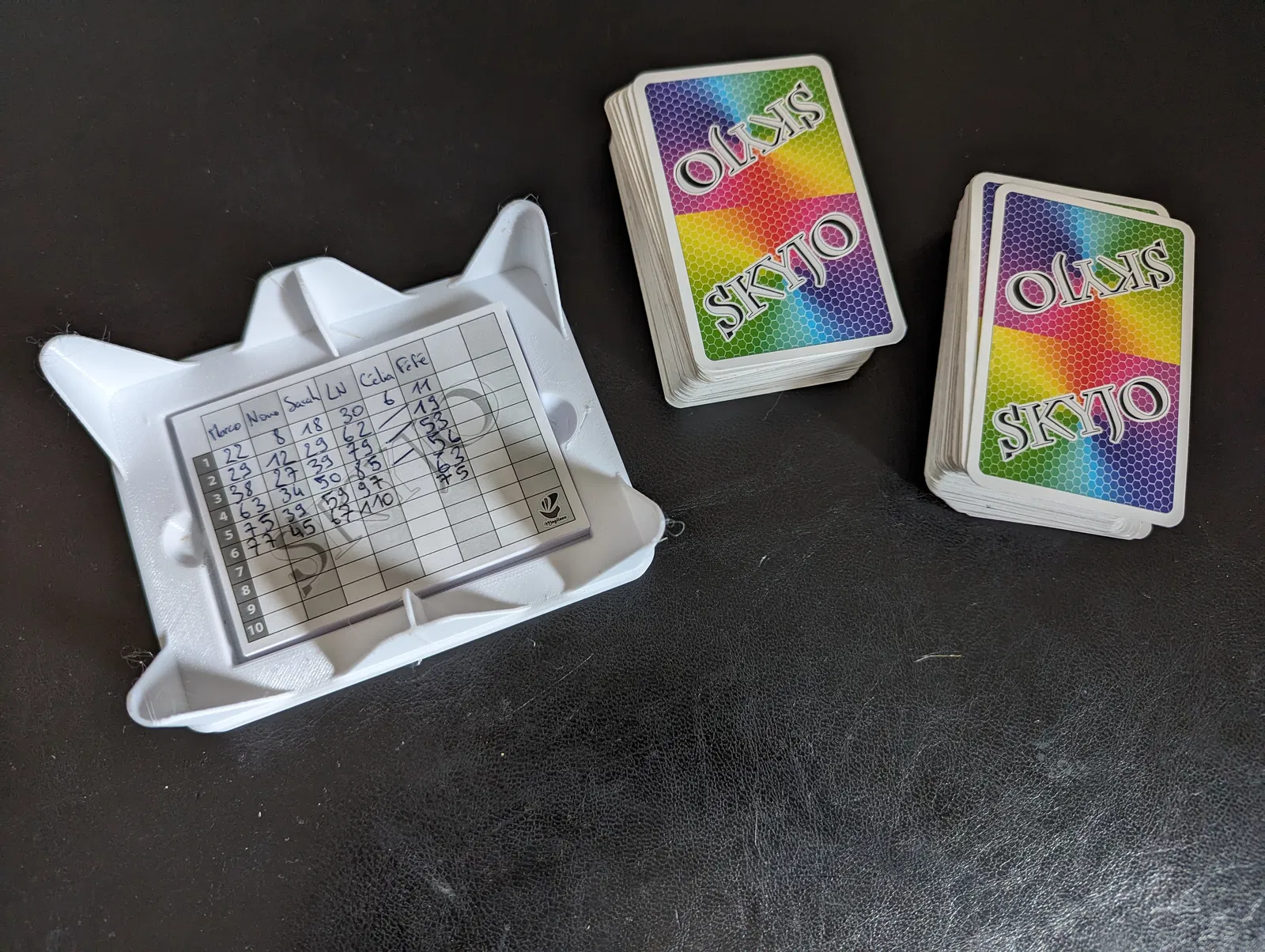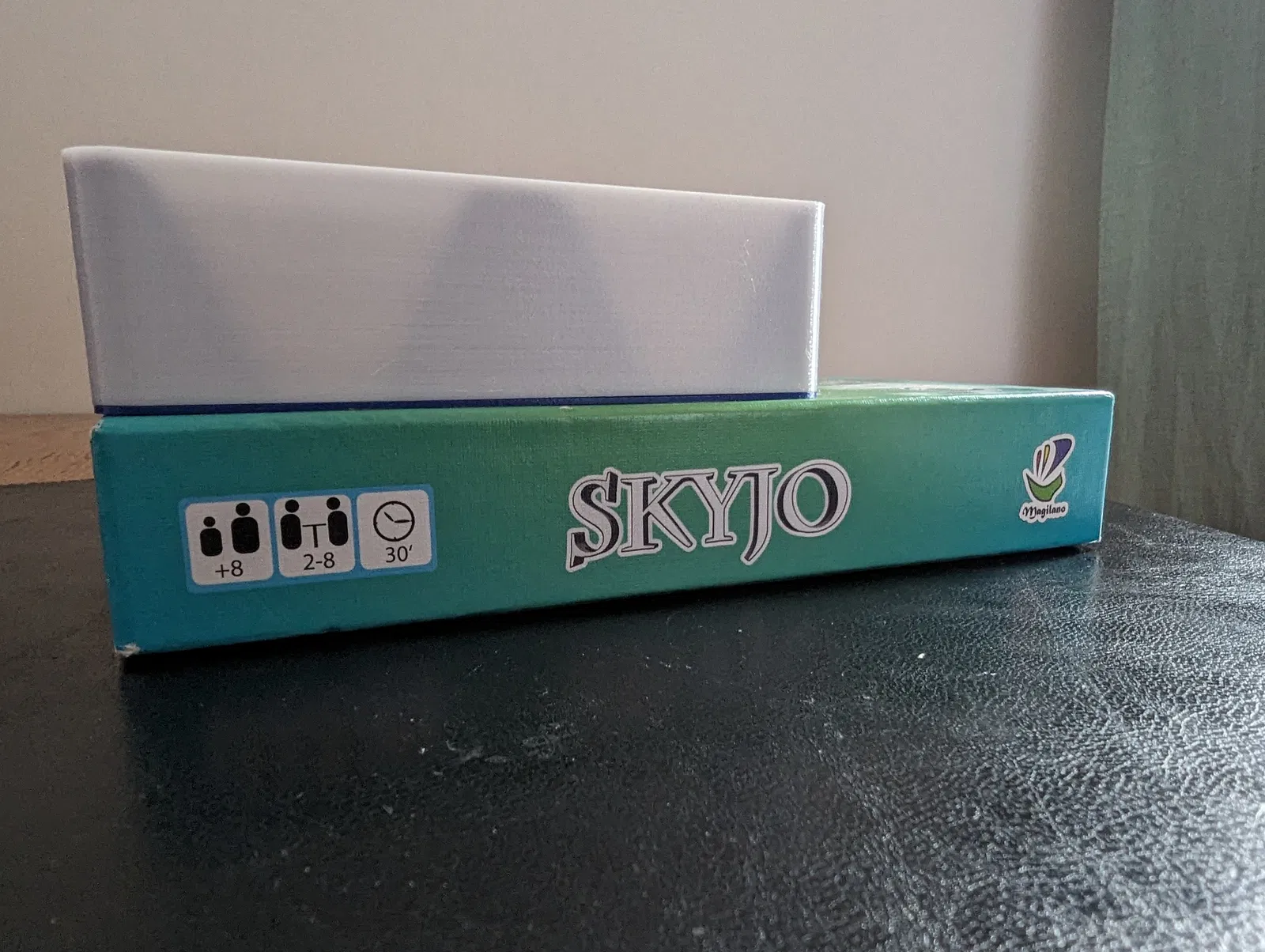 Hộp đựng du lịch Skyjo, in đơn giản, không cần support. Bản cập nhật có thêm đế đựng sổ ghi điểm, dày hơn bản gốc. Giữ mọi thứ gọn gàng khi di chuyển.
