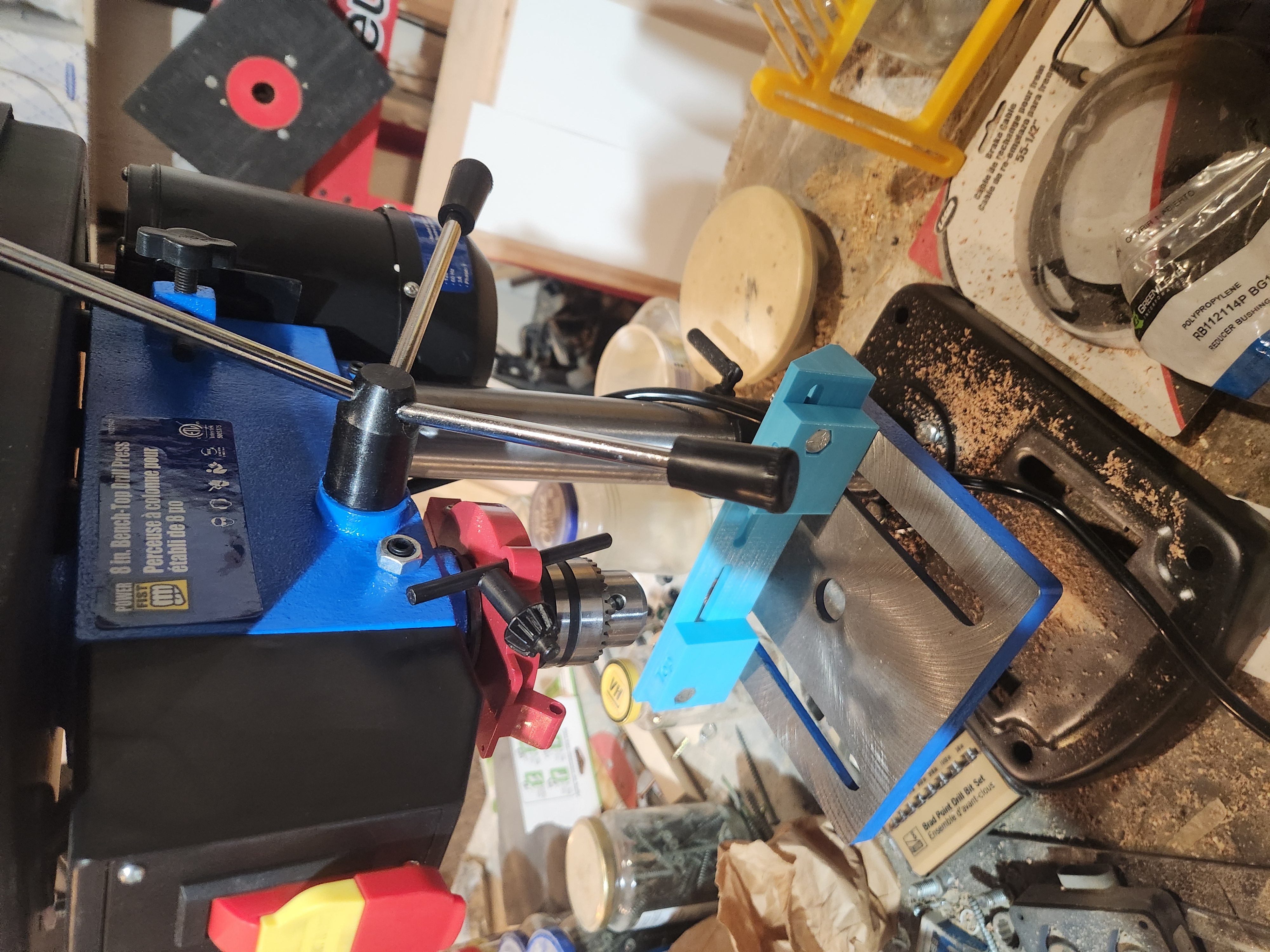 Tui có làm cái cữ cho máy khoan bàn này, chỉnh được hết cho hầu hết các loại máy khoan bàn luôn.